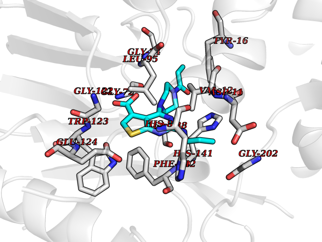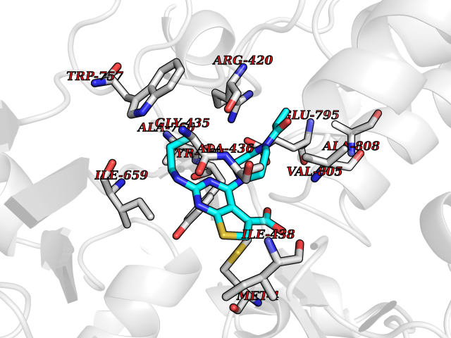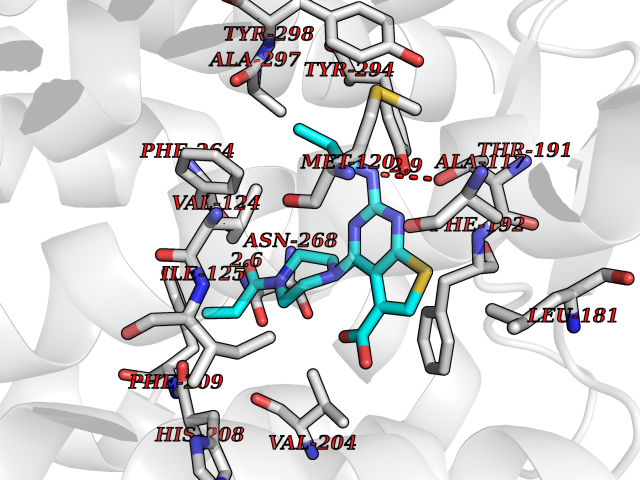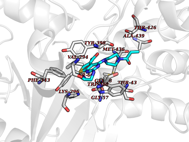 | Target general information Gen name thiO Organism Bacillus subtilis (strain 168) Uniprot ID TTD ID NA Synonyms goxB;yjbR;BSU11670 Protein family DAO family, ThiO subfamily Biochemical class Oxidoreductase Function FAD binding.Glycine oxidase activity.Oxidoreductase activity. Related diseases Hypervalinemia and hyperleucine-isoleucinemia (HVLI) [MIM:618850]: An autosomal recessive metabolic disorder characterized by highly elevated plasma concentrations of valine and leucine/isoleucine. Affected individuals suffer from headache and mild memory impairment. {ECO:0000269|PubMed:25653144}. The disease is caused by variants affecting the gene represented in this entry. A patient with hypervalinemia and hyperleucine-isoleucinemia was identified as compound heterozygote for Gln-170 (inherited from his father) and Lys-264 (inherited from his mother), both variants reduced the catalytic activity of the enzyme. After treatment with vitamin B6, a precursor of pyridoxal 5'-phosphate, a BCAT2 cofactor, the blood levels of branched chain amino acids, especially valine, were decreased and brain lesions were improved. {ECO:0000269|PubMed:25653144}. Drugs (DrugBank ID) DB02713; DB03147 Interacts with NA EC number 1.4.3.19 Uniprot keywords 3D-structure; Cytoplasm; FAD; Flavoprotein; Herbicide resistance; Oxidoreductase; Reference proteome; Thiamine biosynthesis Protein physicochemical properties Chain ID A,B,C,D Molecular weight (Da) 40395.8 Length 364 Aromaticity 0.1 Instability index 36.07 Isoelectric point 6.02 Charge (pH=7) -6.35 3D Binding mode Sequence MKRHYEAVVIGGGIIGSAIAYYLAKENKNTALFESGTMGGRTTSAAAGMLGAHAECEERDAFFDFAMHSQRLYKGLGEELYALSGVDIRQHNGGMFKLAFSEEDVLQLRQMDDLDSVSWYSKEEVLEKEPYASGDIFGASFIQDDVHVEPYFVCKAYVKAAKMLGAEIFEHTPVLHVERDGEALFIKTPSGDVWANHVVVASGVWSGMFFKQLGLNNAFLPVKGECLSVWNDDIPLTKTLYHDHCYIVPRKSGRLVVGATMKPGDWSETPDLGGLESVMKKAKTMLPAIQNMKVDRFWAGLRPGTKDGKPYIGRHPEDSRILFAAGHFRNGILLAPATGALISDLIMNKEVNQDWLHAFRIDRK Hydrogen bonds contact Hydrophobic contact | ||||