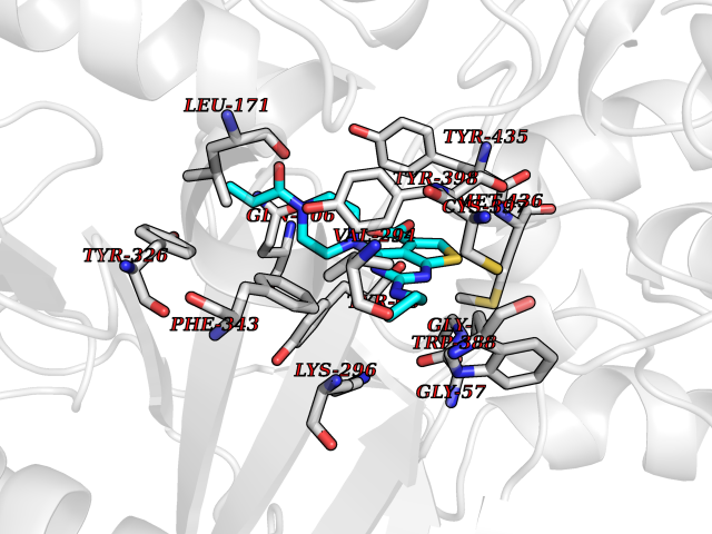 | Target general information Gen name MAOB Organism Homo sapiens (Human) Uniprot ID TTD ID Synonyms MAO-B; Amine oxidase [flavin-containing] B Protein family Flavin monoamine oxidase family Biochemical class CH-NH(2) donor oxidoreductase Function Catalyzes the oxidative deamination of biogenic and xenobiotic amines and has important functions in the metabolism of neuroactive and vasoactive amines in the central nervous system and peripheral tissues. MAOB preferentially degrades benzylamine and phenylethylamine. Related diseases Microvascular complications of diabetes 5 (MVCD5) [MIM:612633]: Pathological conditions that develop in numerous tissues and organs as a consequence of diabetes mellitus. They include diabetic retinopathy, diabetic nephropathy leading to end-stage renal disease, and diabetic neuropathy. Diabetic retinopathy remains the major cause of new-onset blindness among diabetic adults. It is characterized by vascular permeability and increased tissue ischemia and angiogenesis. Disease susceptibility is associated with variants affecting the gene represented in this entry. Homozygosity for the Leu-55 allele is strongly associated with the development of retinal disease in diabetic patients. Drugs (DrugBank ID) DB08176; DB02211; DB08516; DB08480; DB01472; DB04307; DB07512; DB07513; DB00915; DB00182; DB06698; DB04889; DB00215; DB09130; DB04147; DB00988; DB01363; DB00668; DB01175; DB02509; DB03147; DB14914; DB00614; DB04818; DB02095; DB01247; DB00601; DB01577; DB01442; DB01171; DB08082; DB02643; DB04677; DB03894; DB08804; DB04820; DB00184; DB04821; DB12612; DB01626; DB00780; DB00191; DB00388; DB01132; DB00721; DB01168; DB01367; DB09363; DB06654; DB01037; DB01104; DB14569; DB09042; DB00752; DB16446; DB09185; DB04832; DB00909 Interacts with P55212; P28329-3; Q8NI60; Q5RI15; Q92915-2; P22607; Q53GS7; P06396; P01112; O14901; P13473-2; P21397; Q9BVL2; O75400-2; P62826; Q6NTF9-3; Q9Y371; Q7Z699; Q9UMX0; Q9Y649 EC number EC 1.4.3.4 Uniprot keywords 3D-structure; Acetylation; Alternative splicing; Direct protein sequencing; FAD; Flavoprotein; Membrane; Mitochondrion; Mitochondrion outer membrane; Oxidoreductase; Proteomics identification; Reference proteome; Transmembrane; Transmembrane helix Protein physicochemical properties Chain ID A,B Molecular weight (Da) 56019.9 Length 494 Aromaticity 0.09 Instability index 34.81 Isoelectric point 6.51 Charge (pH=7) -2.2 3D Binding mode Sequence NKCDVVVVGGGISGMAAAKLLHDSGLNVVVLEARDRVGGRTYTLRNQKVKYVDLGGSYVGPTQNRILRLAKELGLETYKVNEVERLIHHVKGKSYPFRGPFPPVWNPITYLDHNNFWRTMDDMGREIPSDAPWKAPLAEEWDNMTMKELLDKLCWTESAKQLATLFVNLCVTAETHEVSALWFLWYVKQCGGTTRIISTTNGGQERKFVGGSGQVSERIMDLLGDRVKLERPVIYIDQTRENVLVETLNHEMYEAKYVISAIPPTLGMKIHFNPPLPMMRNQMITRVPLGSVIKCIVYYKEPFWRKKDYCGTMIIDGEEAPVAYTLDDTKPEGNYAAIMGFILAHKARKLARLTKEERLKKLCELYAKVLGSLEALEPVHYEEKNWCEEQYSGGCYTTYFPPGILTQYGRVLRQPVDRIYFAGTETATHWSGYMEGAVEAGERAAREILHAMGKIPEDEIWQSEPESVDVPAQPITTTFLERHLPSVPGLLRLI Hydrogen bonds contact Hydrophobic contact | ||||