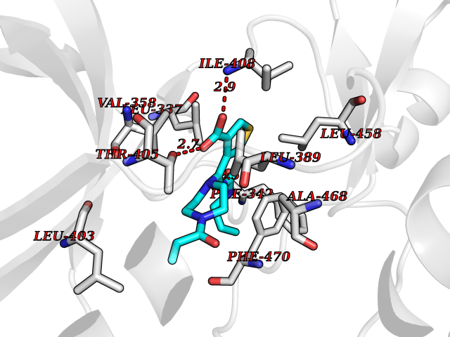 | Target general information Gen name Bact fabI Organism Escherichia coli (strain K12) Uniprot ID TTD ID Synonyms Enoyl[acylcarrierprotein] reductase [NADH] FabI; ENR of Mycobacterium tuberculosis Protein family Short-chain dehydrogenases/reductases (SDR) family, FabI subfamily Biochemical class Short-chain dehydrogenases reductase Function Catalyzes the reduction of a carbon-carbon double bond in an enoyl moiety that is covalently linked to an acyl carrier protein (ACP). Involved in the elongation cycle of fatty acid which are used in the lipid metabolism and in the biotin biosynthesis. Related diseases Pigmentary disorder, reticulate, with systemic manifestations, X-linked (PDR) [MIM:301220]: An X-linked recessive disorder characterized by recurrent infections and sterile inflammation in various organs. Diffuse skin hyperpigmentation with a distinctive reticulate pattern is universally evident by early childhood. This is later followed in many patients by hypohidrosis, corneal inflammation and scarring, enterocolitis that resembles inflammatory bowel disease, and recurrent urethral strictures. Melanin and amyloid deposition is present in the dermis. Affected males also have a characteristic facies with frontally upswept hair and flared eyebrows. Female carriers have only restricted pigmentary changes along Blaschko's lines. {ECO:0000269|PubMed:27019227}. The disease is caused by variants affecting the gene represented in this entry. XLPDR is caused by a recurrent intronic mutation that results in missplicing and reduced POLA1 expression. This leads to a decrease in cytosolic RNA:DNA hybrids and constitutive activation of type I interferon responses, but has no effect on cell replication. {ECO:0000269|PubMed:27019227}.; DISEASE: Van Esch-O'Driscoll syndrome (VEODS) [MIM:301030]: An X-linked recessive syndrome characterized by different degrees of intellectual disability, moderate to severe short stature, microcephaly, hypogonadism, and variable congenital malformations. {ECO:0000269|PubMed:31006512}. The disease is caused by variants affecting the gene represented in this entry. Drugs (DrugBank ID) DB04030; DB08265; DB01865; DB03534; DB03030; DB08605; DB02379; DB01691; DB08604 Interacts with P0AF90 EC number NA Uniprot keywords 3D-structure; Antibiotic resistance; Direct protein sequencing; Fatty acid biosynthesis; Fatty acid metabolism; Lipid biosynthesis; Lipid metabolism; NAD; Oxidoreductase; Reference proteome Protein physicochemical properties Chain ID A Molecular weight (Da) 27362 Length 258 Aromaticity 0.08 Instability index 21.64 Isoelectric point 5.57 Charge (pH=7) -4.81 3D Binding mode Sequence GFLSGKRILVTGVASKLSIAYGIAQAMHREGAELAFTYQNDKLKGRVEEFAAQLGSDIVLQCDVAEDASIDTMFAELGKVWPKFDGFVHSIGFAPGDQLDGDYVNAVTREGFKIAHDISSYSFVAMAKACRSMLNPGSALLTLSYLGAERAIPNYNVMGLAKASLEANVRYMANAMGPEGVRVNAISAGPIRTLAASGIKDFRKMLAHCEAVTPIRRTVTIEDVGNSAAFLCSDLSAGISGEVVHVDGGFSIAAMNEL Hydrogen bonds contact Hydrophobic contact | ||||