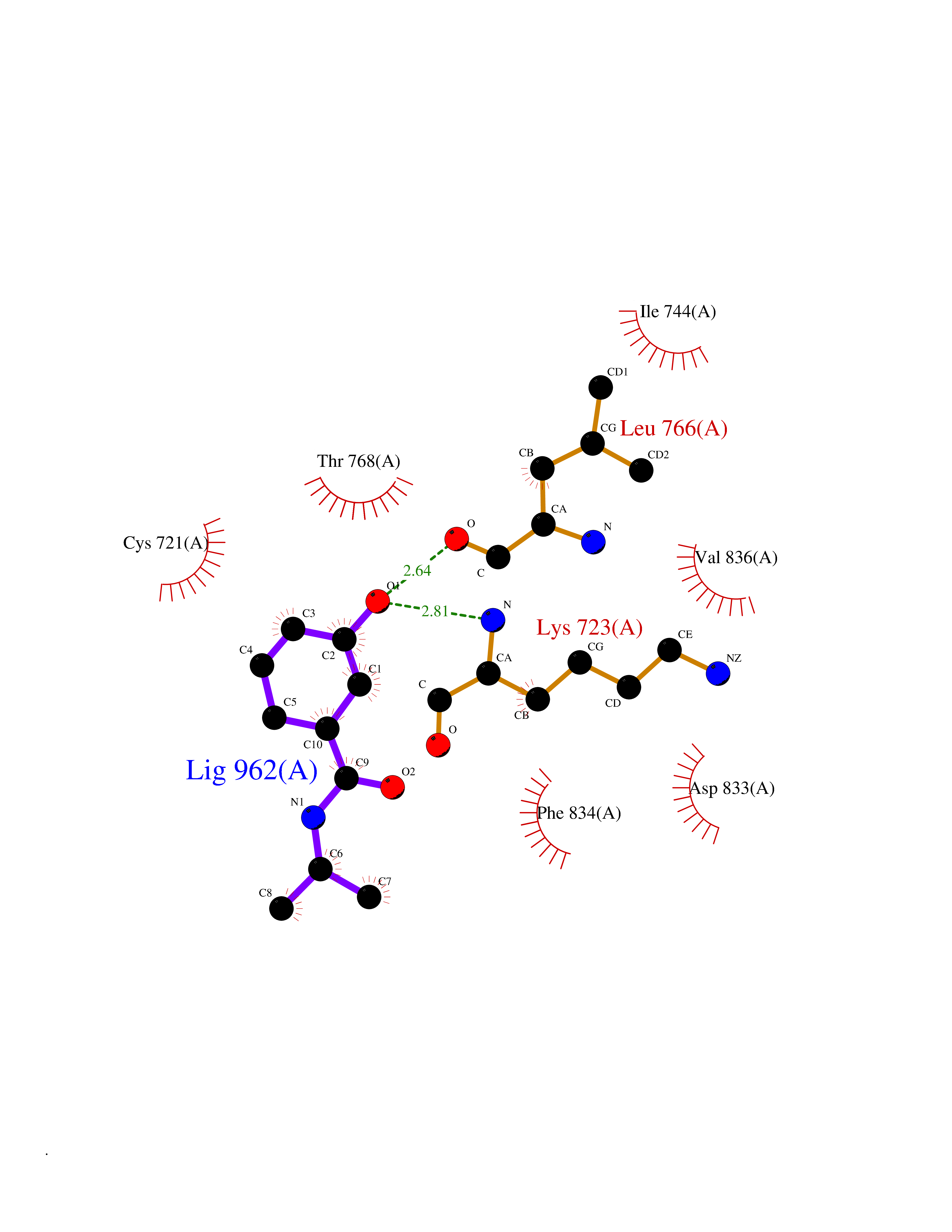 | Target general information Gen name MKNK1 Organism Homo sapiens (Human) Uniprot ID TTD ID Synonyms Mnk1; MAP kinase signal-integrating kinase 1 Protein family Protein kinase superfamily, CAMK Ser/Thr protein kinase family Biochemical class Protein kinase superfamily. CAMK Ser/Thr protein kinase family Function May play a role in the response to environmental stress and cytokines. Appears to regulate translation by phosphorylating EIF4E, thus increasing the affinity of this protein for the 7-methylguanosine-containing mRNA cap. Related diseases Defects in MELK are associated with some cancers, such as brain or breast cancers. Expression is dramatically increased in aggressive undifferentiated tumors, correlating with poor patient outcome in breast and brain cancers, suggesting a role in tumor-initiating cells and proliferation via its function in cell proliferation regulation. Drugs (DrugBank ID) DB12010 Interacts with P54253; Q03060-25; P42858; P28482; Q16539; Q96CV9 EC number EC 2.7.11.1 Uniprot keywords 3D-structure; Alternative splicing; ATP-binding; Cytoplasm; Kinase; Magnesium; Metal-binding; Nucleotide-binding; Nucleus; Phosphoprotein; Proteomics identification; Reference proteome; Serine/threonine-protein kinase; Transferase; Translation regulation Protein physicochemical properties Chain ID A Molecular weight (Da) 27536.2 Length 241 Aromaticity 0.11 Instability index 50.42 Isoelectric point 6.02 Charge (pH=7) -3.43 3D Binding mode Sequence PGKFEDMYKLTSELLGEGAYAKVQGAVSLQNGKEYAVKIIEKQAGHSRSRVFREVETLYQCQGNKNILELIEFFEDDTRFYLVFEKLQGGSILAHIQKQKHFNEREASRVVRDVAAALDFLHTKGIAHRDLKPENILCESPEKVSPVKICDFDLGSGYMAPEVVEVFTDQATFYDKRCDLWSLGVVLYIMLSGYPPFKYEFPDKDWAHISSEAKDLISKLLVRDAKQRLSAAQVLQHPWVQ Hydrogen bonds contact Hydrophobic contact | ||||