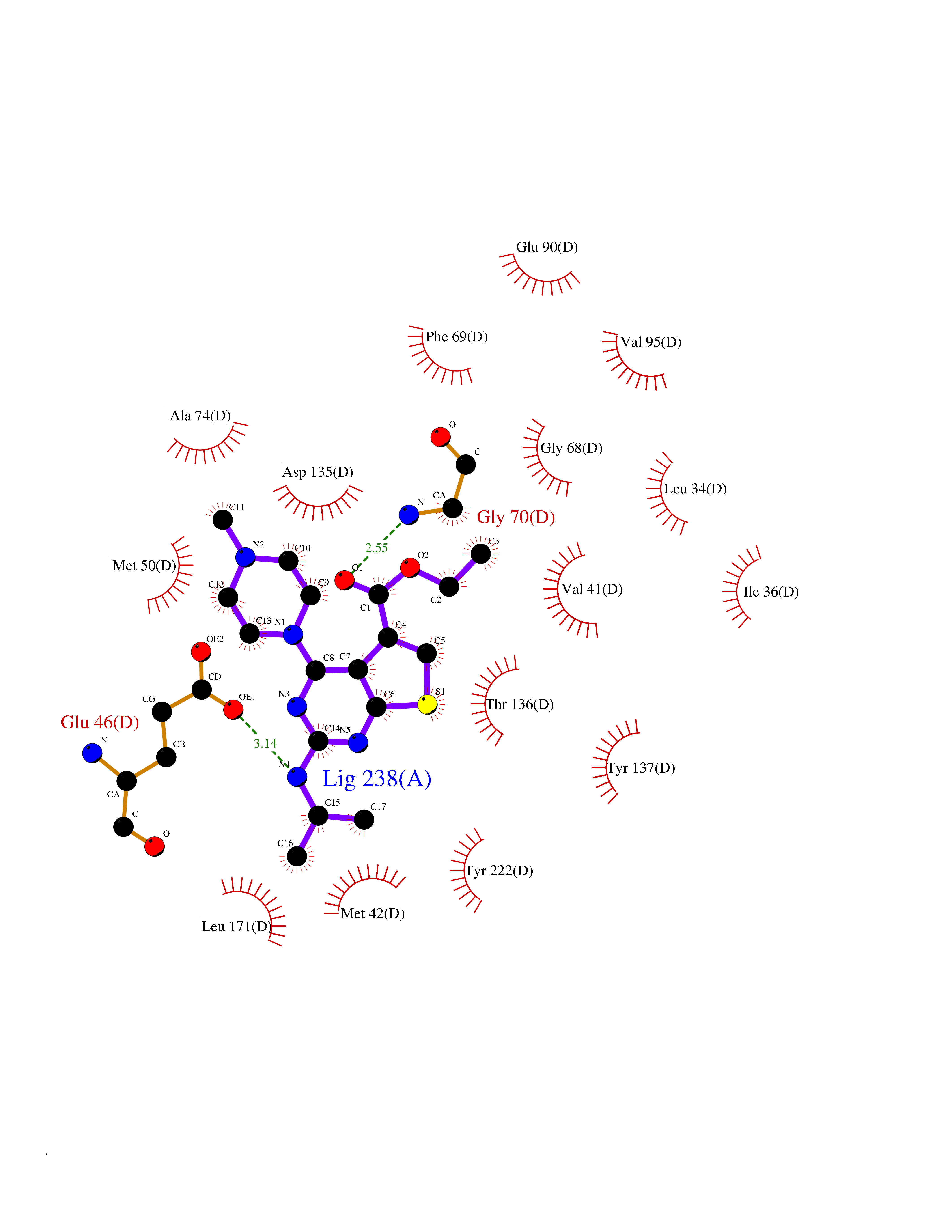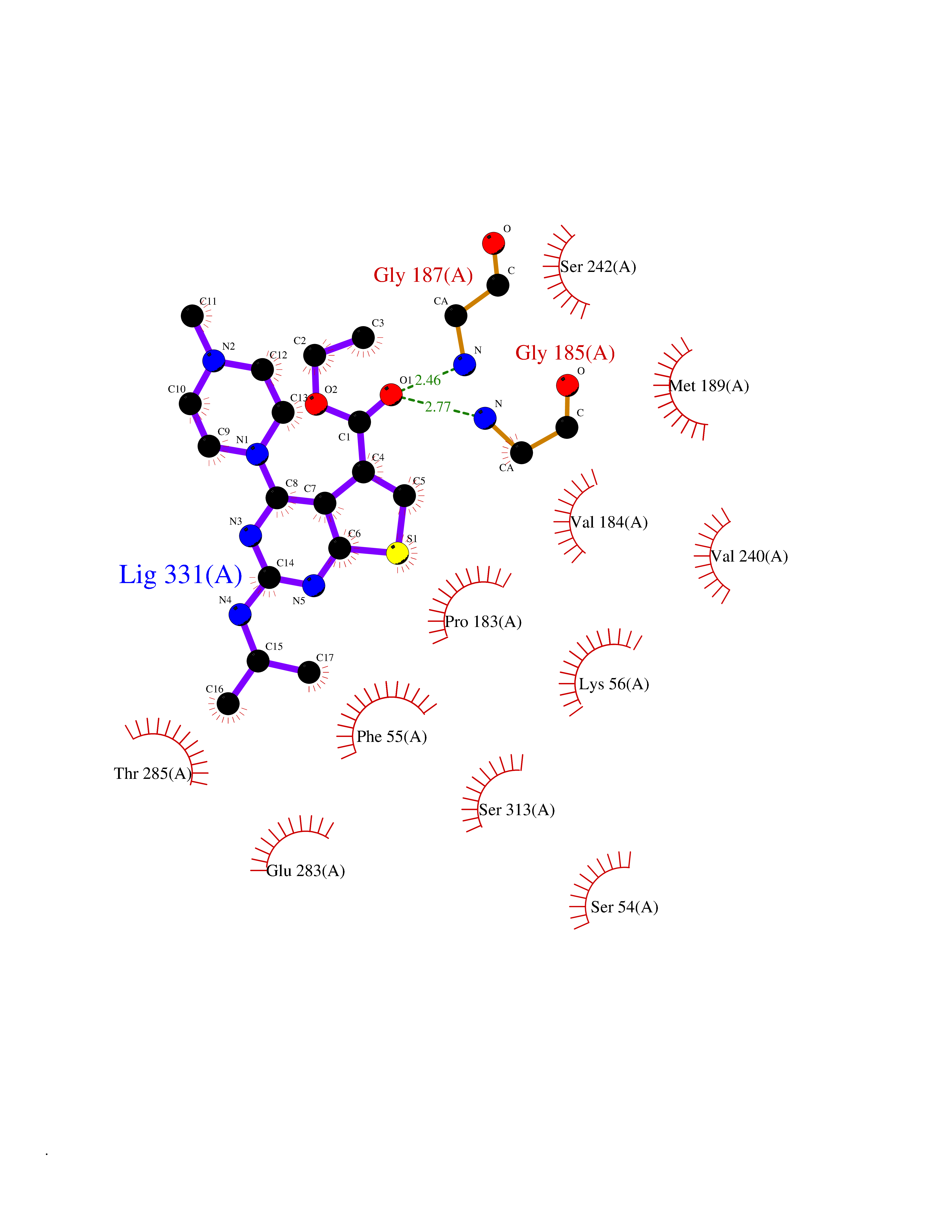Target general information Gen name Malaria Adss Organism Plasmodium falciparum Uniprot ID TTD ID Synonyms IMP--aspartate ligase; Adenylosuccinate synthase; AdSS; AMPSase Protein family Adenylosuccinate synthetase family Biochemical class Carbon-nitrogen ligase Function Plays an important role in the salvage pathway for purine nucleotide biosynthesis. Catalyzes the first committed step in the biosynthesis of AMP from IMP. Related diseases Hypertension and brachydactyly syndrome (HTNB) [MIM:112410]: A syndrome characterized by brachydactyly type E, severe salt-independent but age-dependent hypertension, an increased fibroblast growth rate, neurovascular contact at the rostral-ventrolateral medulla, and altered baroreflex blood pressure regulation. It results in death from stroke before age 50 years when untreated. Brachydactyly type E is characterized by shortening of the fingers mainly in the metacarpals and metatarsals. {ECO:0000269|PubMed:25961942}. The disease is caused by variants affecting the gene represented in this entry. Drugs (DrugBank ID) DB03510; DB04315; DB02109 Interacts with NA EC number EC 6.3.4.4 Uniprot keywords 3D-structure; Cytoplasm; GTP-binding; Ligase; Magnesium; Metal-binding; Nucleotide-binding; Purine biosynthesis Protein physicochemical properties Chain ID A Molecular weight (Da) 47877.9 Length 424 Aromaticity 0.09 Instability index 31.72 Isoelectric point 7.63 Charge (pH=7) 1.58 3D Binding mode Sequence GNVVAILGAQWGDEGKGKIIDMLSEYSDITCRFNGGANAGHTISVNDKKYALHLLPCGVLYDNNISVLGNGMVIHVKSLMEEIESVGGKLLDRLYLSNKAHILFDIHQIIDSIQETKKLKEGKQIGTTKRGIGPCYSTKASRIGIRLGTLKNFENFKNMYSKLIDHLMDLYNITEYDKEKELNLFYNYHIKLRDRIVDVISFMNTNLENNKKVLIEGANAAMLDIDFGTYPYVTSSCTTVGGVFSGLGIHHKKLNLVVGVVKSYLTRVGCGPFLTELNNDVGQYLREKGHEYGTTTKRPRRCGWLDIPMLLYVKCINSIDMINLTKLDVLSGLEEILLCVNFKNKKTGELLEKGCYPVEEEISEEYEPVYEKFSGWKEDISTCNEFDELPENAKKYILAIEKYLKTPIVWIGVGPNRKNMIVKK Hydrogen bonds contact Hydrophobic contact | ||||