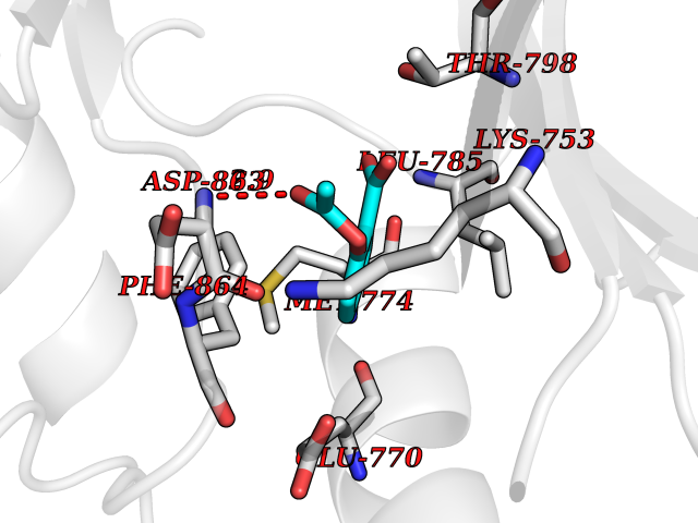 Target general information Gen name ERBB2 Organism Homo sapiens (Human) Uniprot ID TTD ID Synonyms p185erbB2; Tyrosine kinase-type cell surface receptor HER2; Receptor tyrosine-protein kinase erbB-2; Proto-oncogene c-ErbB-2; Proto-oncogene Neu; NGL; NEU; Metastatic lymph node gene 19 protein; MLN19 Protein family Protein kinase superfamily, Tyr protein kinase family, EGF receptor subfamily Biochemical class Kinase Function Protein tyrosine kinase that is part of several cell surface receptor complexes, but that apparently needs a coreceptor for ligand binding. Essential component of a neuregulin-receptor complex, although neuregulins do not interact with it alone. GP30 is a potential ligand for this receptor. Regulates outgrowth and stabilization of peripheral microtubules (MTs). Upon ERBB2 activation, the MEMO1-RHOA-DIAPH1 signaling pathway elicits the phosphorylation and thus the inhibition of GSK3B at cell membrane. This prevents the phosphorylation of APC and CLASP2, allowing its association with the cell membrane. In turn, membrane-bound APC allows the localization of MACF1 to the cell membrane, which is required for microtubule capture and stabilization. Related diseases Glioma (GLM) [MIM:137800]: Gliomas are benign or malignant central nervous system neoplasms derived from glial cells. They comprise astrocytomas and glioblastoma multiforme that are derived from astrocytes, oligodendrogliomas derived from oligodendrocytes and ependymomas derived from ependymocytes. {ECO:0000269|PubMed:15457249}. The gene represented in this entry is involved in disease pathogenesis.; DISEASE: Ovarian cancer (OC) [MIM:167000]: The term ovarian cancer defines malignancies originating from ovarian tissue. Although many histologic types of ovarian tumors have been described, epithelial ovarian carcinoma is the most common form. Ovarian cancers are often asymptomatic and the recognized signs and symptoms, even of late-stage disease, are vague. Consequently, most patients are diagnosed with advanced disease. {ECO:0000269|PubMed:15457249, ECO:0000269|PubMed:17344846}. The gene represented in this entry is involved in disease pathogenesis.; DISEASE: Lung cancer (LNCR) [MIM:211980]: A common malignancy affecting tissues of the lung. The most common form of lung cancer is non-small cell lung cancer (NSCLC) that can be divided into 3 major histologic subtypes: squamous cell carcinoma, adenocarcinoma, and large cell lung cancer. NSCLC is often diagnosed at an advanced stage and has a poor prognosis. {ECO:0000269|PubMed:15457249}. The gene represented in this entry is involved in disease pathogenesis.; DISEASE: Gastric cancer (GASC) [MIM:613659]: A malignant disease which starts in the stomach, can spread to the esophagus or the small intestine, and can extend through the stomach wall to nearby lymph nodes and organs. It also can metastasize to other parts of the body. The term gastric cancer or gastric carcinoma refers to adenocarcinoma of the stomach that accounts for most of all gastric malignant tumors. Two main histologic types are recognized, diffuse type and intestinal type carcinomas. Diffuse tumors are poorly differentiated infiltrating lesions, resulting in thickening of the stomach. In contrast, intestinal tumors are usually exophytic, often ulcerating, and associated with intestinal metaplasia of the stomach, most often observed in sporadic disease. {ECO:0000269|PubMed:15457249, ECO:0000269|PubMed:17344846}. The protein represented in this entry is involved in disease pathogenesis.; DISEASE: Chromosomal aberrations involving ERBB2 may be a cause gastric cancer. Deletions within 17q12 region producing fusion transcripts with CDK12, leading to CDK12-ERBB2 fusion leading to truncated CDK12 protein not in-frame with ERBB2. {ECO:0000269|PubMed:21097718}.; DISEASE: Visceral neuropathy, familial, 2, autosomal recessive (VSCN2) [MIM:619465]: An autosomal recessive disorder characterized by intestinal dysmotility due to aganglionosis (Hirschsprung disease), hypoganglionosis, and/or chronic intestinal pseudoobstruction. Patients also show peripheral axonal neuropathy, hypotonia, mild developmental delay, unilateral ptosis, and sensorineural hearing loss. {ECO:0000269|PubMed:33497358}. The disease is caused by variants affecting the gene represented in this entry. Drugs (DrugBank ID) DB08916; DB06021; DB12267; DB12010; DB04988; DB01259; DB14967; DB06366; DB11973; DB00072; DB05773; DB11652; DB05944; DB15035 Interacts with P00519; P42684; P15309; P60709; Q92625; O00213; O75815; Q9HB71; Q16543; Q9NSE2; Q7Z7G1; P46109; Q93034; Q99704; Q8TEW6; Q15075; P98172; P00533; P04626; P21860; Q15303; Q9UJM3; P09769; P06241; O75791; P62993; Q14451; P07900; P08238; P14625; P11021; P46940; P35568; Q08881; P23458; Q14974; Q96JA1; O75367; O75367-3; Q9UQF2; Q13387; P42679; Q9Y316; O43639; Q02297-7; O00750; P27986; O00459; Q92569; P19174; P16885; O95602; Q13882; Q06124; Q05209; Q99952; Q99952-1; P23467; P08575; Q12913; Q15262; Q16827; Q15256; P49792; P20936; O95980; Q9NP31; P29353; P98077; Q92529; Q9H6Q3; O15524; P12931; P42224; P40763; P31948; Q7KZ85; P43405; Q9Y490; Q63HR2; Q68CZ2; Q96D37; P52735; O14980; P62258 EC number EC 2.7.10.1 Uniprot keywords 3D-structure; Activator; Alternative initiation; Alternative splicing; ATP-binding; Cell membrane; Cell projection; Chromosomal rearrangement; Cytoplasm; Disease variant; Disulfide bond; Endosome; Glycoprotein; Kinase; Membrane; Nucleotide-binding; Nucleus; Phosphoprotein; Proteomics identification; Receptor; Reference proteome; Signal; Transcription; Transcription regulation; Transferase; Transmembrane; Transmembrane helix; Tyrosine-protein kinase Protein physicochemical properties Chain ID A,B Molecular weight (Da) 33776.1 Length 296 Aromaticity 0.08 Instability index 47.13 Isoelectric point 8.67 Charge (pH=7) 4.22 3D Binding mode Sequence APNQALLRILKETELRKVKVLGSGAFGTVYKGIWIPDGENVKIPVAIKVLRENTSPKANKEILDEAYVMAGVGSPYVSRLLGICLTSTVQLVTQLMPYGCLLDHVRENRGRLGSQDLLNWCMQIAKGMSYLEDVRLVHRDLAAR