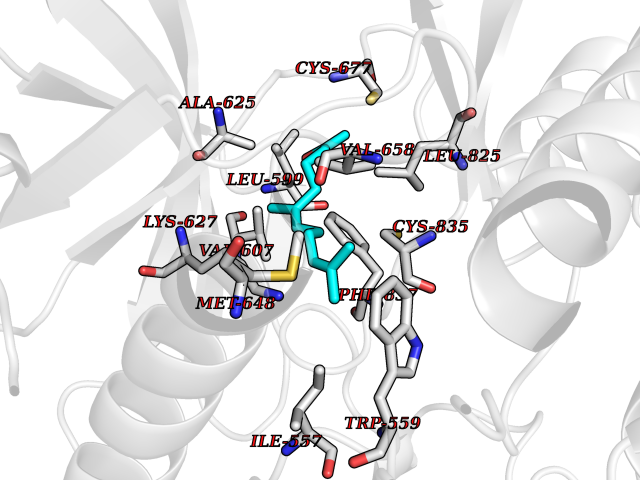 Target general information Gen name PDGFRA Organism Homo sapiens (Human) Uniprot ID TTD ID Synonyms RHEPDGFRA; Platelet-derived growth factor receptor 2; Platelet-derived growth factor alpha receptor; PDGFR2; PDGFR-alpha; PDGFR-2; PDGF-R-alpha; CD140a antigen; CD140a; CD140 antigen-like family membe Protein family Protein kinase superfamily, Tyr protein kinase family, CSF-1/PDGF receptor subfamily Biochemical class Kinase Function Depending on the context, promotes or inhibits cell proliferation and cell migration. Plays an important role in the differentiation of bone marrow-derived mesenchymal stem cells. Required for normal skeleton development and cephalic closure during embryonic development. Required for normal development of the mucosa lining the gastrointestinal tract, and for recruitment of mesenchymal cells and normal development of intestinal villi. Plays a role in cell migration and chemotaxis in wound healing. Plays a role in platelet activation, secretion of agonists from platelet granules, and in thrombin-induced platelet aggregation. Binding of its cognate ligands - homodimeric PDGFA, homodimeric PDGFB, heterodimers formed by PDGFA and PDGFB or homodimeric PDGFC -leads to the activation of several signaling cascades; the response depends on the nature of the bound ligand and is modulated by the formation of heterodimers between PDGFRA and PDGFRB. Phosphorylates PIK3R1, PLCG1, and PTPN11. Activation of PLCG1 leads to the production of the cellular signaling molecules diacylglycerol and inositol 1,4,5-trisphosphate, mobilization of cytosolic Ca(2+) and the activation of protein kinase C. Phosphorylates PIK3R1, the regulatory subunit of phosphatidylinositol 3-kinase, and thereby mediates activation of the AKT1 signaling pathway. Mediates activation of HRAS and of the MAP kinases MAPK1/ERK2 and/or MAPK3/ERK1. Promotes activation of STAT family members STAT1, STAT3 and STAT5A and/or STAT5B. Receptor signaling is down-regulated by protein phosphatases that dephosphorylate the receptor and its down-stream effectors, and by rapid internalization of the activated receptor. Tyrosine-protein kinase that acts as a cell-surface receptor for PDGFA, PDGFB and PDGFC and plays an essential role in the regulation of embryonic development, cell proliferation, survival and chemotaxis. Related diseases A chromosomal aberration involving PDGFRA is found in some cases of hypereosinophilic syndrome. Interstitial chromosomal deletion del(4)(q12q12) causes the fusion of FIP1L1 and PDGFRA (FIP1L1-PDGFRA). Mutations that cause overexpression and/or constitutive activation of PDGFRA may be a cause of hypereosinophilic syndrome. {ECO:0000269|PubMed:12808148}.; DISEASE: Gastrointestinal stromal tumor (GIST) [MIM:606764]: Common mesenchymal neoplasms arising in the gastrointestinal tract, most often in the stomach. They are histologically, immunohistochemically, and genetically different from typical leiomyomas, leiomyosarcomas, and schwannomas. Most GISTs are composed of a fairly uniform population of spindle-shaped cells. Some tumors are dominated by epithelioid cells or contain a mixture of spindle and epithelioid morphologies. Primary GISTs in the gastrointestinal tract commonly metastasize in the omentum and mesenteries, often as multiple nodules. However, primary tumors may also occur outside of the gastrointestinal tract, in other intra-abdominal locations, especially in the omentum and mesentery. {ECO:0000269|PubMed:12522257, ECO:0000269|PubMed:15928335}. The gene represented in this entry may be involved in disease pathogenesis. Mutations causing PDGFRA constitutive activation have been found in gastrointestinal stromal tumors lacking KIT mutations (PubMed:12522257). {ECO:0000269|PubMed:12522257}.; DISEASE: GIST-plus syndrome (GISTPS) [MIM:175510]: A disorder characterized by multiple mesenchymal tumors of the gastrointestinal tract, including gastrointestinal stromal tumor, inflammatory fibroid polyps, and fibroid tumors. Additional features are coarse facies and skin, broad hands and feet, and premature tooth loss. GISTPS is an autosomal dominant disease with incomplete penetrance. Gastrointestinal stromal tumor and inflammatory fibroid polyps may also occur in isolation. {ECO:0000269|PubMed:14699510, ECO:0000269|PubMed:17087943, ECO:0000269|PubMed:25975287}. The disease is caused by variants affecting the gene represented in this entry. Drugs (DrugBank ID) DB12742; DB00102; DB12147; DB10772; DB12010; DB00619; DB09078; DB06595; DB09079; DB06043; DB06589; DB08901; DB08896; DB14840; DB01268; DB11800; DB05146 Interacts with P46108; P46109; P00533; Q8N6L0; P04085; P01127; Q9NRA1; P31947; P62258; Q9NRA1-1; A8T7D5; P05067; Q8IY26 EC number EC 2.7.10.1 Uniprot keywords 3D-structure; Alternative splicing; ATP-binding; Cell membrane; Cell projection; Chemotaxis; Developmental protein; Disease variant; Disulfide bond; Glycoprotein; Golgi apparatus; Host-virus interaction; Immunoglobulin domain; Kinase; Membrane; Nucleotide-binding; Phosphoprotein; Proteomics identification; Proto-oncogene; Receptor; Reference proteome; Repeat; Signal; Transferase; Transmembrane; Transmembrane helix; Tyrosine-protein kinase; Ubl conjugation Protein physicochemical properties Chain ID A Molecular weight (Da) 39294.8 Length 345 Aromaticity 0.11 Instability index 46.74 Isoelectric point 6.6 Charge (pH=7) -1.38 3D Binding mode Sequence RYEIRWRVIESISPDGHEYIYVDPMQLPYDSRWEFPRDGLVLGRVLGSGAFGKVVEGTAYGLSRSQPVMKVAVKMLKPTARSSEKQALMSELKIMTHLGPHLNIVNLLGACTKSGPIYIITEYCFYGDLVNYLHKNRDSFLSHSMLDSEVKNLLSDDNSEGLTLLDLLSFTYQVARGMEFLASKNCVHRDLAARNVLLAQGKIVKICDFGLARDIMHDSNYVSKGSTFLPVKWMAPESIFDNLYTTLSDVWSYGILLWEIFSLGGTPYPGMMVDSTFYNKIKSGYRMAKPDHATSEVYEIMVKCWNSEPEKRPSFYHLSEIVENLLPGQYKKSYEKIHLDFLKSD Hydrogen bonds contact Hydrophobic contact | ||||