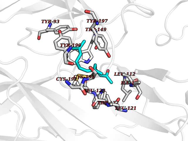 Target general information Gen name CHRNB4 Organism Homo sapiens (Human) Uniprot ID TTD ID Synonyms CHRNB4; Beta-4 nAChR Protein family Ligand-gated ion channel (TC 1.A.9) family, Acetylcholine receptor (TC 1.A.9.1) subfamily, Beta-4/CHRNB4 sub-subfamily Biochemical class Neurotransmitter receptor Function After binding acetylcholine, the AChR responds by an extensive change in conformation that affects all subunits and leads to opening of an ion-conducting channel across the plasma membrane. Related diseases Renal cell carcinoma (RCC) [MIM:144700]: Renal cell carcinoma is a heterogeneous group of sporadic or hereditary carcinoma derived from cells of the proximal renal tubular epithelium. It is subclassified into clear cell renal carcinoma (non-papillary carcinoma), papillary renal cell carcinoma, chromophobe renal cell carcinoma, collecting duct carcinoma with medullary carcinoma of the kidney, and unclassified renal cell carcinoma. Clear cell renal cell carcinoma is the most common subtype. {ECO:0000269|PubMed:20054297, ECO:0000269|PubMed:23622243, ECO:0000269|PubMed:23792563, ECO:0000269|PubMed:25728682}. The disease may be caused by variants affecting the gene represented in this entry. Defects of SETD2 are associated with loss of DNA methylation at non-promoter regions (PubMed:23792563). SETD2 defects lead to aberrant and reduced nucleosome compaction and chromatin association of key replication proteins, such as MCM7 and DNA polymerase delta, leading to hinder replication fork progression and prevent loading of RAD51 homologous recombination repair factor at DNA breaks (PubMed:25728682). {ECO:0000269|PubMed:23792563, ECO:0000269|PubMed:25728682}.; DISEASE: Luscan-Lumish syndrome (LLS) [MIM:616831]: An autosomal dominant syndrome with a variable phenotype. Clinical features include macrocephaly, distinctive facial appearance, postnatal overgrowth, various degrees of learning difficulties, autism spectrum disorder, and intellectual disability. {ECO:0000269|PubMed:23160955, ECO:0000269|PubMed:24852293, ECO:0000269|PubMed:26084711, ECO:0000269|PubMed:27317772}. The disease may be caused by variants affecting the gene represented in this entry.; DISEASE: Leukemia, acute lymphoblastic (ALL) [MIM:613065]: A subtype of acute leukemia, a cancer of the white blood cells. ALL is a malignant disease of bone marrow and the most common malignancy diagnosed in children. The malignant cells are lymphoid precursor cells (lymphoblasts) that are arrested in an early stage of development. The lymphoblasts replace the normal marrow elements, resulting in a marked decrease in the production of normal blood cells. Consequently, anemia, thrombocytopenia, and neutropenia occur to varying degrees. The lymphoblasts also proliferate in organs other than the marrow, particularly the liver, spleen, and lymphnodes. {ECO:0000269|PubMed:24509477, ECO:0000269|PubMed:24662245}. The disease may be caused by variants affecting distinct genetic loci, including the gene represented in this entry.; DISEASE: Leukemia, acute myelogenous (AML) [MIM:601626]: A subtype of acute leukemia, a cancer of the white blood cells. AML is a malignant disease of bone marrow characterized by maturational arrest of hematopoietic precursors at an early stage of development. Clonal expansion of myeloid blasts occurs in bone marrow, blood, and other tissue. Myelogenous leukemias develop from changes in cells that normally produce neutrophils, basophils, eosinophils and monocytes. {ECO:0000269|PubMed:16314571, ECO:0000269|PubMed:24509477}. The disease may be caused by variants affecting distinct genetic loci, including the gene represented in this entry.; DISEASE: Intellectual developmental disorder, autosomal dominant 70 (MRD70) [MIM:620157]: An autosomal dominant disorder characterized by mild global developmental delay, moderately impaired intellectual disability with speech difficulties, and behavioral abnormalities. {ECO:0000269|PubMed:32710489}. The disease is caused by variants affecting the gene represented in this entry.; DISEASE: Rabin-Pappas syndrome (RAPAS) [MIM:620155]: An autosomal dominant neurodevelopmental disorder characterized by severely impaired global development, intellectual disability, microcephaly, facial dysmorphism, and variable congenital anomalies affecting the skeletal, genitourinary, cardiac, and other organ systems. {ECO:0000269|PubMed:32710489}. The disease is caused by variants affecting the gene represented in this entry. Drugs (DrugBank ID) DB00237; DB00565; DB00514; DB07720; DB00898; DB00472; DB01227; DB00184; DB01090; DB00202 Interacts with Q6FHY5 EC number NA Uniprot keywords 3D-structure; Alternative splicing; Cell membrane; Disulfide bond; Glycoprotein; Ion channel; Ion transport; Ligand-gated ion channel; Membrane; Postsynaptic cell membrane; Proteomics identification; Receptor; Reference proteome; Signal; Synapse; Transmembrane; Transmembrane helix; Transport Protein physicochemical properties Chain ID A,B Molecular weight (Da) 89661.2 Length 775 Aromaticity 0.12 Instability index 35.11 Isoelectric point 6.07 Charge (pH=7) -5.67 3D Binding mode Sequence SEAEHRLFERLFEDYNEIIRPVANVSDPVIIHFEVSMSQLVKVDEVNQIMETNLWLKQIWNDYKLKWNPSDYGGAEFMRVPAQKIWKPDIVLYNNAVGDFQVDDKTKALLKYTGEVTWIPPAIFKSSCKIDVTYFPFDYQNCTMKFGSWSYDKAKIDLVLIGSSMNLKDYWESGEWAIIKAPGYKHDIKYNCCEEIYPDITYSLYIRRLPLFYTINLIIPCLLISFLTVLVFYLPSDCGEKVTLCISVLLSLTVFLLVITETIPSTSLVIPLIGEYLLFTMIFVTLSIVITVFVLNVHYRTPTTHTMPSWVKTVFLNLLPRVMFMTRIKEAIQSVKYIAENMKAQNEAKEIQDDWKYVAMVIDRIFLWVFTLVCILGTAGLFLQPLMRVANAEEKLMDDLLNKTRYNNLIRPATSSSQLISIKLQLSLAQLISVNEREQIMTTNVWLKQEWTDYRLTWNSSRYEGVNILRIPAKRIWLPDIVLYNNADGTYEVSVYTNLIVRSNGSVLWLPPAIYKSACKIEVKYFPFDQQNCTLKFRSWTYDHTEIDMVLMTPTASMDDFTPSGEWDIVALPGRRTVNPQDPSYVDVTYDFIIKRKPLFYTINLIIPCVLTTLLAILVFYLPSDCGEKMTLCISVLLALTFFLLLISKIVPPTSLDVPLIGKYLMFTMVLVTFSIVTSVCVLNVHHRSPSTHTMAPWVKRCFLHKLPTFLFMKRRQDVQEALEGVSFIAQHMKNDDEDQSVVEDWKYVAMVVDRLFLWVFMFVCVLGTVGLFLP Hydrogen bonds contact Hydrophobic contact | ||||