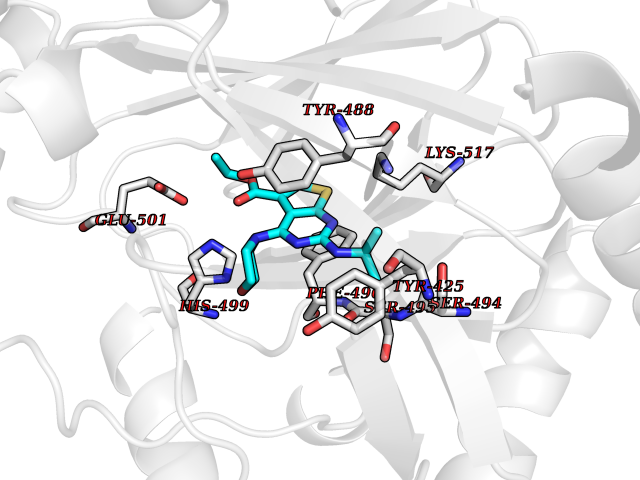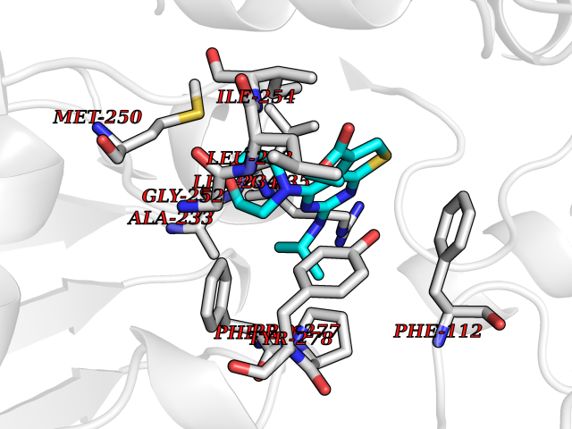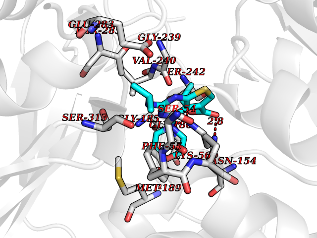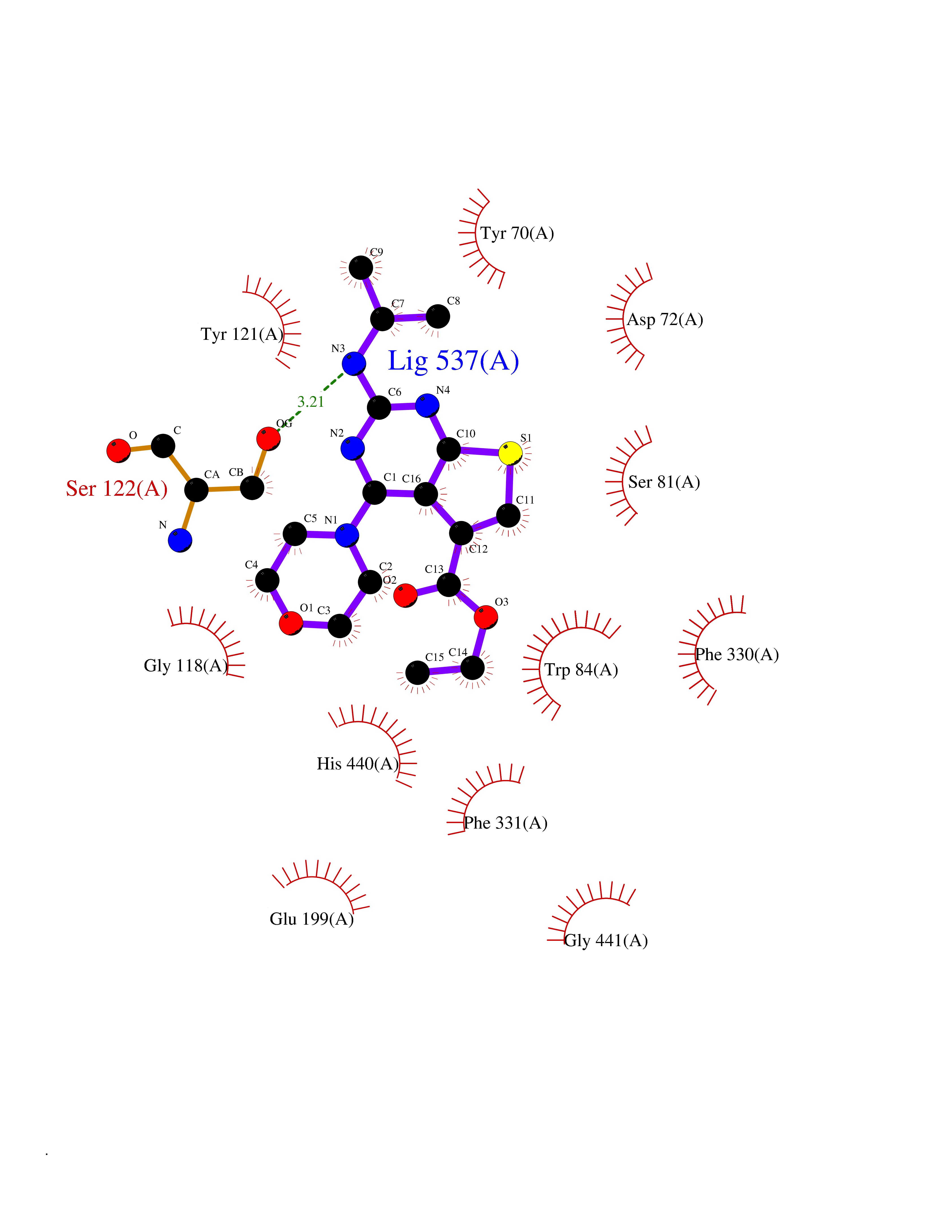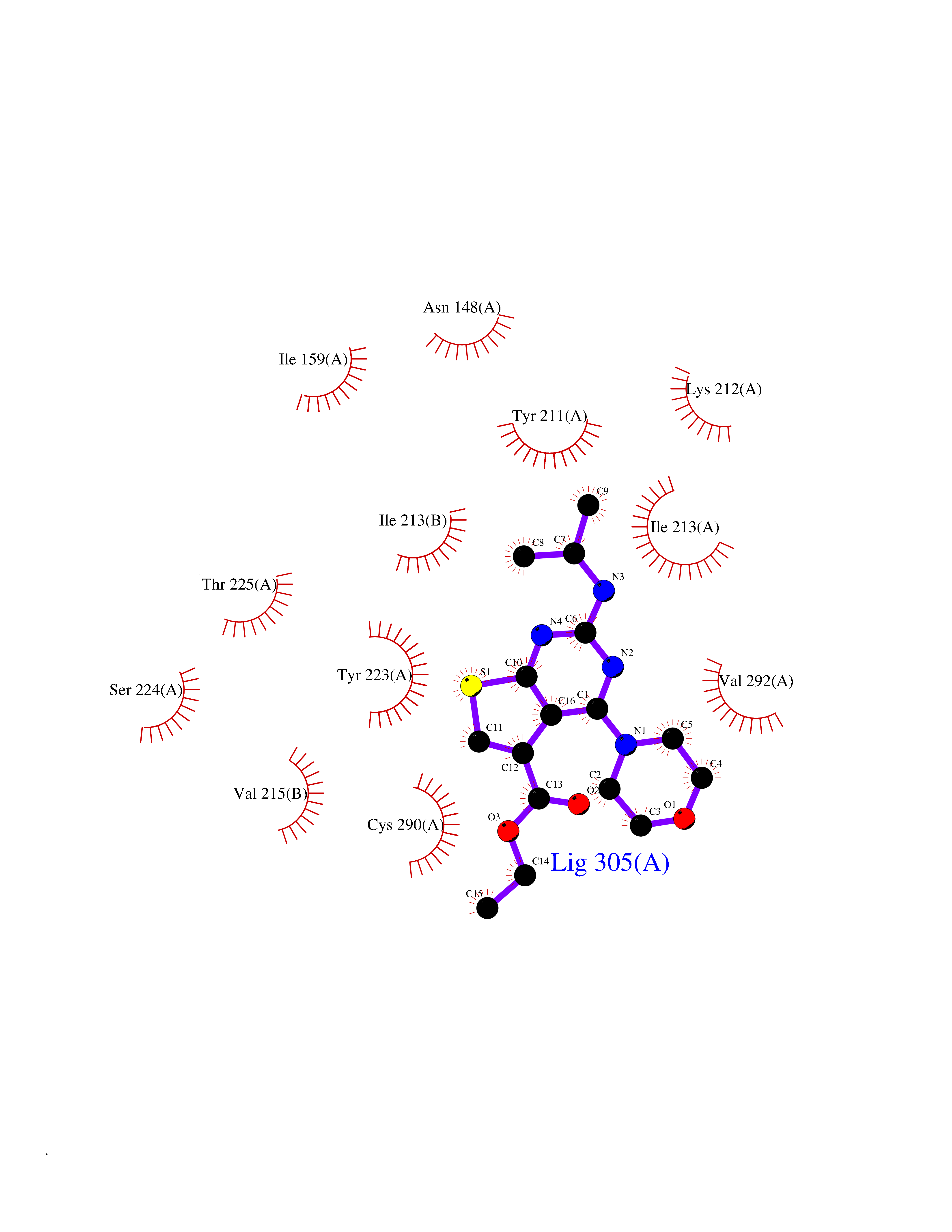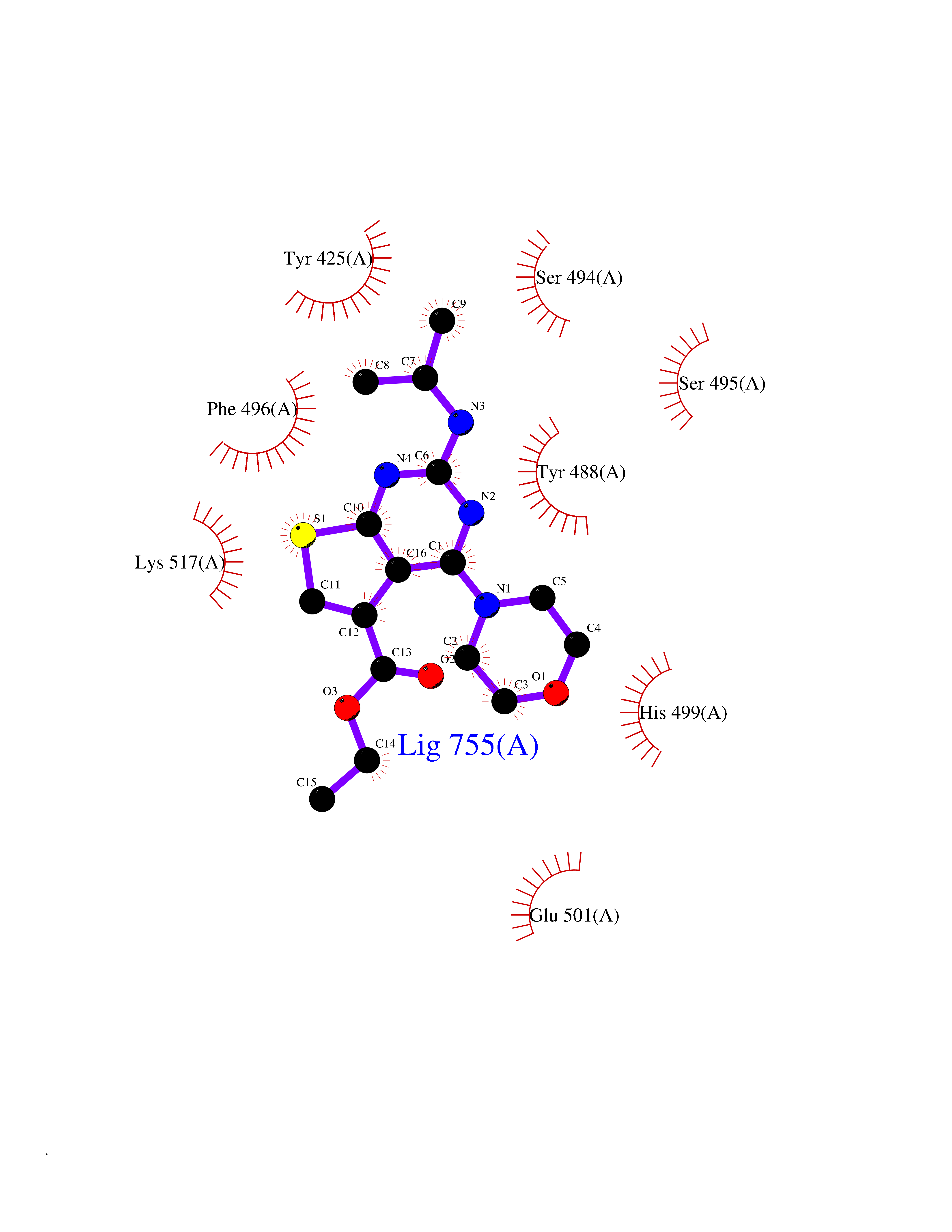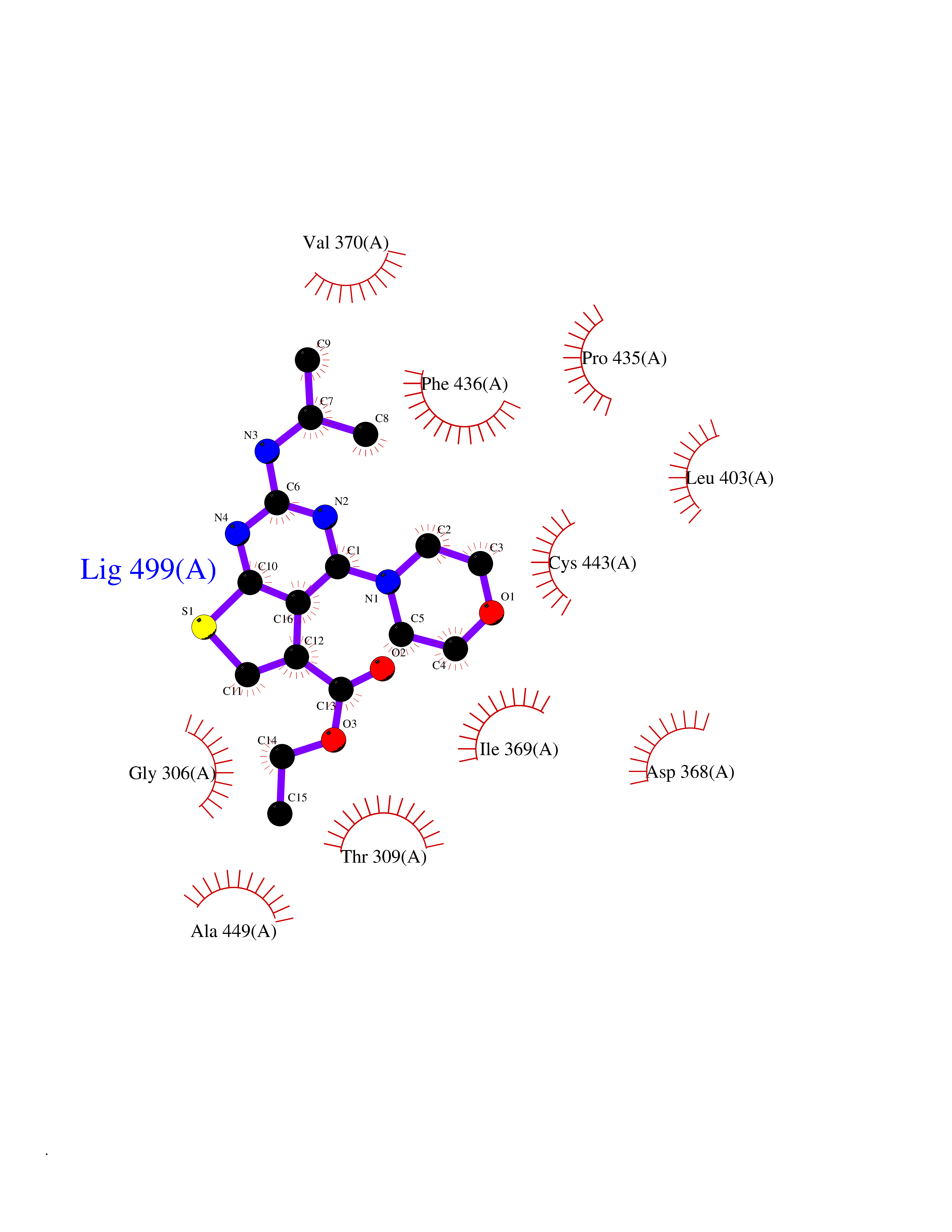 | Target general information Gen name ache Organism Tetronarce californica (Pacific electric ray) (Torpedo californica) Uniprot ID TTD ID NA Synonyms NA Protein family Type-B carboxylesterase/lipase family Biochemical class NA Function Terminates signal transduction at the neuromuscular junction by rapid hydrolysis of the acetylcholine released into the synaptic cleft. May be involved in cell-cell interactions. Related diseases Noonan syndrome 5 (NS5) [MIM:611553]: A form of Noonan syndrome, a disease characterized by short stature, facial dysmorphic features such as hypertelorism, a downward eyeslant and low-set posteriorly rotated ears, and a high incidence of congenital heart defects and hypertrophic cardiomyopathy. Other features can include a short neck with webbing or redundancy of skin, deafness, motor delay, variable intellectual deficits, multiple skeletal defects, cryptorchidism, and bleeding diathesis. Individuals with Noonan syndrome are at risk of juvenile myelomonocytic leukemia, a myeloproliferative disorder characterized by excessive production of myelomonocytic cells. {ECO:0000269|PubMed:17603482, ECO:0000269|PubMed:17603483, ECO:0000269|PubMed:20683980}. The disease is caused by variants affecting the gene represented in this entry.; DISEASE: LEOPARD syndrome 2 (LPRD2) [MIM:611554]: A disorder characterized by lentigines, electrocardiographic conduction abnormalities, ocular hypertelorism, pulmonic stenosis, abnormalities of genitalia, retardation of growth, and sensorineural deafness. {ECO:0000269|PubMed:17603483}. The disease is caused by variants affecting the gene represented in this entry.; DISEASE: Cardiomyopathy, dilated, 1NN (CMD1NN) [MIM:615916]: A disorder characterized by ventricular dilation and impaired systolic function, resulting in congestive heart failure and arrhythmia. Patients are at risk of premature death. {ECO:0000269|PubMed:24777450}. The disease is caused by variants affecting the gene represented in this entry. Drugs (DrugBank ID) NA Interacts with NA EC number 3.1.1.7 Uniprot keywords 3D-structure; Alternative splicing; Cell membrane; Direct protein sequencing; Disulfide bond; Glycoprotein; GPI-anchor; Hydrolase; Lipoprotein; Membrane; Neurotransmitter degradation; Serine esterase; Signal; Synapse Protein physicochemical properties Chain ID A Molecular weight (Da) 59779.2 Length 529 Aromaticity 0.12 Instability index 48.49 Isoelectric point 5.8 Charge (pH=7) -8.48 3D Binding mode Sequence SELLVNTKSGKVMGTRVPVLSSHISAFLGIPFAEPPVGNMRFRRPEPKKPWSGVWNASTYPNNCQQYVDEQFPGFSGSEMWNPNREMSEDCLYLNIWVPSPRPKSTTVMVWIYGGGFYSGSSTLDVYNGKYLAYTEEVVLVSLSYRVGAFGFLALHGSQEAPGNVGLLDQRMALQWVHDNIQFFGGDPKTVTIFGESAGGASVGMHILSPGSRDLFRRAILQSGSPNCPWASVSVAEGRRRAVELGRNLNCNLNSDEELIHCLREKKPQELIDVEWNVLPFDSIFRFSFVPVIDGEFFPTSLESMLNSGNFKKTQILLGVNKDEGSFFLLYGAPGFSKDSESKISREDFMSGVKLSVPHANDLGLDAVTLQYTDWMDDNNGIKNRDGLDDIVGDHNVICPLMHFVNKYTKFGNGTYLYFFNHRASNLVWPEWMGVIHGYEIEFVFGLPLVKELNYTAEEEALSRRIMHYWATFAKTGNPNEPESKWPLFTTKEQKFIDLNTEPMKVHQRLRVQMCVFWNQFLPKLLNAT Hydrogen bonds contact Hydrophobic contact | ||||