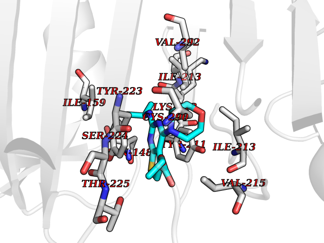 | Target general information Gen name TRBC1 Organism Homo sapiens (Human) Uniprot ID TTD ID Synonyms TCRBC1; BV05S1J2.2 Protein family NA Biochemical class NA Function Alpha-beta T cell receptors are antigen specific receptors which are essential to the immune response and are present on the cell surface of T lymphocytes. Recognize peptide-major histocompatibility (MH) (pMH) complexes that are displayed by antigen presenting cells (APC), a prerequisite for efficient T cell adaptive immunity against pathogens. Binding of alpha-beta TR to pMH complex initiates TR-CD3 clustering on the cell surface and intracellular activation of LCK that phosphorylates the ITAM motifs of CD3G, CD3D, CD3E and CD247 enabling the recruitment of ZAP70. In turn, ZAP70 phosphorylates LAT, which recruits numerous signaling molecules to form the LAT signalosome. The LAT signalosome propagates signal branching to three major signaling pathways, the calcium, the mitogen-activated protein kinase (MAPK) kinase and the nuclear factor NF-kappa-B (NF-kB) pathways, leading to the mobilization of transcription factors that are critical for gene expression and essential for T cell growth and differentiation. The T cell repertoire is generated in the thymus, by V-(D)-J rearrangement. This repertoire is then shaped by intrathymic selection events to generate a peripheral T cell pool of self-MH restricted, non-autoaggressive T cells. Post-thymic interaction of alpha-beta TR with the pMH complexes shapes TR structural and functional avidity. Constant region of T cell receptor (TR) alpha chain. Related diseases Immunodeficiency 57 with autoinflammation (IMD57) [MIM:618108]: An autosomal recessive primary immunodeficiency characterized by lymphopenia and recurrent viral, bacterial, and fungal infections. Patients exhibit early-onset inflammatory bowel disease involving the upper and lower gastrointestinal tract, and develop progressive polyarthritis. {ECO:0000269|PubMed:30026316}. The disease is caused by variants affecting the gene represented in this entry. RIPK1-deficient immune cells from IMD57 patients have impaired proinflammatory signaling leading to dysregulated cytokine secretion and are prone to necroptosis. {ECO:0000269|PubMed:30026316}.; DISEASE: Autoinflammation with episodic fever and lymphadenopathy (AIEFL) [MIM:618852]: An autosomal dominant immunologic disorder characterized by early onset of recurrent episodes of unexplained fever, lymphadenopathy, hepatosplenomegaly, and increased levels of inflammatory cytokines and chemokines in patient serum. {ECO:0000269|PubMed:31827280, ECO:0000269|PubMed:31827281}. The disease is caused by variants affecting the gene represented in this entry. Drugs (DrugBank ID) DB02740 Interacts with NA EC number NA Uniprot keywords 3D-structure; Adaptive immunity; Cell membrane; Disulfide bond; Glycoprotein; Immunity; Immunoglobulin domain; Membrane; Proteomics identification; Receptor; Reference proteome; T cell receptor; Transmembrane; Transmembrane helix Protein physicochemical properties Chain ID C,B,A Molecular weight (Da) 84668.2 Length 736 Aromaticity 0.13 Instability index 39.96 Isoelectric point 5.8 Charge (pH=7) -14.36 3D Binding mode Sequence IQRPPKIQVYSRHPPNYLNCYVYGFHPPQIEIDLLKIKSEQSDLSFSKDWSFYLLSHATPNSKDQYSCRVKHVTLEQPRIVKWDRTHSLRYFRLGISEIPEFISAGYVDSHPITMYNSVSQLKEPRALWMEENLAPDHWERYTQLLRGWQQMFKVELKQLQHHYNHSGFHTYQRMIGCELLEDGSITGFLQYAYDGQDFLIFNKDTLSWMAMDNVADIIRRVWEANQHELLYQKNWLEEECIAWLKRFLEYGKDALQRTEPPKVRVNHKTTLYCRAYGFYPPEISINWMKNGEEIFQDTDYGGILPSGDGTYQTWVSVELGDIYSCHVEHGGVHMVLQGFQQNIDQPTEMTATEGAIVQINCTYQTSGFNGLFWYQQHAGEAPTFLSYNVLDGLEEKGRFSSFLSRSKGYSYLLLKELQMKDSASYLCAVKDSNYQLIWGAGTKLIIKPNIQNPDPAVYQLRDSKSSDKSVCLFTDFDKDSDVYITDKKSNSAVAWSNAGVTQTPKFQVLKTGQSMTLQCAQDMNHNSMYWYRQDPGMGLRLIYYSASEGTTDKGEVPNGYNVSRLNKREFSLRLESAAPSQTSVYFCASSVWTGEGSGELFFGEGSRLTVLEDLKNVFPPEVAVFEPSEAEISHTQKATLVCLATGFYPDHVELSWWVNGKEVHSGVCTDPQPLKEQPALNDSRYALSSRLRVSATFWQNPRNHFRCQVQFYGLSENDEWKPVTQIVSAEAWGRA Hydrogen bonds contact Hydrophobic contact | ||||