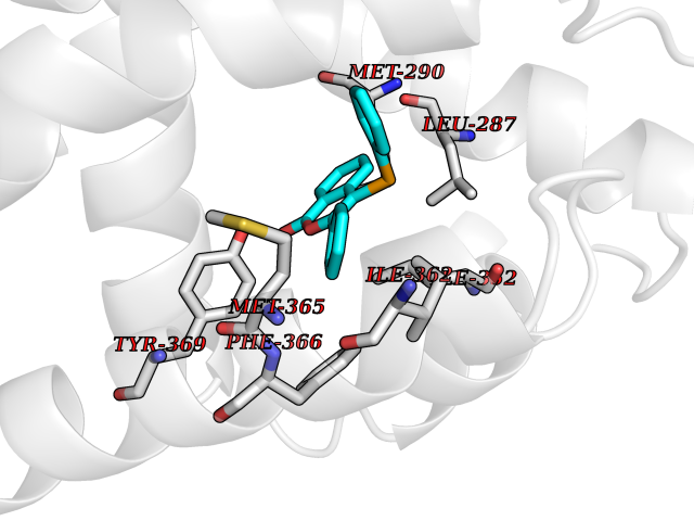 Target general information Gen name THRB Organism Homo sapiens (Human) Uniprot ID TTD ID Synonyms c-erbA-beta; c-erbA-2; THR1; Nuclear receptor subfamily 1 group A member 2; NR1A2; ERBA2 Protein family Nuclear hormone receptor family, NR1 subfamily Biochemical class Nuclear hormone receptor Function High affinity receptor for thyroid hormones, including triiodothyronine and thyroxine. Nuclear hormone receptor that can act as a repressor or activator of transcription. Related diseases Thyroid hormone resistance, generalized, autosomal dominant (GRTHD) [MIM:188570]: An autosomal dominant disease characterized by high levels of circulating thyroid hormones (T3-T4), goiter, abnormal mental functions, increased susceptibility to infections, abnormal growth and bone maturation, tachycardia and deafness. Affected individuals may also have attention deficit-hyperactivity disorders (ADHD) and language difficulties. Patients have normal or slightly elevated thyroid stimulating hormone (TSH). {ECO:0000269|PubMed:10660344, ECO:0000269|PubMed:12511610, ECO:0000269|PubMed:12554782, ECO:0000269|PubMed:1314846, ECO:0000269|PubMed:1324420, ECO:0000269|PubMed:1563081, ECO:0000269|PubMed:1587388, ECO:0000269|PubMed:1619012, ECO:0000269|PubMed:1661299, ECO:0000269|PubMed:16804041, ECO:0000269|PubMed:1846005, ECO:0000269|PubMed:19268523, ECO:0000269|PubMed:2153155, ECO:0000269|PubMed:2510172, ECO:0000269|PubMed:7833659, ECO:0000269|PubMed:8175986, ECO:0000269|PubMed:8514853, ECO:0000269|PubMed:8664910, ECO:0000269|PubMed:8889584}. The disease is caused by variants affecting the gene represented in this entry.; DISEASE: Thyroid hormone resistance, generalized, autosomal recessive (GRTHR) [MIM:274300]: An autosomal recessive disorder characterized by goiter, clinical euthyroidism, end-organ unresponsiveness to thyroid hormone, abnormal growth and bone maturation, and deafness. Patients also have high levels of circulating thyroid hormones, with elevated thyroid stimulating hormone. {ECO:0000269|PubMed:1653889}. The disease is caused by variants affecting the gene represented in this entry.; DISEASE: Selective pituitary thyroid hormone resistance (PRTH) [MIM:145650]: Variant form of thyroid hormone resistance and is characterized by clinical hyperthyroidism, with elevated free thyroid hormones, but inappropriately normal serum TSH. Unlike GRTH, where the syndrome usually segregates with a dominant allele, the mode of inheritance in PRTH has not been established. {ECO:0000269|PubMed:7528740, ECO:0000269|PubMed:8381821}. The disease is caused by variants affecting the gene represented in this entry. Drugs (DrugBank ID) DB08085; DB03181; DB02106; DB01118; DB00509; DB05035; DB03788; DB03176; DB00451; DB00279; DB01583; DB05192; DB07425; DB09100; DB03604 Interacts with Q60974; Q9Y618 EC number NA Uniprot keywords 3D-structure; Alternative splicing; Deafness; Disease variant; DNA-binding; Metal-binding; Nucleus; Proteomics identification; Receptor; Reference proteome; Transcription; Transcription regulation; Zinc; Zinc-finger Protein physicochemical properties Chain ID A,B Molecular weight (Da) 27235.4 Length 239 Aromaticity 0.09 Instability index 43.29 Isoelectric point 5.42 Charge (pH=7) -8.55 3D Binding mode Sequence KPEPTDEEWELIKTVTEAHVATNAQWKQKRKFLPEDIGQAKVDLEAFSHFTKIITPAITRVVDFAKKLPMFCELPCEDQIILLKGCCMEIMSLRAAVRYDPESETLTLNGEMAVTRGQLKNGGLGVVSDAIFDLGMSLSSFNLDDTEVALLQAVLLMSSDRPGLACVERIEKYQDSFLLAFEHYINYRKHHVTHFWPKLLMKVTDLRMIGACHASRFLHMKVECPTELFPPLFLEVFED Hydrogen bonds contact Hydrophobic contact | ||||