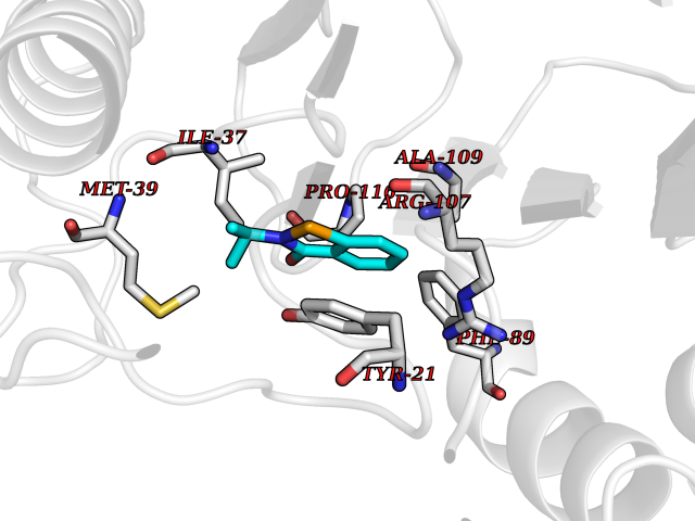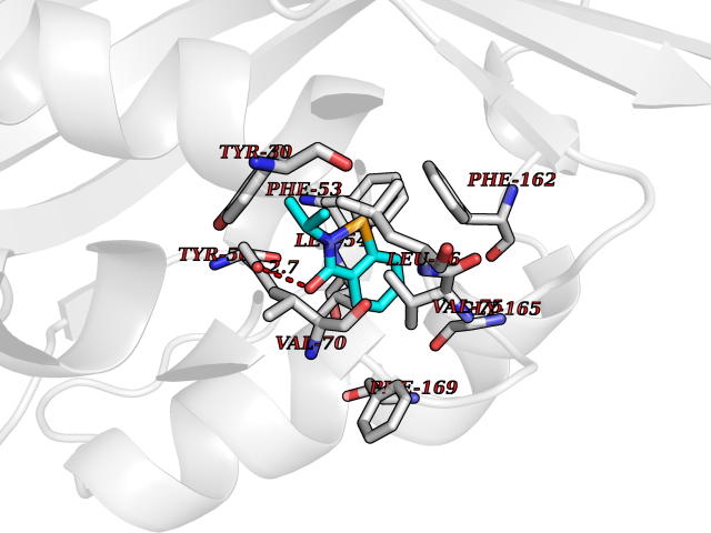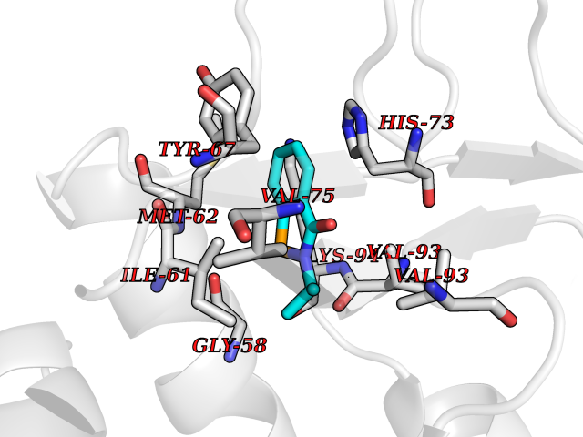 Target general information Gen name Fung SDH1 Organism Pyricularia oryzae (strain 70-15 / ATCC MYA-4617 / FGSC 8958) (Rice blast fungus) (Magnaporthe oryzae) Uniprot ID TTD ID Synonyms SDH1 Protein family Scytalone dehydratase family Biochemical class Alpha-carbonic anhydrase Function Catalyzes two steps in melanin biosynthesis. From scytalone they are two dehydration steps and one reduction step to yield melanin. Related diseases CODAS syndrome (CODASS) [MIM:600373]: A rare syndrome characterized by the combination of cerebral, ocular, dental, auricular, and skeletal features. These include developmental delay, craniofacial anomalies, cataracts, ptosis, median nasal groove, delayed tooth eruption, hearing loss, short stature, delayed epiphyseal ossification, metaphyseal hip dysplasia, and vertebral coronal clefts. {ECO:0000269|PubMed:25574826, ECO:0000269|PubMed:25808063}. The disease is caused by variants affecting the gene represented in this entry. Drugs (DrugBank ID) NA Interacts with NA EC number EC 4.2.1.94 Uniprot keywords 3D-structure; Calcium; Direct protein sequencing; Endosome; Lyase; Melanin biosynthesis; Metal-binding; Reference proteome Protein physicochemical properties Chain ID A Molecular weight (Da) 19102.4 Length 162 Aromaticity 0.14 Instability index 31.72 Isoelectric point 5.87 Charge (pH=7) -3.7 3D Binding mode Sequence GEITFSDYLGLMTCVYEWADSYDSKDWDRLRKVIAPTLRIDYRSFLDKLWEAMPAEEFVGMVSSKQVLGDPTLRTQHFIGGTRWEKVSEDEVIGYHQLRVPHQRYKDTTMKEVTMKGHAHSANLHWYKKIDGVWKFAGLKPDIRWGEFDFDRIFEDGRETFG Hydrogen bonds contact Hydrophobic contact | ||||