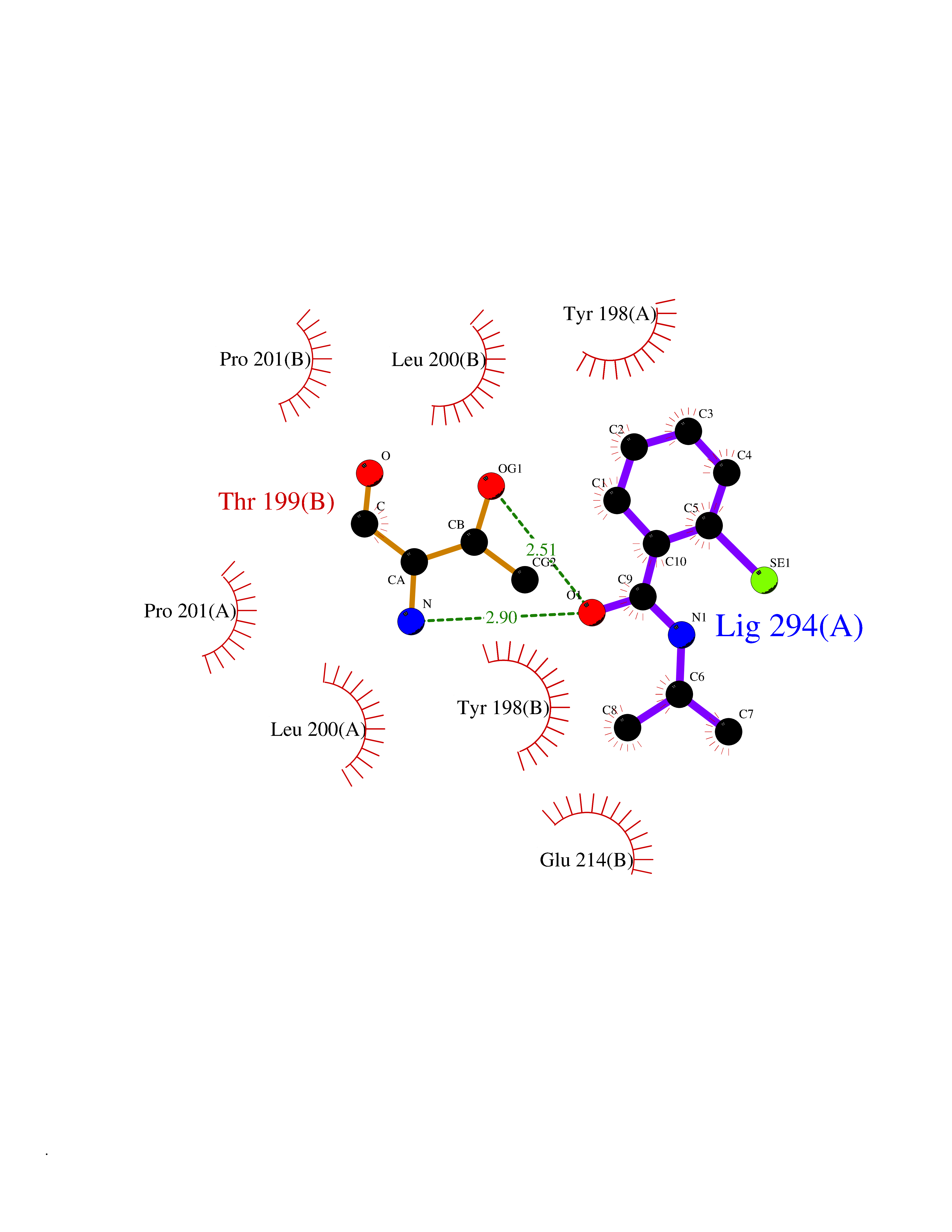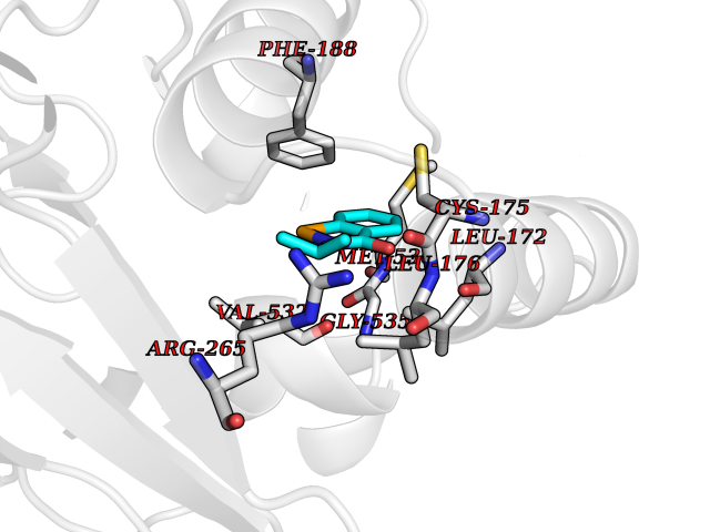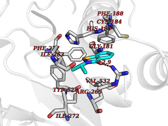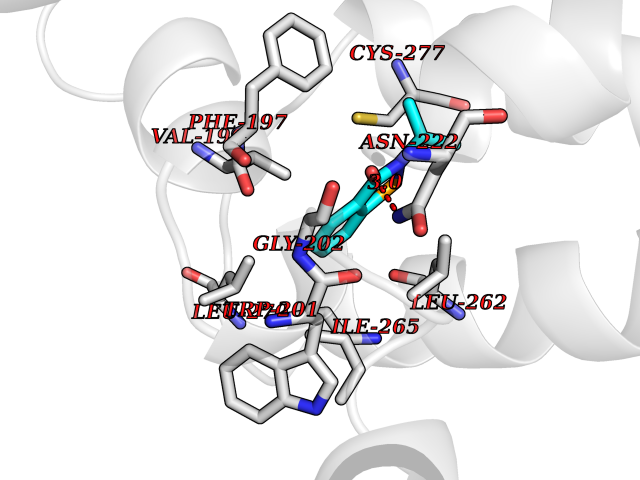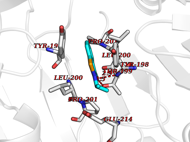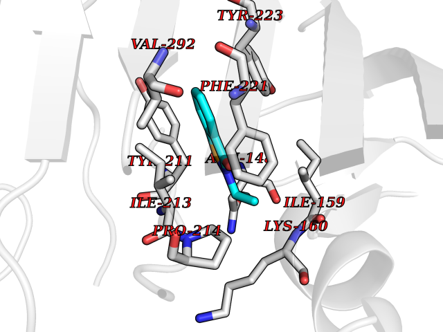 Target general information Gen name cpo Organism Kitasatospora aureofaciens (Streptomyces aureofaciens) Uniprot ID TTD ID NA Synonyms cpoT Protein family AB hydrolase superfamily, Bacterial non-heme haloperoxidase / perhydrolase family Biochemical class Haloperoxidase Function Chloride peroxidase activity. Related diseases Hypervalinemia and hyperleucine-isoleucinemia (HVLI) [MIM:618850]: An autosomal recessive metabolic disorder characterized by highly elevated plasma concentrations of valine and leucine/isoleucine. Affected individuals suffer from headache and mild memory impairment. {ECO:0000269|PubMed:25653144}. The disease is caused by variants affecting the gene represented in this entry. A patient with hypervalinemia and hyperleucine-isoleucinemia was identified as compound heterozygote for Gln-170 (inherited from his father) and Lys-264 (inherited from his mother), both variants reduced the catalytic activity of the enzyme. After treatment with vitamin B6, a precursor of pyridoxal 5'-phosphate, a BCAT2 cofactor, the blood levels of branched chain amino acids, especially valine, were decreased and brain lesions were improved. {ECO:0000269|PubMed:25653144}. Drugs (DrugBank ID) DB03793 Interacts with NA EC number 1.11.1.- Uniprot keywords 3D-structure; Chloride; Oxidoreductase; Peroxidase Protein physicochemical properties Chain ID A,B Molecular weight (Da) 60428.4 Length 554 Aromaticity 0.13 Instability index 31.26 Isoelectric point 4.65 Charge (pH=7) -32.72 3D Binding mode Sequence PFITVGQENSTSIDLYYEDHGAGQPVVLIHGFPLSGHSWERQSAALLDAGYRVITYDRRGFGQSSQPTTGYDYDTFAADLNTVLETLDLQDAVLVGFSMGTGEVARYVSSYGTARIAKVAFLASLEPFLLKTDDNPDGAAPKEFFDGIVAAVKADRYAFYTGFFNDFYNLDENLGTRISEEAVRNSWNTAASGGFFAAAAAPTTWYTDFRADIPRIDVPALILHGTGDRTLPIENTARVFHKALPSAEYVEVEGAPHGLLWTHAEEVNTALLAFLAKPFITVGQENSTSIDLYYEDHGAGQPVVLIHGFPLSGHSWERQSAALLDAGYRVITYDRRGFGQSSQPTTGYDYDTFAADLNTVLETLDLQDAVLVGFSMGTGEVARYVSSYGTARIAKVAFLASLEPFLLKTDDNPDGAAPKEFFDGIVAAVKADRYAFYTGFFNDFYNLDENLGTRISEEAVRNSWNTAASGGFFAAAAAPTTWYTDFRADIPRIDVPALILHGTGDRTLPIENTARVFHKALPSAEYVEVEGAPHGLLWTHAEEVNTALLAFLAK Hydrogen bonds contact Hydrophobic contact | ||||