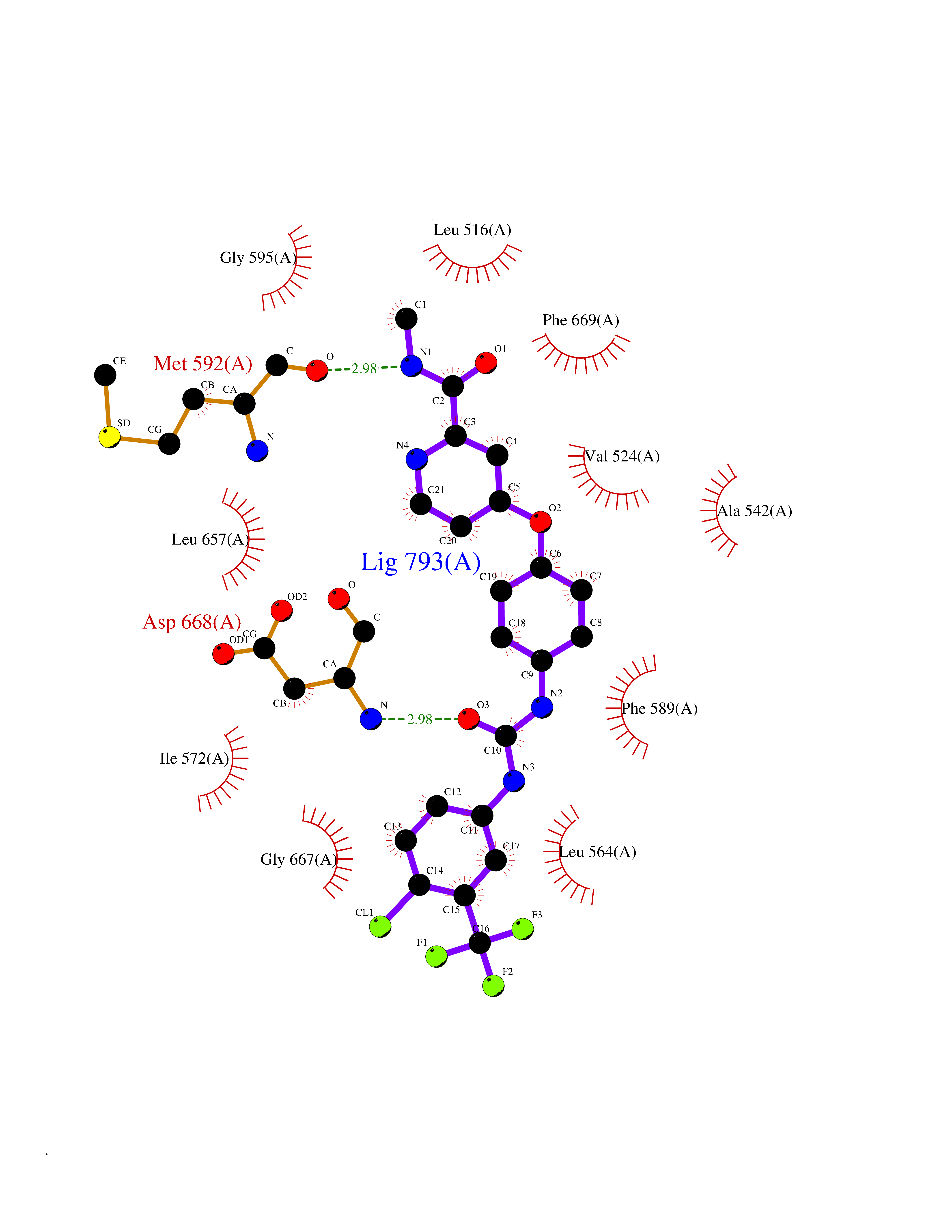 Target general information Gen name DDR1 Organism Homo sapiens (Human) Uniprot ID TTD ID Synonyms Tyrosine-protein kinase CAK; Tyrosine kinase DDR; TRKE; TRK E; RTK6; Protein-tyrosine kinase RTK-6; Protein-tyrosine kinase 3A; PTK3A; NTRK4; NEP; Mammary carcinoma kinase 10; MCK-10; HGK2; Epithelial Protein family Protein kinase superfamily, Tyr protein kinase family, Insulin receptor subfamily Biochemical class Kinase Function Collagen binding triggers a signaling pathway that involves SRC and leads to the activation of MAP kinases. Regulates remodeling of the extracellular matrix by up-regulation of the matrix metalloproteinases MMP2, MMP7 and MMP9, and thereby facilitates cell migration and wound healing. Required for normal blastocyst implantation during pregnancy, for normal mammary gland differentiation and normal lactation. Required for normal ear morphology and normal hearing. Promotes smooth muscle cell migration, and thereby contributes to arterial wound healing. Also plays a role in tumor cell invasion. Phosphorylates PTPN11. Tyrosine kinase that functions as cell surface receptor for fibrillar collagen and regulates cell attachment to the extracellular matrix, remodeling of the extracellular matrix, cell migration, differentiation, survival and cell proliferation. Related diseases Combined oxidative phosphorylation deficiency 33 (COXPD33) [MIM:617713]: An autosomal recessive disorder caused by multiple mitochondrial respiratory chain defects and impaired mitochondrial energy metabolism. Clinical manifestations are highly variable. Affected infants present with cardiomyopathy accompanied by multisystemic features involving liver, kidney, and brain. Death in infancy is observed in some patients. Children and adults present with myopathy and progressive external ophthalmoplegia. {ECO:0000269|PubMed:28942965}. The disease is caused by variants affecting the gene represented in this entry. Drugs (DrugBank ID) DB12010; DB00619; DB15822 Interacts with Q16832; O43639; Q06124; Q9UHD9 EC number EC 2.7.10.1 Uniprot keywords 3D-structure; Alternative splicing; ATP-binding; Calcium; Cell membrane; Direct protein sequencing; Disulfide bond; Glycoprotein; Kinase; Lactation; Membrane; Metal-binding; Nucleotide-binding; Phosphoprotein; Pregnancy; Proteomics identification; Receptor; Reference proteome; Secreted; Signal; Transferase; Transmembrane; Transmembrane helix; Tyrosine-protein kinase Protein physicochemical properties Chain ID A,B Molecular weight (Da) 34061.1 Length 297 Aromaticity 0.1 Instability index 42.8 Isoelectric point 6.32 Charge (pH=7) -2.01 3D Binding mode Sequence MPRVDFPRSRLRFKEKLGEGQFGEVHLCEVDSPQDLVSLDFPLNVRKGHPLLVAVKILRPDATKNARNDFLKEVKIMSRLKDPNIIRLLGVCVQDDPLCMITDYMENGDLNQFLSAHQLEDKGPTISYPMLLHVAAQIASGMRYLATLNFVHRDLATRNCLVGENFTIKIADFGMSRNLYAGDYYRAVLPIRWMAWECILMGKFTTASDVWAFGVTLWEVLMLCRAQPFGQLTDEQVIENAGEFFRDQGRQVYLSRPPACPQGLYELMLRCWSRESEQRPPFSQLHRFLAEDALNTV Hydrogen bonds contact Hydrophobic contact | ||||