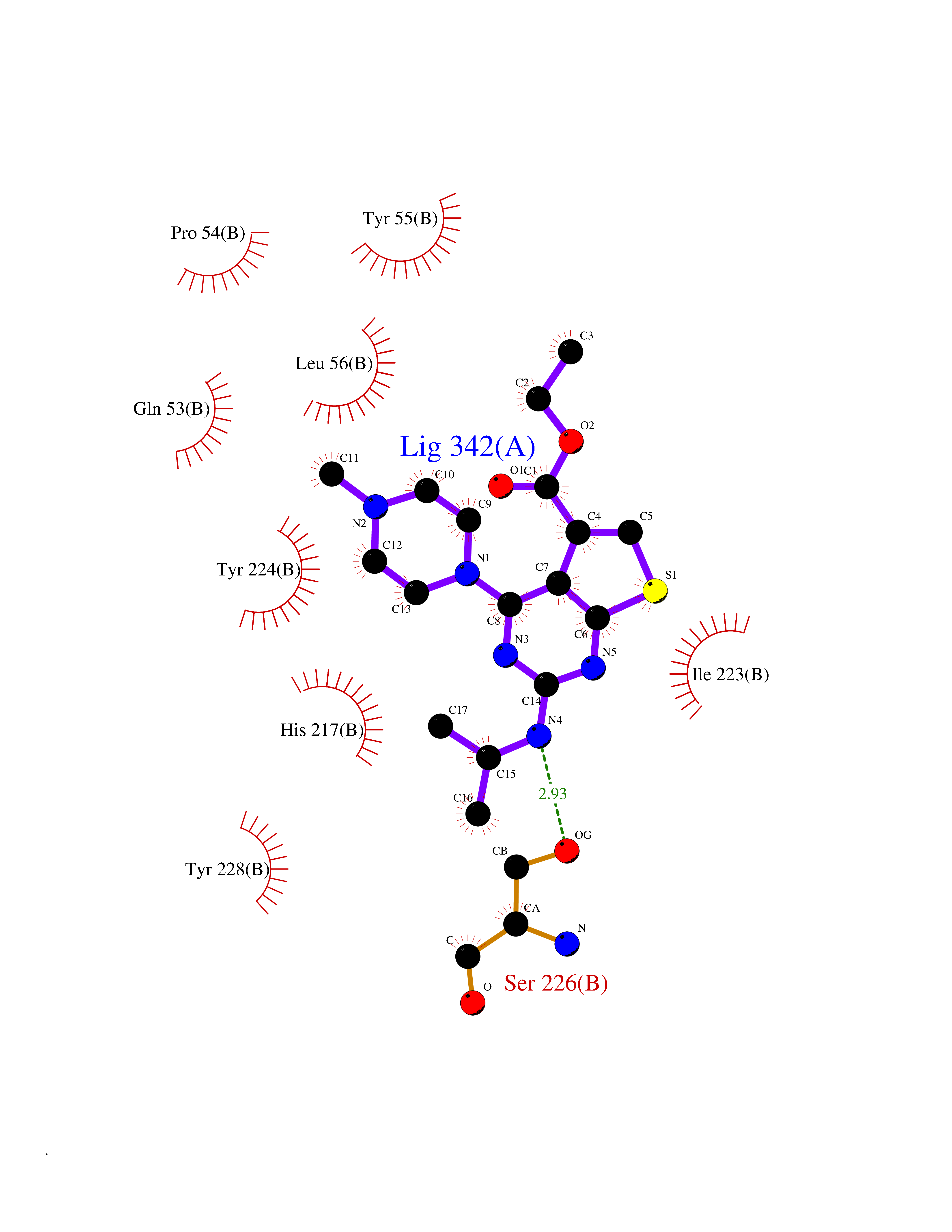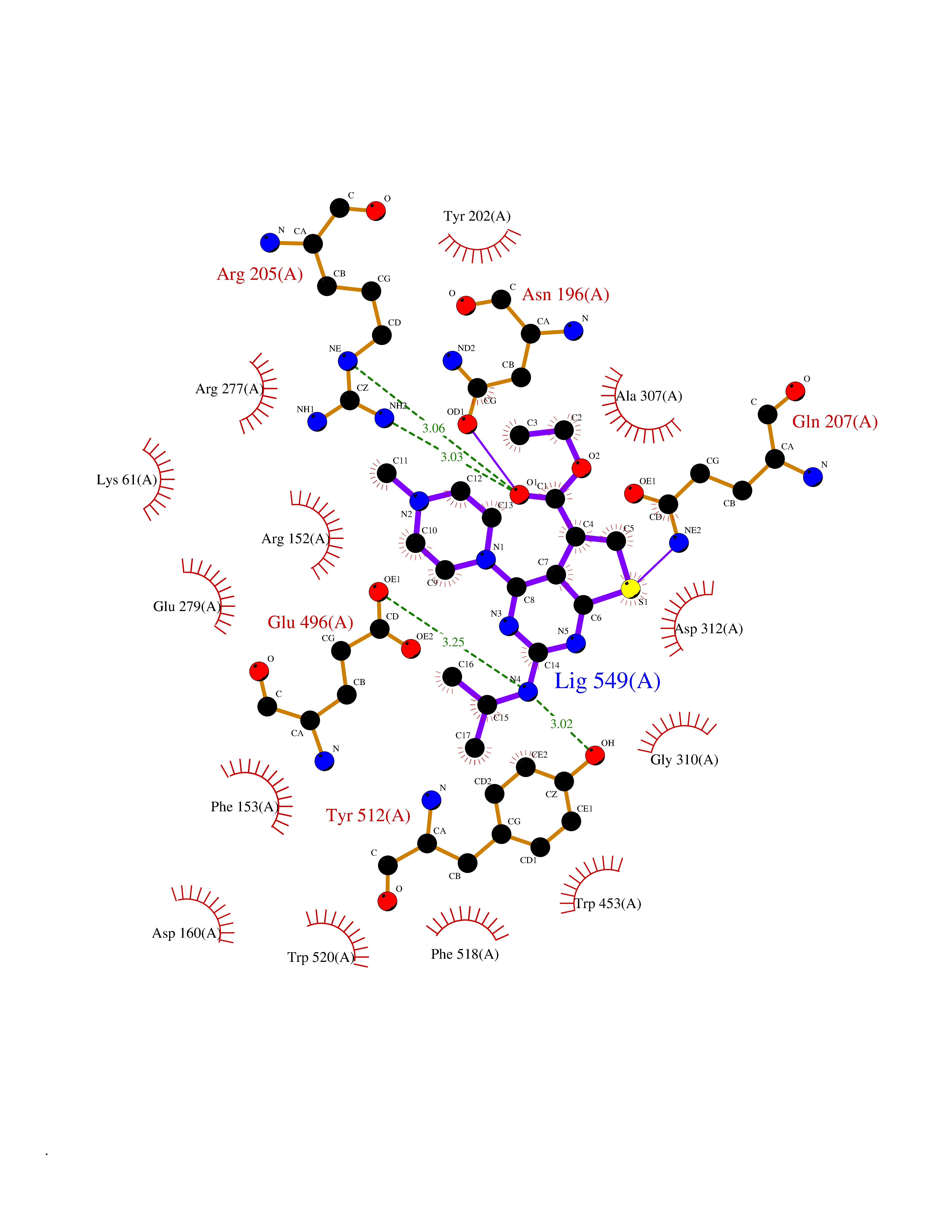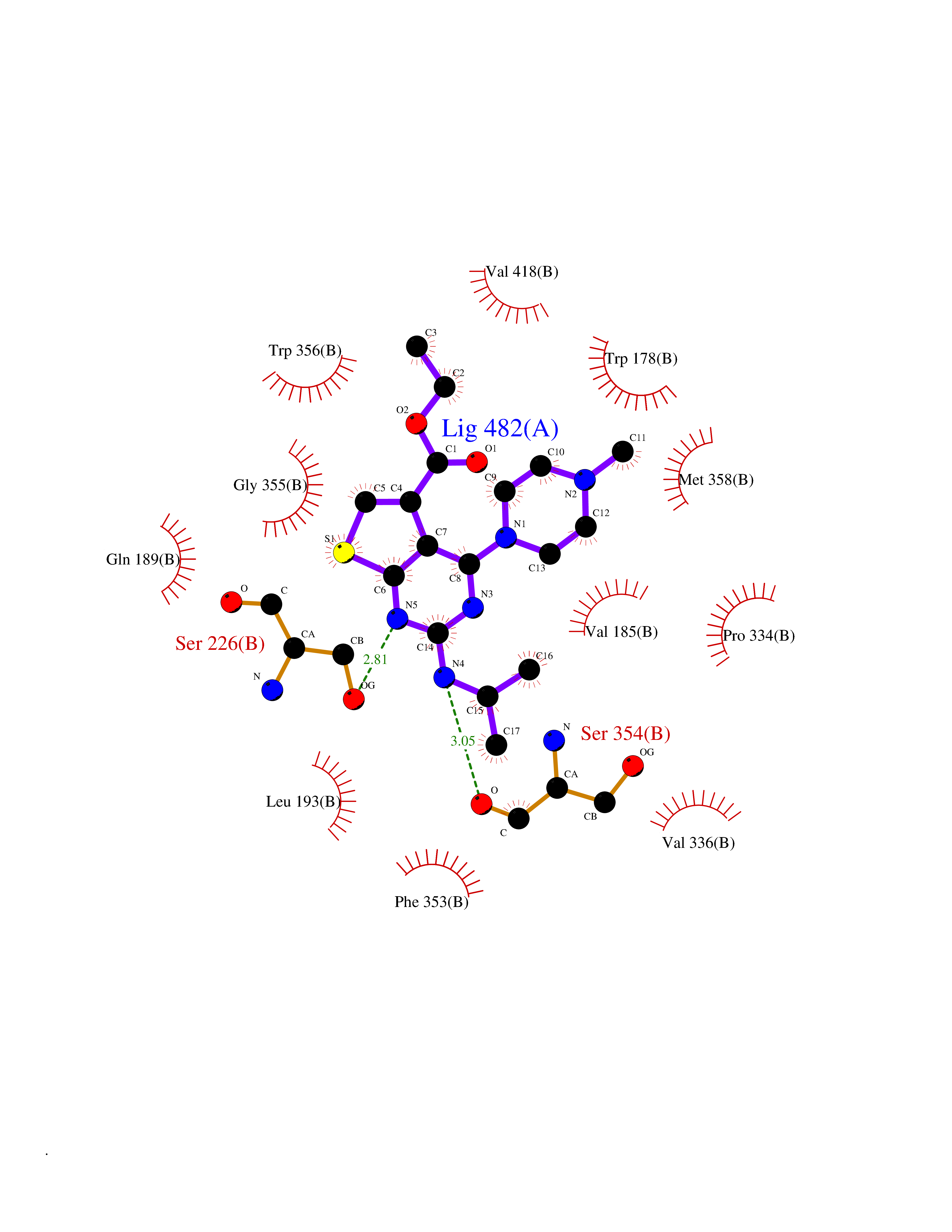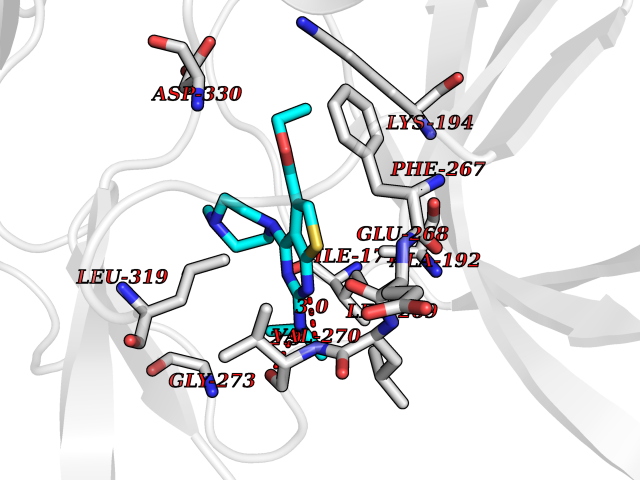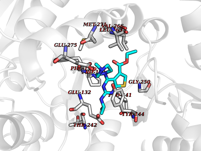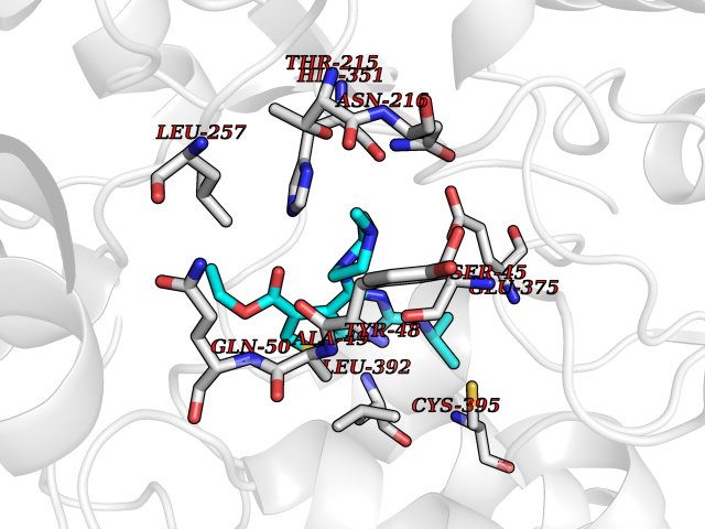 Target general information Gen name ache Organism Tetronarce californica (Pacific electric ray) (Torpedo californica) Uniprot ID TTD ID NA Synonyms NA Protein family Type-B carboxylesterase/lipase family Biochemical class NA Function Terminates signal transduction at the neuromuscular junction by rapid hydrolysis of the acetylcholine released into the synaptic cleft. May be involved in cell-cell interactions. Related diseases Noonan syndrome 5 (NS5) [MIM:611553]: A form of Noonan syndrome, a disease characterized by short stature, facial dysmorphic features such as hypertelorism, a downward eyeslant and low-set posteriorly rotated ears, and a high incidence of congenital heart defects and hypertrophic cardiomyopathy. Other features can include a short neck with webbing or redundancy of skin, deafness, motor delay, variable intellectual deficits, multiple skeletal defects, cryptorchidism, and bleeding diathesis. Individuals with Noonan syndrome are at risk of juvenile myelomonocytic leukemia, a myeloproliferative disorder characterized by excessive production of myelomonocytic cells. {ECO:0000269|PubMed:17603482, ECO:0000269|PubMed:17603483, ECO:0000269|PubMed:20683980}. The disease is caused by variants affecting the gene represented in this entry.; DISEASE: LEOPARD syndrome 2 (LPRD2) [MIM:611554]: A disorder characterized by lentigines, electrocardiographic conduction abnormalities, ocular hypertelorism, pulmonic stenosis, abnormalities of genitalia, retardation of growth, and sensorineural deafness. {ECO:0000269|PubMed:17603483}. The disease is caused by variants affecting the gene represented in this entry.; DISEASE: Cardiomyopathy, dilated, 1NN (CMD1NN) [MIM:615916]: A disorder characterized by ventricular dilation and impaired systolic function, resulting in congestive heart failure and arrhythmia. Patients are at risk of premature death. {ECO:0000269|PubMed:24777450}. The disease is caused by variants affecting the gene represented in this entry. Drugs (DrugBank ID) NA Interacts with NA EC number 3.1.1.7 Uniprot keywords 3D-structure; Alternative splicing; Cell membrane; Direct protein sequencing; Disulfide bond; Glycoprotein; GPI-anchor; Hydrolase; Lipoprotein; Membrane; Neurotransmitter degradation; Serine esterase; Signal; Synapse Protein physicochemical properties Chain ID A Molecular weight (Da) 59779.2 Length 529 Aromaticity 0.12 Instability index 48.49 Isoelectric point 5.8 Charge (pH=7) -8.48 3D Binding mode Sequence SELLVNTKSGKVMGTRVPVLSSHISAFLGIPFAEPPVGNMRFRRPEPKKPWSGVWNASTYPNNCQQYVDEQFPGFSGSEMWNPNREMSEDCLYLNIWVPSPRPKSTTVMVWIYGGGFYSGSSTLDVYNGKYLAYTEEVVLVSLSYRVGAFGFLALHGSQEAPGNVGLLDQRMALQWVHDNIQFFGGDPKTVTIFGESAGGASVGMHILSPGSRDLFRRAILQSGSPNCPWASVSVAEGRRRAVELGRNLNCNLNSDEELIHCLREKKPQELIDVEWNVLPFDSIFRFSFVPVIDGEFFPTSLESMLNSGNFKKTQILLGVNKDEGSFFLLYGAPGFSKDSESKISREDFMSGVKLSVPHANDLGLDAVTLQYTDWMDDNNGIKNRDGLDDIVGDHNVICPLMHFVNKYTKFGNGTYLYFFNHRASNLVWPEWMGVIHGYEIEFVFGLPLVKELNYTAEEEALSRRIMHYWATFAKTGNPNEPESKWPLFTTKEQKFIDLNTEPMKVHQRLRVQMCVFWNQFLPKLLNAT Hydrogen bonds contact Hydrophobic contact | ||||