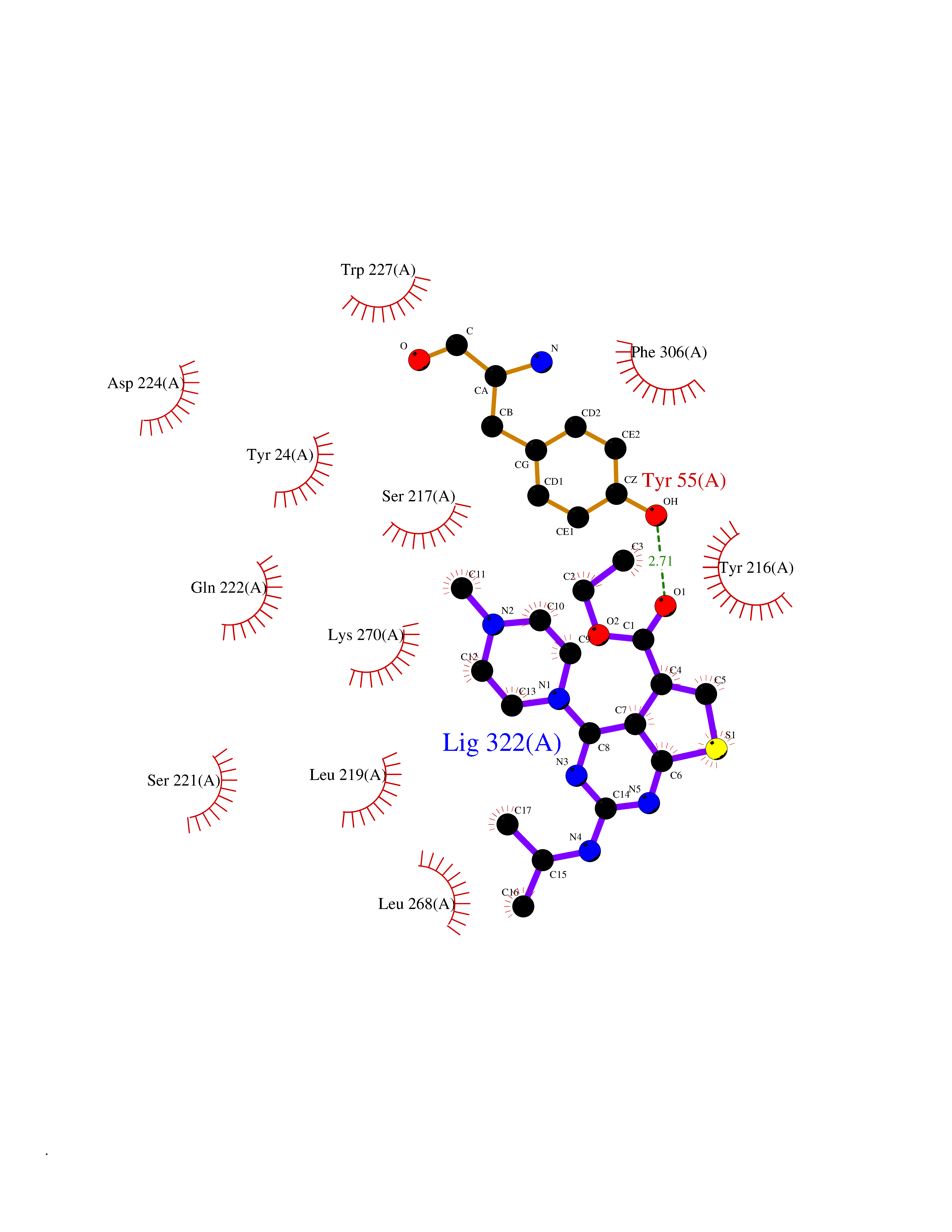 Target general information Gen name MAOA Organism Homo sapiens (Human) Uniprot ID TTD ID Synonyms Monoamine oxidase A; Amine oxidase [flavin-containing] A Protein family Flavin monoamine oxidase family Biochemical class CH-NH(2) donor oxidoreductase Function MAOA preferentially oxidizes biogenic amines such as 5-hydroxytryptamine (5-HT), norepinephrine and epinephrine. Catalyzes the oxidative deamination of biogenic and xenobiotic amines and has important functions in the metabolism of neuroactive and vasoactive amines in the central nervous system and peripheral tissues. Related diseases Brunner syndrome (BRNRS) [MIM:300615]: A form of X-linked non-dysmorphic mild intellectual disability. Male patients are affected by borderline intellectual deficit and exhibit abnormal behavior, including disturbed regulation of impulsive aggression. Obligate female carriers have normal intelligence and behavior. {ECO:0000269|PubMed:8211186}. The disease is caused by variants affecting the gene represented in this entry. Drugs (DrugBank ID) DB01472; DB00918; DB00182; DB06698; DB04889; DB13876; DB01445; DB06774; DB00215; DB04017; DB09130; DB05205; DB07641; DB00988; DB01363; DB00668; DB12329; DB01175; DB03147; DB14914; DB00614; DB01381; DB07919; DB04818; DB01247; DB00601; DB01577; DB00805; DB01442; DB01171; DB08804; DB00952; DB04820; DB00184; DB04821; DB06412; DB01626; DB00780; DB00191; DB00388; DB00397; DB09244; DB04850; DB00721; DB01168; DB00571; DB00852; DB09363; DB00140; DB00953; DB06654; DB01037; DB01104; DB00669; DB14569; DB09042; DB00624; DB13943; DB13944; DB13946; DB09245; DB00752; DB15328; DB09185; DB04832; DB00315; DB00909 Interacts with P27338 EC number EC 1.4.3.4 Uniprot keywords 3D-structure; Acetylation; Alternative splicing; Catecholamine metabolism; Direct protein sequencing; Disease variant; FAD; Flavoprotein; Intellectual disability; Membrane; Mitochondrion; Mitochondrion outer membrane; Neurotransmitter degradation; Oxidoreductase; Phosphoprotein; Proteomics identification; Reference proteome; Transmembrane; Transmembrane helix Protein physicochemical properties Chain ID A Molecular weight (Da) 58195.3 Length 513 Aromaticity 0.11 Instability index 34.97 Isoelectric point 7.98 Charge (pH=7) 2.87 3D Binding mode Sequence HMFDVVVIGGGISGLSAAKLLTEYGVSVLVLEARDRVGGRTYTIRNEHVDYVDVGGAYVGPTQNRILRLSKELGIETYKVNVSERLVQYVKGKTYPFRAAFPPVWNPIAYLDYNNLWRTIDNMGKEIPTDAPWEAQHADKWDKMTMKELIDKICWTKTARRFAYLFVNINVTSEPHEVSALWFLWYVKQCGGTTRIFSVTNGGQERKFVGGSGQVSERIMDLLGDQVKLNHPVTHVDQSSDNIIIETLNHEHYECKYVINAIPPTLTAKIHFRPELPAERNQLIQRLPMGAVIKCMMYYKEAFWKKKDYCGCMIIEDEDAPISITLDDTKPDGSLPAIMGFILARKADRLAKLHKEIRKKKICELYAKVLGSQEALHPVHYEEKNWCEEQYSGGCYTAYFPPGIMTQYGRVIRQPVGRIFFAGTETATKWSGYMEGAVEAGERAAREVLNGLGKVTEKDIWVQEPESKDVPAVEITHTFWERNLPSVSGLLKIIGFSTSVTALGFVLYKYKLL Hydrogen bonds contact Hydrophobic contact | ||||