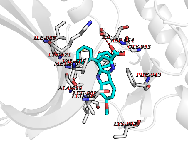 | Target general information Gen name DYRK2 Organism Homo sapiens (Human) Uniprot ID TTD ID Synonyms Dual specificity tyrosine-phosphorylation-regulated kinase 2 Protein family Protein kinase superfamily, CMGC Ser/Thr protein kinase family, MNB/DYRK subfamily Biochemical class Kinase Function Functions in part via its role in ubiquitin-dependent proteasomal protein degradation. Functions downstream of ATM and phosphorylates p53/TP53 at 'Ser-46', and thereby contributes to the induction of apoptosis in response to DNA damage. Phosphorylates NFATC1, and thereby inhibits its accumulation in the nucleus and its transcription factor activity. Phosphorylates EIF2B5 at 'Ser-544', enabling its subsequent phosphorylation and inhibition by GSK3B. Likewise, phosphorylation of NFATC1, CRMP2/DPYSL2 and CRMP4/DPYSL3 promotes their subsequent phosphorylation by GSK3B. May play a general role in the priming of GSK3 substrates. Inactivates GYS1 by phosphorylation at 'Ser-641', and potentially also a second phosphorylation site, thus regulating glycogen synthesis. Mediates EDVP E3 ligase complex formation and is required for the phosphorylation and subsequent degradation of KATNA1. Phosphorylates TERT at 'Ser-457', promoting TERT ubiquitination by the EDVP complex. Phosphorylates SIAH2, and thereby increases its ubiquitin ligase activity. Promotes the proteasomal degradation of MYC and JUN, and thereby regulates progress through the mitotic cell cycle and cell proliferation. Promotes proteasomal degradation of GLI2 and GLI3, and thereby plays a role in smoothened and sonic hedgehog signaling. Plays a role in cytoskeleton organization and neurite outgrowth via its phosphorylation of DCX and DPYSL2. Phosphorylates CRMP2/DPYSL2, CRMP4/DPYSL3, DCX, EIF2B5, EIF4EBP1, GLI2, GLI3, GYS1, JUN, MDM2, MYC, NFATC1, p53/TP53, TAU/MAPT and KATNA1. Can phosphorylate histone H1, histone H3 and histone H2B (in vitro). Can phosphorylate CARHSP1 (in vitro). Serine/threonine-protein kinase involved in the regulation of the mitotic cell cycle, cell proliferation, apoptosis, organization of the cytoskeleton and neurite outgrowth. Related diseases Bone marrow failure and diabetes mellitus syndrome (BMFDMS) [MIM:620044]: A form of bone marrow failure syndrome, a heterogeneous group of life-threatening disorders characterized by hematopoietic defects in association with a range of variable extra-hematopoietic manifestations. BMFDMS is an autosomal recessive form characterized by various degrees of bone marrow failure, ranging from dyserythropoiesis to bone marrow aplasia, with onset in infancy or early childhood, and non-autoimmune insulin-dependent diabetes mellitus appearing in the first or second decades. Many patients show pigmentary skin abnormalities and short stature. {ECO:0000269|PubMed:28073829, ECO:0000269|PubMed:35611808, ECO:0000269|PubMed:35931051}. The disease is caused by variants affecting the gene represented in this entry. Drugs (DrugBank ID) NA Interacts with Q9NR20; Q13422; Q9BQD3; Q9BRK4; P23497; O43379; P62258; Q96C00 EC number EC 2.7.12.1 Uniprot keywords 3D-structure; Alternative splicing; Apoptosis; ATP-binding; Cytoplasm; Kinase; Magnesium; Manganese; Nucleotide-binding; Nucleus; Phosphoprotein; Proteomics identification; Reference proteome; Serine/threonine-protein kinase; Transferase; Tyrosine-protein kinase; Ubl conjugation; Ubl conjugation pathway Protein physicochemical properties Chain ID A Molecular weight (Da) 46422.1 Length 407 Aromaticity 0.09 Instability index 44.91 Isoelectric point 9.09 Charge (pH=7) 12.37 3D Binding mode Sequence HHHSXGVDLGTENLYFQSMGKVKATPMTPEQAMKQYMQKLTAFEHHEIFSYPEIYFLGLNAKKRQGMTGGPNNGGYDDDQGSYVQVPHDHVAYRYEVLKVIGKGSFGQVVKAYDHKVHQHVALKMVRNEKRFHRQAAEEIRILEHLRKQDKDNTMNVIHMLENFTFRNHICMTFELLSMNLYELIKKNKFQGFSLPLVRKFAHSILQCLDALHKNRIIHCDLKPENILLKQQGRSGIKVIDFGSSCYEHQRVYTXIQSRFYRAPEVILGARYGMPIDMWSLGCILAELLTGYPLLPGEDEGDQLACMIELLGMPSQKLLDASKRAKNFVSXKGYPRYCTVTTLSDVVLNGGRSRRGKLRGPPESREWGNALKGCDDPLFLDFLKQCLEWDPAVRMTPGQALRHPWLR Hydrogen bonds contact Hydrophobic contact | ||||