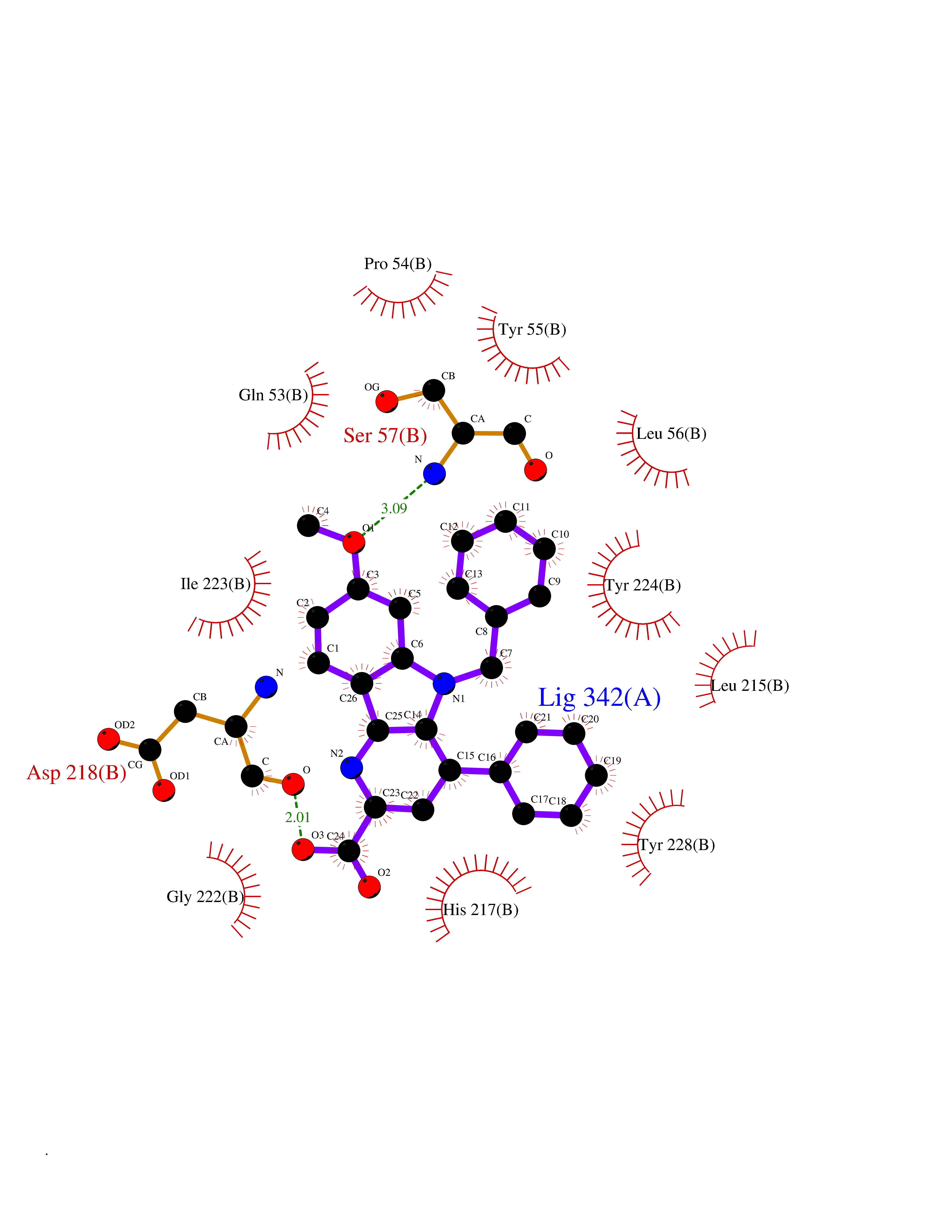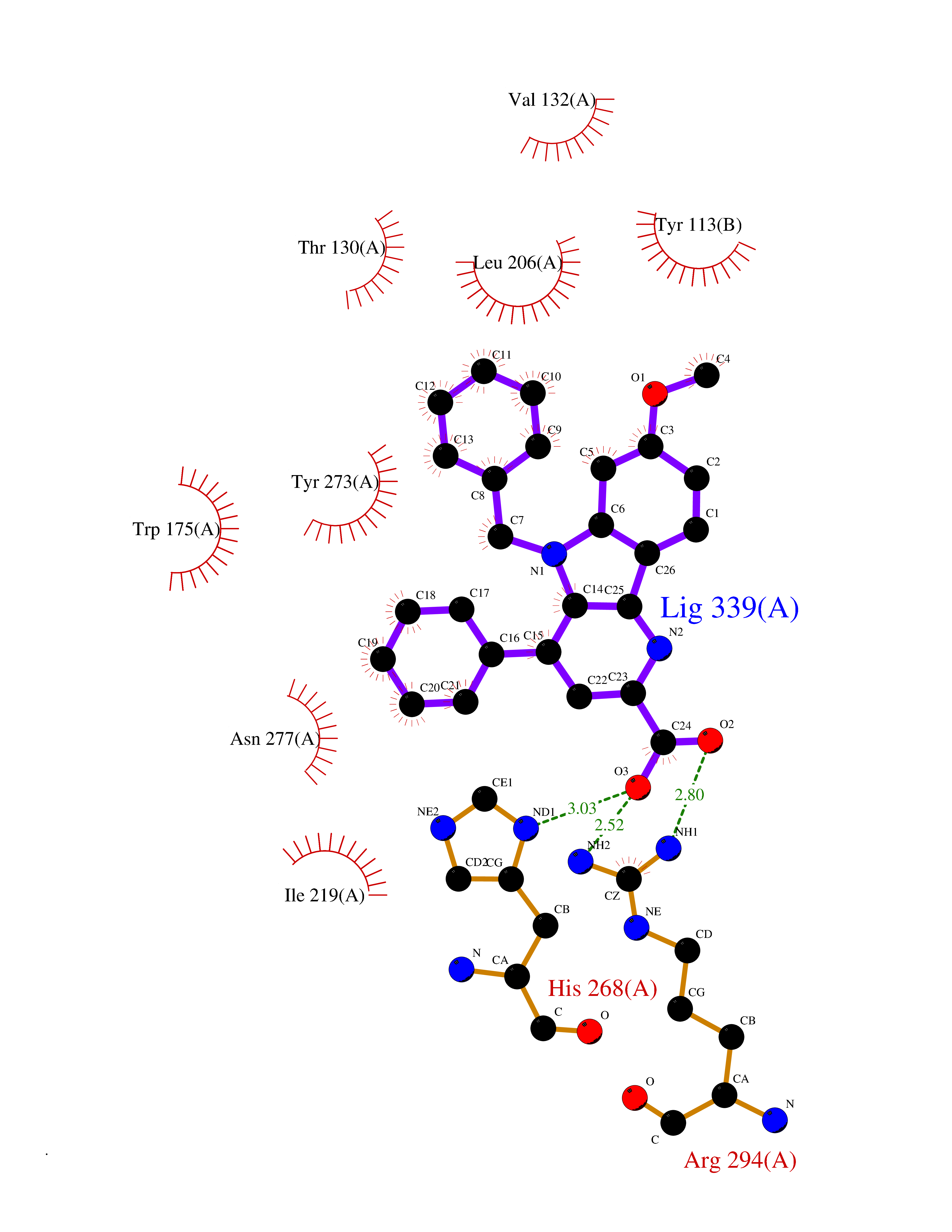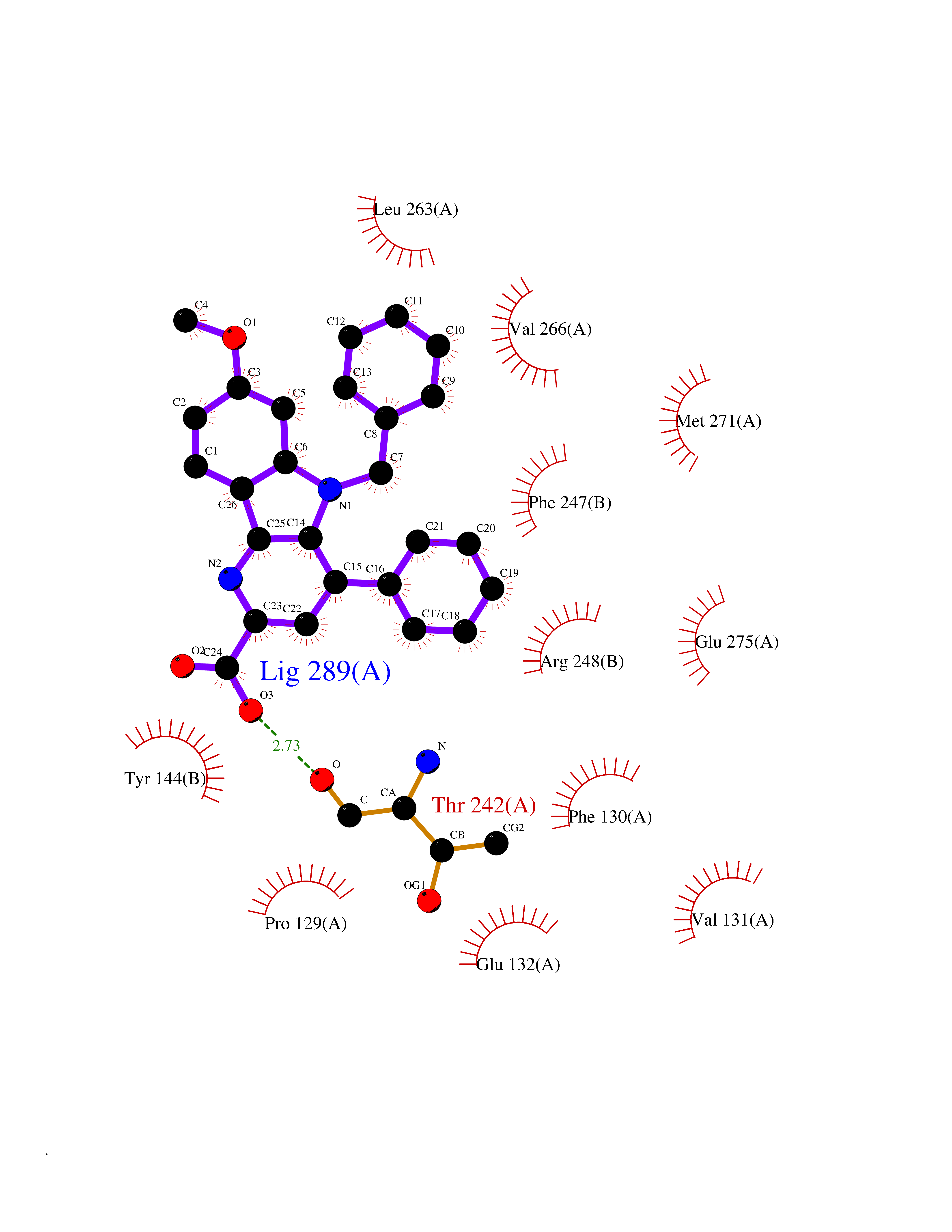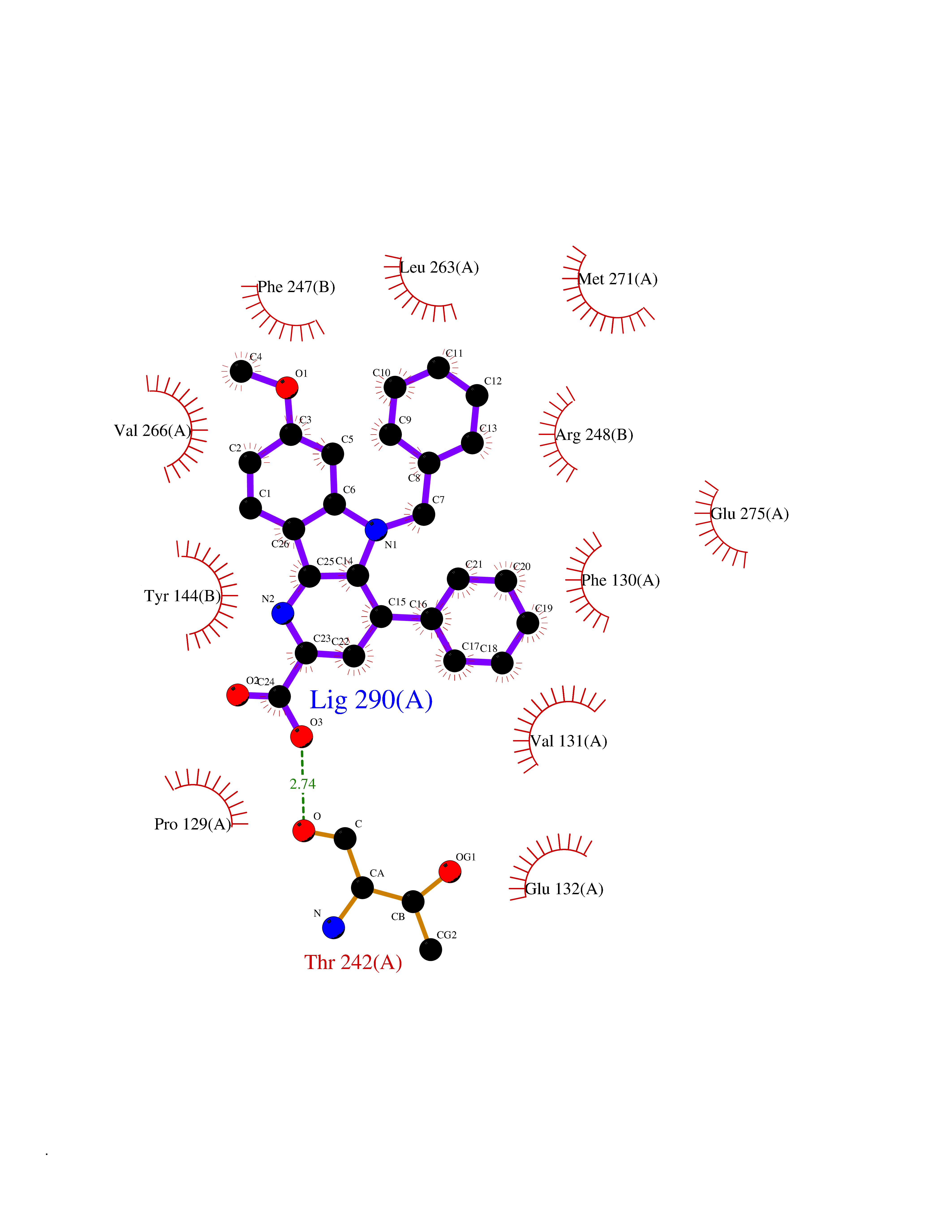 | Target general information Gen name TPH1 Organism Homo sapiens (Human) Uniprot ID TTD ID Synonyms Tryptophan 5-monooxygenase 1; TRPH; TPRH Protein family Biopterin-dependent aromatic amino acid hydroxylase family Biochemical class Paired donor oxygen oxidoreductase Function Responsible for addition of the -HO group (hydroxylation) to the 5 position to form the amino acid 5-hydroxytryptophan (5-HTP), which is the initial and rate-limiting step in the synthesis of the neurotransmitter serotonin. Related diseases Tyrosinemia 2 (TYRSN2) [MIM:276600]: An inborn error of metabolism characterized by elevations of tyrosine in the blood and urine, and oculocutaneous manifestations. Typical features include palmoplantar keratosis, painful corneal ulcers, and intellectual disability. {ECO:0000269|PubMed:1357662}. The disease is caused by variants affecting the gene represented in this entry. Drugs (DrugBank ID) DB05199; DB00360; DB12095; DB00150 Interacts with Q14457; Q96IK1-2; Q9UKB3; Q9H8Y8; O43586; O95789-4 EC number EC 1.14.16.4 Uniprot keywords 3D-structure; Alternative splicing; Iron; Metal-binding; Monooxygenase; Oxidoreductase; Phosphoprotein; Proteomics identification; Reference proteome; Serotonin biosynthesis; Ubl conjugation Protein physicochemical properties Chain ID A Molecular weight (Da) 31138.2 Length 271 Aromaticity 0.13 Instability index 43.43 Isoelectric point 6.73 Charge (pH=7) -0.86 3D Binding mode Sequence TVPWFPKKISDLDHCNVYRKRRKYFADLAMNYKHGDPIPKVEFTEEEIKTWGTVFQELNKLYPTHACREYLKNLPLLSKYCGYREDNIPQLEDVSNFLKERTGFSIRPVAGYLSPRDFLSGLAFRVFHCTQYVRHSSDPFYTPEPDTCHELLGHVPLLAEPSFAQFSQEIGLASLGASEEAVQKLATCYFFTVEFGLCKQDGQLRVFGAGLLSSISELKHALSGHAKVKPFDPKITCKQECLITTFQDVYFVSESFEDAKEKMREFTKTIK Hydrogen bonds contact Hydrophobic contact | ||||