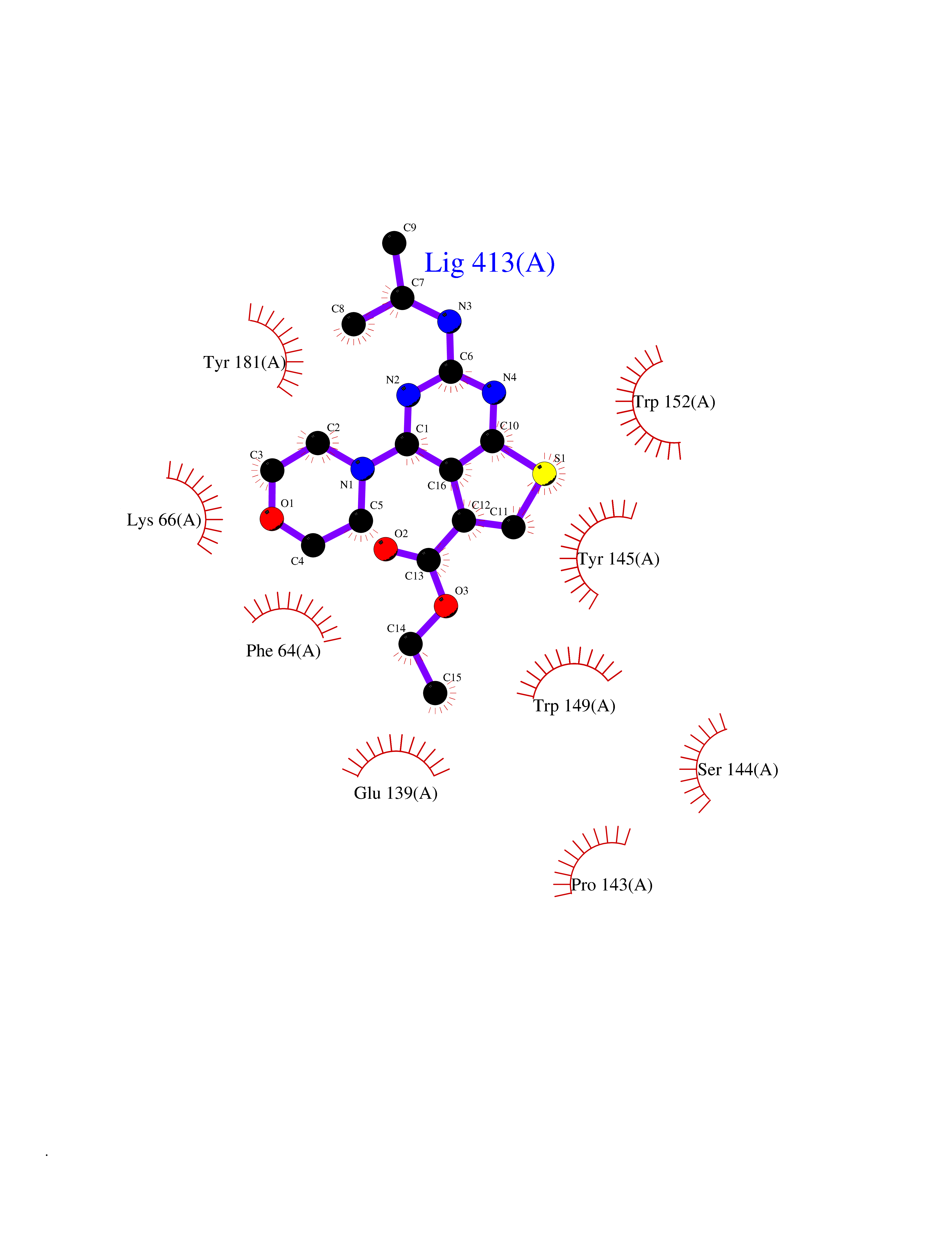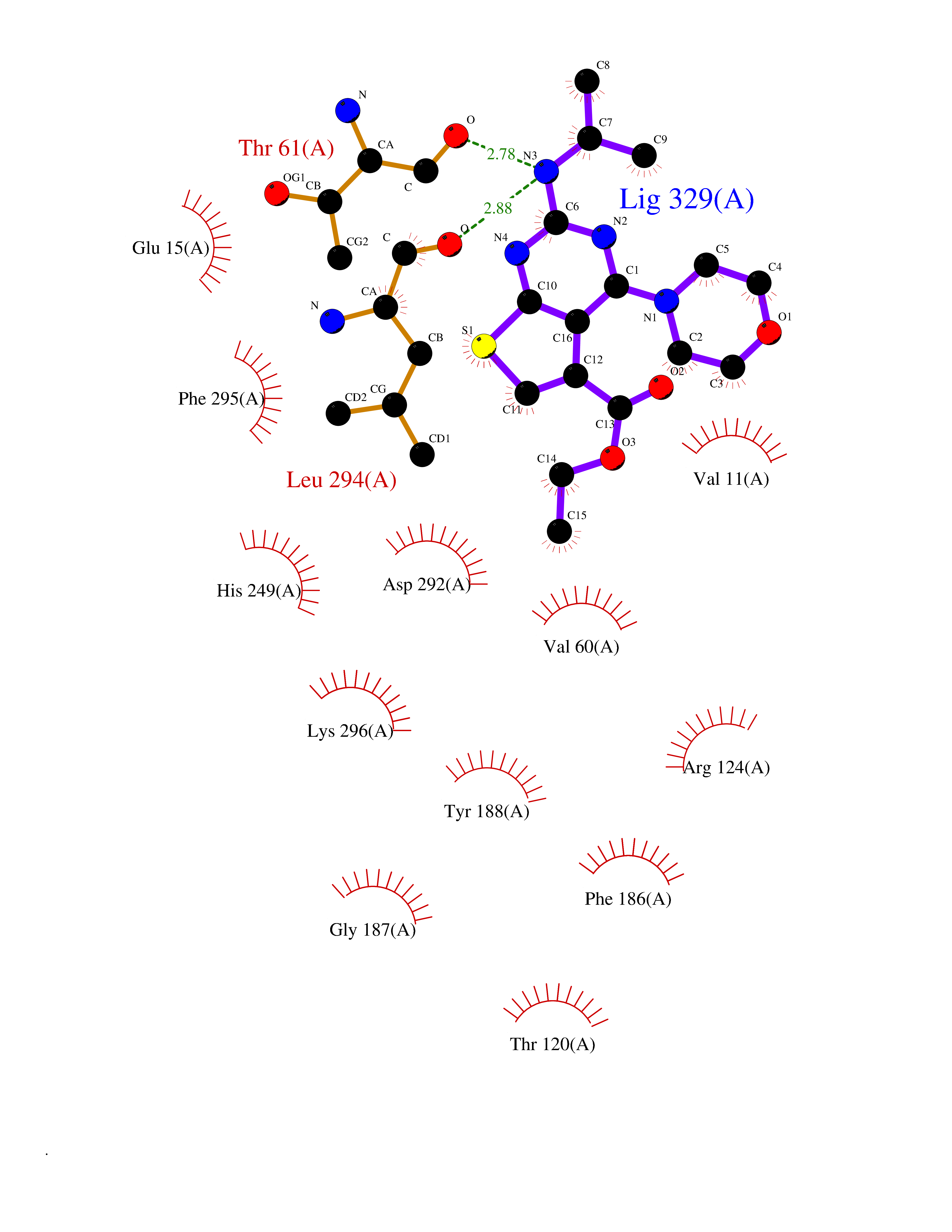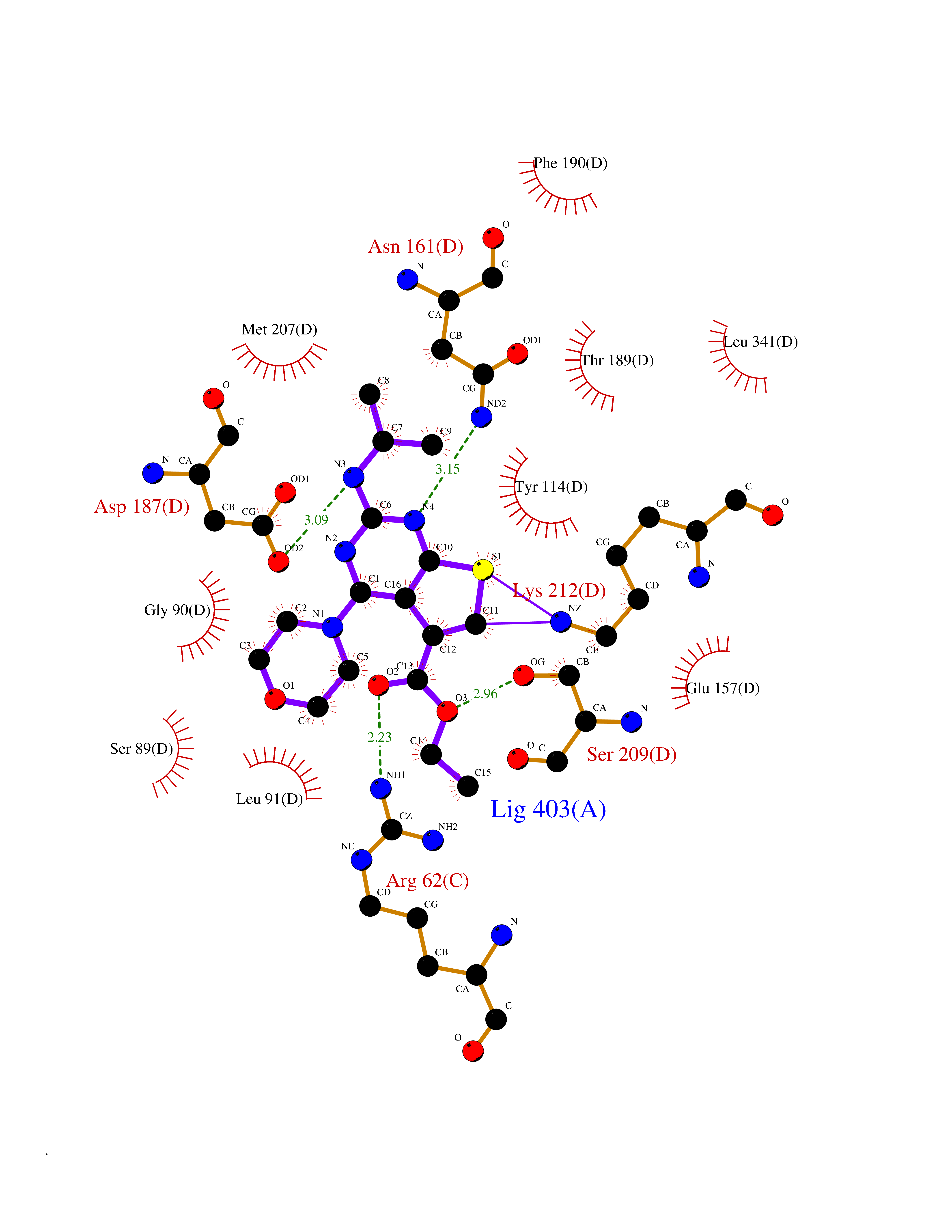 | Target general information Gen name DARS Organism Homo sapiens (Human) Uniprot ID TTD ID NA Synonyms PIG40;DARS Protein family Class-II aminoacyl-tRNA synthetase family, Type 2 subfamily Biochemical class Ligase Function Aminoacylase activity.Aspartate-tRNA ligase activity.ATP binding.RNA binding. Related diseases Hypomyelination with brainstem and spinal cord involvement and leg spasticity (HBSL) [MIM:615281]: An autosomal recessive leukoencephalopathy characterized by onset in the first year of life of severe spasticity, mainly affecting the lower limbs and resulting in an inability to achieve independent ambulation. Affected individuals show delayed motor development and nystagmus; some may have mild intellectual disability. Brain MRI shows hypomyelination and white matter lesions in the cerebrum, brainstem, cerebellum, and spinal cord. {ECO:0000269|PubMed:23643384}. The disease is caused by variants affecting the gene represented in this entry. Drugs (DrugBank ID) DB00128 Interacts with Q13155; Q08050; P62993 EC number 6.1.1.12 Uniprot keywords 3D-structure; Acetylation; Alternative splicing; Aminoacyl-tRNA synthetase; ATP-binding; Cytoplasm; Disease variant; Ligase; Nucleotide-binding; Phosphoprotein; Protein biosynthesis; Proteomics identification; Reference proteome Protein physicochemical properties Chain ID A,B Molecular weight (Da) 49374.2 Length 430 Aromaticity 0.09 Instability index 42.82 Isoelectric point 6.11 Charge (pH=7) -5.14 3D Binding mode Sequence AEDYAKERYGISSMIQSQEKPDRVLVRVRDLTIQKADEVVWVRARVHTSRAKGKQCFLVLRQQQFNVQALVAVGDHASKQMVKFAANINKESIVDVEGVVRKVNQKIGSCTQQDVELHVQKIYVISLAEPRLPLQLDDAVRPTVNQDTRLDNRVIDLRTSTSQAVFRLQSGICHLFRETLINKGFVEIQTPKISPQLYKQMCICADFEKVFSIGPVFLTEFVGLDIEMAFNYHYHEVMEEIADTMVQIFKGLQERFQTEIQTVNKQFPCEPFKFLEPTLRLEYCEALAMLREAGVEMGDEDDLSTPNEKLLGHLVKEKYDTDFYILDKYPLAVRPFYTMPDPRNPKQSNSYDMFMRGEEILSGAQRIHDPQLLTERALHHGIDLEKIKAYIDSFRFGAPPHAGGGIGLERVTMLFLGLHNVRQTSMFPRD Hydrogen bonds contact Hydrophobic contact | ||||