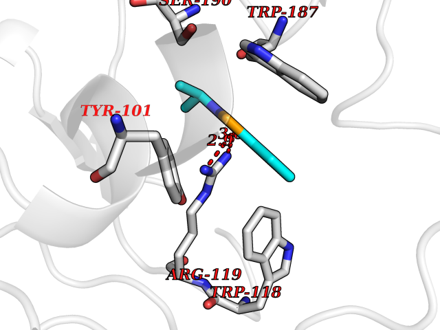 Target general information Gen name AGXT Organism Homo sapiens (Human) Uniprot ID TTD ID NA Synonyms AGT1;SPAT Protein family Class-V pyridoxal-phosphate-dependent aminotransferase family Biochemical class Transferase Function Alanine-glyoxylate transaminase activity.Amino acid binding.Identical protein binding.Protein homodimerization activity.Protein self-association.Pyridoxal phosphate binding.Receptor binding.Serine-pyruvate transaminase activity.Transaminase activity. Related diseases Hyperoxaluria primary 1 (HP1) [MIM:259900]: An inborn error of glyoxylate metabolism characterized by increased excretion of oxalate and glycolate, and progressive tissue accumulation of insoluble calcium oxalate. Affected individuals are at risk for nephrolithiasis, nephrocalcinosis and early onset end-stage renal disease. {ECO:0000269|PubMed:10394939, ECO:0000269|PubMed:10453743, ECO:0000269|PubMed:10541294, ECO:0000269|PubMed:10862087, ECO:0000269|PubMed:10960483, ECO:0000269|PubMed:12559847, ECO:0000269|PubMed:12777626, ECO:0000269|PubMed:1301173, ECO:0000269|PubMed:1349575, ECO:0000269|PubMed:15253729, ECO:0000269|PubMed:15849466, ECO:0000269|PubMed:15961946, ECO:0000269|PubMed:15963748, ECO:0000269|PubMed:16971151, ECO:0000269|PubMed:1703535, ECO:0000269|PubMed:17495019, ECO:0000269|PubMed:2039493, ECO:0000269|PubMed:23229545, ECO:0000269|PubMed:24055001, ECO:0000269|PubMed:24934730, ECO:0000269|PubMed:26149463, ECO:0000269|PubMed:8101040, ECO:0000269|PubMed:9192270, ECO:0000269|PubMed:9604803}. The disease is caused by variants affecting the gene represented in this entry. Drugs (DrugBank ID) DB08060; DB00160; DB02079; DB00145; DB04083; DB00114; DB00133 Interacts with Q5BKX5-3; P21549; P0C7T5; Q9NR55; Q9H5F2; Q9UKJ5; A8MQ03; O43281-2; A1KXE4-2; Q5TD97; P49356; P53539; P49639; Q15323; O76011; O76014; Q6A162; Q07627; P60328; Q9BYR8; Q3LI67; Q8IUC2; Q9BYQ4; O60711; Q99750; Q5VZ52; P0DPK4; O43482; P50542-1; O15496; Q6ZR37; Q9NQX0; Q8HWS3; Q5W111-2; Q8WVR3; Q6DKK2 EC number 2.6.1.44; 2.6.1.51 Uniprot keywords 3D-structure; Acetylation; Aminotransferase; Disease variant; Peroxisome; Phosphoprotein; Proteomics identification; Pyridoxal phosphate; Reference proteome; Transferase Protein physicochemical properties Chain ID A,B Molecular weight (Da) 84537 Length 771 Aromaticity 0.07 Instability index 36.81 Isoelectric point 8.42 Charge (pH=7) 6.81 3D Binding mode Sequence LLVTPPKALLKPLSIPNQLLLGPGPSNLPPRIMAAGGLQMIGSMSKDMYQIMDEIKEGIQYVFQTRNPLTLVISGSGHCALEAALVNVLEPGDSFLVGANGIWGQRAVDIGERIGARVHPMTKDPGGHYTLQEVEEGLAQHKPVLLFLTHGESSTGVLQPLDGFGELCHRYKCLLLVDSVASLGGTPLYMDRQGIDILYSGSQKALNAPPGTSLISFSDKAKKKMYSRKTKPFSFYLDIKWLANFWGCDDQPRMYHHTIPVISLYSLRESLALIAEQGLENSWRQHREAAAYLHGRLQALGLQLFVKDPALRLPTVTTVAVPAGYDWRDIVSYVIDHFDIEIMGGLGPSTGKVLRIGLLGCNATRENVDRVTEALRAALQHCPKKLLVTPPKALLKPLSIPNQLLLGPGPSNLPPRIMAAGGLQMIGSMSKDMYQIMDEIKEGIQYVFQTRNPLTLVISGSGHCALEAALVNVLEPGDSFLVGANGIWGQRAVDIGERIGARVHPMTKDPGGHYTLQEVEEGLAQHKPVLLFLTHGESSTGVLQPLDGFGELCHRYKCLLLVDSVASLGGTPLYMDRQGIDILYSGSQKALNAPPGTSLISFSDKAKKKMYSRKTKPFSFYLDIKWLANFWGCDDQPRMYHHTIPVISLYSLRESLALIAEQGLENSWRQHREAAAYLHGRLQALGLQLFVKDPALRLPTVTTVAVPAGYDWRDIVSYVIDHFDIEIMGGLGPSTGKVLRIGLLGCNATRENVDRVTEALRAALQHCPKKK Hydrogen bonds contact Hydrophobic contact | ||||