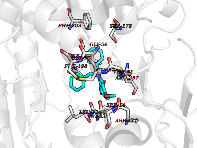 | Target general information Gen name NOS2 Organism Homo sapiens (Human) Uniprot ID TTD ID Synonyms iNOS; Peptidyl-cysteine S-nitrosylase NOS2; Nitric oxide synthase, inducible; NOS2A; NOS type II; Inducible NOS; Inducible NO synthase; Hepatocyte NOS; HEP-NOS Protein family NOS family Biochemical class Paired donor oxygen oxidoreductase Function Produces nitric oxide (NO) which is a messenger molecule with diverse functions throughout the body. In macrophages, NO mediates tumoricidal and bactericidal actions. Also has nitrosylase activity and mediates cysteine S-nitrosylation of cytoplasmic target proteins such PTGS2/COX2 (By similarity). As component of the iNOS-S100A8/9 transnitrosylase complex involved in the selective inflammatory stimulus-dependent S-nitrosylation of GAPDH on 'Cys-247' implicated in regulation of the GAIT complex activity and probably multiple targets including ANXA5, EZR, MSN and VIM. Involved in inflammation, enhances the synthesis of proinflammatory mediators such as IL6 and IL8. Related diseases Cerebellar ataxia, impaired intellectual development, and dysequilibrium syndrome 3 (CAMRQ3) [MIM:613227]: An autosomal recessive, congenital cerebellar ataxia associated with dysarthia, quadrupedal gait and intellectual disability. {ECO:0000269|PubMed:19461874}. The disease is caused by variants affecting the gene represented in this entry. Drugs (DrugBank ID) DB07003; DB07007; DB07011; DB07405; DB08750; DB01997; DB07029; DB07008; DB08214; DB07002; DB01835; DB06879; DB04534; DB03100; DB02207; DB00125; DB00155; DB01234; DB14649; DB11327; DB00997; DB07306; DB07388; DB05252; DB01381; DB03366; DB05214; DB04400; DB09237; DB00244; DB01110; DB01017; DB03144; DB01686; DB03449; DB06916; DB07318; DB07389; DB02044; DB02644; DB05383; DB02234; DB03953; DB02462; DB08814 Interacts with P04406 EC number EC 1.14.13.39 Uniprot keywords 3D-structure; Alternative splicing; Calcium; Calmodulin-binding; Cytoplasm; FAD; Flavoprotein; FMN; Heme; Iron; Metal-binding; NADP; Oxidoreductase; Phosphoprotein; Proteomics identification; Reference proteome; Ubl conjugation; Zinc Protein physicochemical properties Chain ID A,B,C,D Molecular weight (Da) 48633 Length 421 Aromaticity 0.12 Instability index 46.5 Isoelectric point 6.75 Charge (pH=7) -1.04 3D Binding mode Sequence RHVRIKNWGSGMTFQDTLHHKAKGILTCRSKSCLGSIMTPKSLTRGPRDKPTPPDELLPQAIEFVNQYYGSFKEAKIEEHLARVEAVTKEIETTGTYQLTGDELIFATKQAWRNAPRCIGRIQWSNLQVFDARSCSTAREMFEHICRHVRYSTNNGNIRSAITVFPQRSDGKHDFRVWNAQLIRYAGYQMPDGSIRGDPANVEFTQLCIDLGWKPKYGRFDVVPLVLQANGRDPELFEIPPDLVLEVAMEHPKYEWFRELELKWYALPAVANMLLEVGGLEFPGCPFNGWYMGTEIGVRDFCDVQRYNILEEVGRRMGLETHKLASLWKDQAVVEINIAVLHSFQKQNVTIMDHHSAAESFMKYMQNEYRSRGGCPADWIWLVPPMSGSITPVFHQEMLNYVLSPFYYYQVEAWKTHVWQD Hydrogen bonds contact Hydrophobic contact | ||||