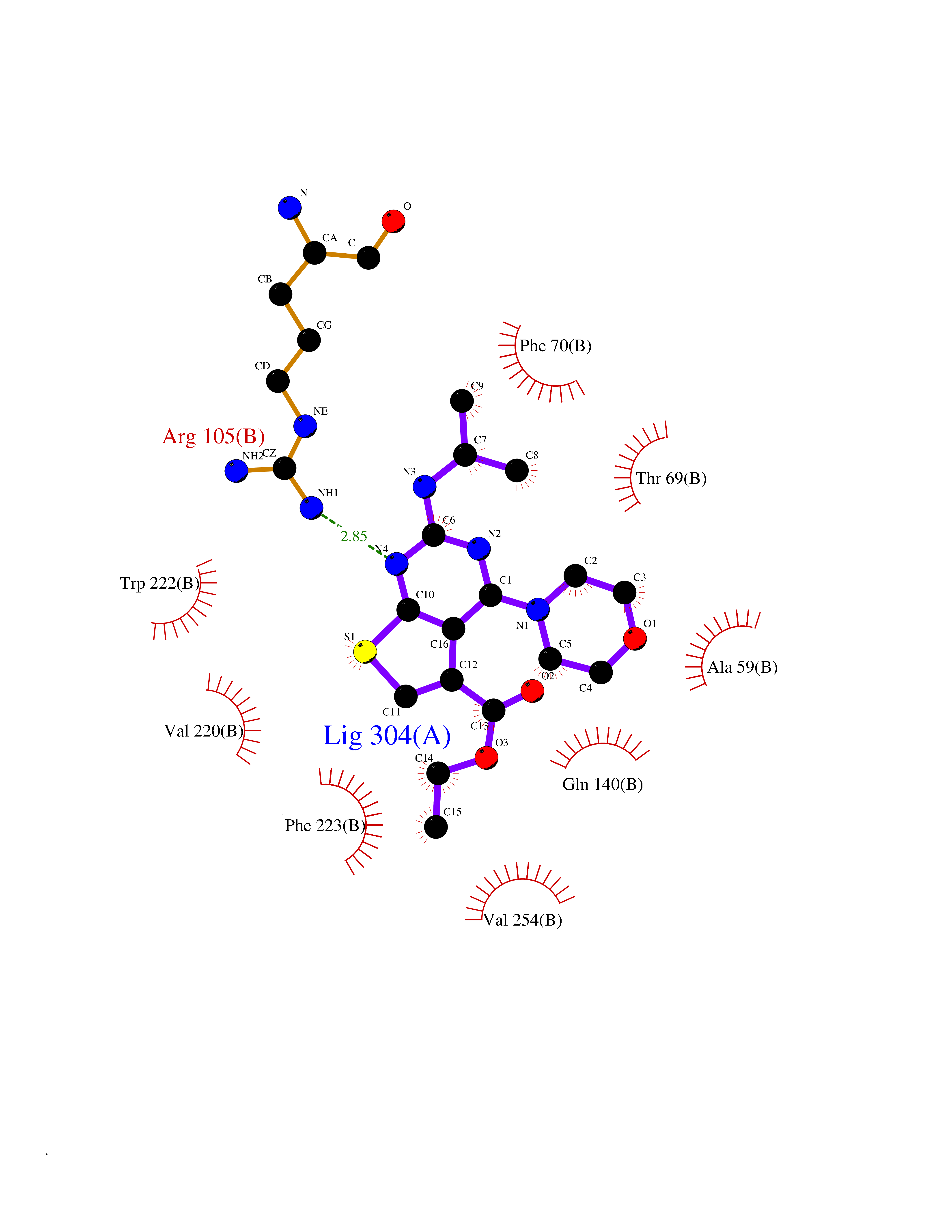 | Target general information Gen name SIRT5 Organism Homo sapiens (Human) Uniprot ID TTD ID Synonyms SIR2L5; SIR2-like protein 5; Regulatory protein SIR2 homolog 5 Protein family Sirtuin family, Class III subfamily Biochemical class Sirtuin family. Class III subfamily Function NAD-dependent lysine demalonylase, desuccinylase and deglutarylase that specifically removes malonyl, succinyl and glutaryl groups on target proteins (PubMed:21908771, PubMed:22076378, PubMed:24703693, PubMed:29180469). Activates CPS1 and contributes to the regulation of blood ammonia levels during prolonged fasting: acts by mediating desuccinylation and deglutarylation of CPS1, thereby increasing CPS1 activity in response to elevated NAD levels during fasting (PubMed:22076378, PubMed:24703693). Activates SOD1 by mediating its desuccinylation, leading to reduced reactive oxygen species (PubMed:24140062). Activates SHMT2 by mediating its desuccinylation (PubMed:29180469). Modulates ketogenesis through the desuccinylation and activation of HMGCS2. Has weak NAD-dependent protein deacetylase activity; however this activity may not be physiologically relevant in vivo. Can deacetylate cytochrome c (CYCS) and a number of other proteins in vitro such as UOX. Related diseases Immunodeficiency 98 with autoinflammation, X-linked (IMD98) [MIM:301078]: An X-linked disorder characterized by onset of recurrent infections associated with lymphoproliferation and autoinflammation in the first decade of life. Mostly males are affected; carrier females may have mild symptoms. Features include mouth ulcers, fever, poor early growth, hepatosplenomegaly, lymphadenopathy, polyarthritis, and non-infectious enteritis. {ECO:0000269|PubMed:33512449, ECO:0000269|PubMed:34981838}. The disease is caused by variants affecting the gene represented in this entry. Drugs (DrugBank ID) DB03478; DB02059; DB15493; DB02701; DB04786 Interacts with NA EC number EC 3.5.1.- Uniprot keywords 3D-structure; Alternative splicing; Cytoplasm; Metal-binding; Mitochondrion; NAD; Nucleus; Proteomics identification; Reference proteome; Transferase; Transit peptide; Zinc Protein physicochemical properties Chain ID A,B Molecular weight (Da) 28525.2 Length 262 Aromaticity 0.08 Instability index 43.37 Isoelectric point 8.39 Charge (pH=7) 3.54 3D Binding mode Sequence ADFRKFFAKAKHIVIISGAGVSAESGVPTFRGAGGYWRKWQAQDLATPLAFAHNPSRVWEFYHYRREVMGSKEPNAGHRAIAECETRLGKQGRRVVVITQNIDELHRKAGTKNLLEIHGSLFKTRCTSCGVVAENYKSPICPALSGKGAPEPGTQDASIPVEKLPRCEEAGCGGLLRPHVVWFGENLDPAILEEVDRELAHCDLCLVVGTSSVVYPAAMFAPQVAARGVPVAEFNTETTPATNRFRFHFQGPCGTTLPEALA Hydrogen bonds contact Hydrophobic contact | ||||