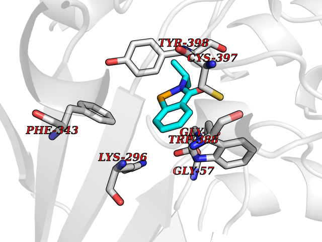 Target general information Gen name MAOB Organism Homo sapiens (Human) Uniprot ID TTD ID Synonyms MAO-B; Amine oxidase [flavin-containing] B Protein family Flavin monoamine oxidase family Biochemical class CH-NH(2) donor oxidoreductase Function Catalyzes the oxidative deamination of biogenic and xenobiotic amines and has important functions in the metabolism of neuroactive and vasoactive amines in the central nervous system and peripheral tissues. MAOB preferentially degrades benzylamine and phenylethylamine. Related diseases Microvascular complications of diabetes 5 (MVCD5) [MIM:612633]: Pathological conditions that develop in numerous tissues and organs as a consequence of diabetes mellitus. They include diabetic retinopathy, diabetic nephropathy leading to end-stage renal disease, and diabetic neuropathy. Diabetic retinopathy remains the major cause of new-onset blindness among diabetic adults. It is characterized by vascular permeability and increased tissue ischemia and angiogenesis. Disease susceptibility is associated with variants affecting the gene represented in this entry. Homozygosity for the Leu-55 allele is strongly associated with the development of retinal disease in diabetic patients. Drugs (DrugBank ID) DB08176; DB02211; DB08516; DB08480; DB01472; DB04307; DB07512; DB07513; DB00915; DB00182; DB06698; DB04889; DB00215; DB09130; DB04147; DB00988; DB01363; DB00668; DB01175; DB02509; DB03147; DB14914; DB00614; DB04818; DB02095; DB01247; DB00601; DB01577; DB01442; DB01171; DB08082; DB02643; DB04677; DB03894; DB08804; DB04820; DB00184; DB04821; DB12612; DB01626; DB00780; DB00191; DB00388; DB01132; DB00721; DB01168; DB01367; DB09363; DB06654; DB01037; DB01104; DB14569; DB09042; DB00752; DB16446; DB09185; DB04832; DB00909 Interacts with P55212; P28329-3; Q8NI60; Q5RI15; Q92915-2; P22607; Q53GS7; P06396; P01112; O14901; P13473-2; P21397; Q9BVL2; O75400-2; P62826; Q6NTF9-3; Q9Y371; Q7Z699; Q9UMX0; Q9Y649 EC number EC 1.4.3.4 Uniprot keywords 3D-structure; Acetylation; Alternative splicing; Direct protein sequencing; FAD; Flavoprotein; Membrane; Mitochondrion; Mitochondrion outer membrane; Oxidoreductase; Proteomics identification; Reference proteome; Transmembrane; Transmembrane helix Protein physicochemical properties Chain ID A,B Molecular weight (Da) 56019.9 Length 494 Aromaticity 0.09 Instability index 34.81 Isoelectric point 6.51 Charge (pH=7) -2.2 3D Binding mode Sequence NKCDVVVVGGGISGMAAAKLLHDSGLNVVVLEARDRVGGRTYTLRNQKVKYVDLGGSYVGPTQNRILRLAKELGLETYKVNEVERLIHHVKGKSYPFRGPFPPVWNPITYLDHNNFWRTMDDMGREIPSDAPWKAPLAEEWDNMTMKELLDKLCWTESAKQLATLFVNLCVTAETHEVSALWFLWYVKQCGGTTRIISTTNGGQERKFVGGSGQVSERIMDLLGDRVKLERPVIYIDQTRENVLVETLNHEMYEAKYVISAIPPTLGMKIHFNPPLPMMRNQMITRVPLGSVIKCIVYYKEPFWRKKDYCGTMIIDGEEAPVAYTLDDTKPEGNYAAIMGFILAHKARKLARLTKEERLKKLCELYAKVLGSLEALEPVHYEEKNWCEEQYSGGCYTTYFPPGILTQYGRVLRQPVDRIYFAGTETATHWSGYMEGAVEAGERAAREILHAMGKIPEDEIWQSEPESVDVPAQPITTTFLERHLPSVPGLLRLI Hydrogen bonds contact Hydrophobic contact | ||||