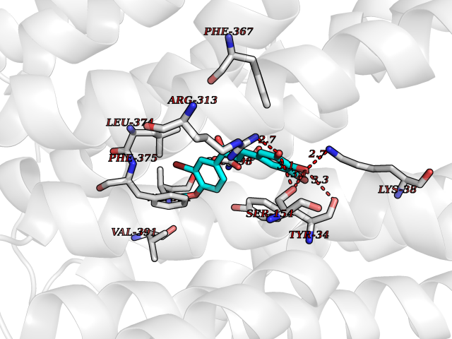 Target general information Gen name SLC16A1 Organism Homo sapiens (Human) Uniprot ID TTD ID Synonyms Solute carrier family 16 member 1; MCT1; MCT 1 Protein family Major facilitator superfamily, Monocarboxylate porter (TC 2.A.1.13) family Biochemical class Major facilitator Function Catalyzes the rapid transport across the plasma membrane of many monocarboxylates such as lactate, pyruvate, branched-chain oxo acids derived from leucine, valine and isoleucine, and the ketone bodies acetoacetate, beta-hydroxybutyrate and acetate. Depending on the tissue and on cicumstances, mediates the import or export of lactic acid and ketone bodies. Required for normal nutrient assimilation, increase of white adipose tissue and body weight gain when on a high-fat diet. Plays a role in cellular responses to a high-fat diet by modulating the cellular levels of lactate and pyruvate, small molecules that contribute to the regulation of central metabolic pathways and insulin secretion, with concomitant effects on plasma insulin levels and blood glucose homeostasis. Proton-coupled monocarboxylate transporter. Related diseases Symptomatic deficiency in lactate transport (SDLT) [MIM:245340]: Deficiency of lactate transporter may result in an acidic intracellular environment created by muscle activity with consequent degeneration of muscle and release of myoglobin and creatine kinase. This defect might compromise extreme performance in otherwise healthy individuals. {ECO:0000269|PubMed:10590411}. The disease is caused by variants affecting the gene represented in this entry.; DISEASE: Hyperinsulinemic hypoglycemia, familial, 7 (HHF7) [MIM:610021]: A form of hyperinsulinemic hypoglycemia, a clinically and genetically heterogeneous disorder characterized by inappropriate insulin secretion from the pancreatic beta-cells in the presence of low blood glucose levels. HHF7 features include exercise-induced hyperinsulinism, loss of consciousness due to hypoglycemia, and hypoglycemic seizures. HHF7 inheritance is autosomal dominant. {ECO:0000269|PubMed:17701893}. The disease is caused by variants affecting the gene represented in this entry.; DISEASE: Monocarboxylate transporter 1 deficiency (MCT1D) [MIM:616095]: A metabolic disorder characterized by recurrent ketoacidosis, a pathologic state due to ketone formation exceeding ketone utilization. The clinical consequences of ketoacidosis are vomiting, osmotic diuresis, dehydration, and Kussmaul breathing. The condition may progress to decreased consciousness and, ultimately, death. {ECO:0000269|PubMed:25390740}. The disease is caused by variants affecting the gene represented in this entry. Drugs (DrugBank ID) DB03166; DB01762; DB03773; DB04074; DB00345; DB00415; DB08892; DB03793; DB03066; DB07767; DB00529; DB01440; DB00142; DB04398; DB09338; DB00563; DB00731; DB00627; DB04552; DB00175; DB01032; DB00119; DB04216; DB00936; DB04348; DB00313 Interacts with Q66PJ3-4; Q92782-2; Q9UH65 EC number NA Uniprot keywords 3D-structure; Alternative splicing; Cell membrane; Disease variant; Membrane; Phosphoprotein; Proteomics identification; Reference proteome; Symport; Transmembrane; Transmembrane helix; Transport Protein physicochemical properties Chain ID A Molecular weight (Da) 40405.6 Length 375 Aromaticity 0.15 Instability index 32.61 Isoelectric point 9.12 Charge (pH=7) 10.98 3D Binding mode Sequence GGWGWAVVIGAFISIGFSYAFPKSITVFFKEIEGIFHATTSEVSWISSIMLAVMYGGGPISSILVNKYGSRIVMIVGGCLSGCGLIAASFCNTVQQLYVCIGVIGGLGLAFNLNPALTMIGKYFYKRRPLANGLAMAGSPVFLCTLAPLNQVFFGIFGWRGSFLILGGLLLNCCVAGALMRPIGPHRGFLLYLSGNVIMFFGLFAPLVFLSSYGKSQHYSSEKSAFLLSILAFVDMVARPSMGLVANTKPIRPRIQYFFAASVVANGVCHMLAPLSTTYVGFCVYAGFFGFAFGWLSSVLFETLMDLVGPQRFSSAVGLVTIVECCPVLLGPPLLGRLNDMYGDYKYTYWACGVVLIISGIYLFIGMGINYRLLA Hydrogen bonds contact Hydrophobic contact | ||||