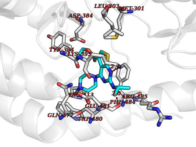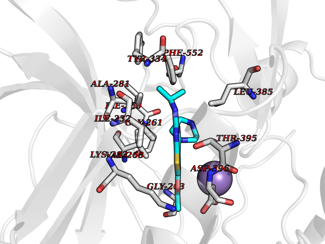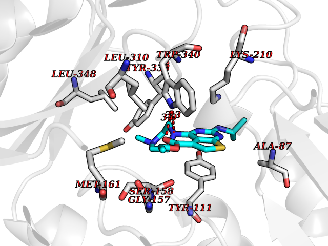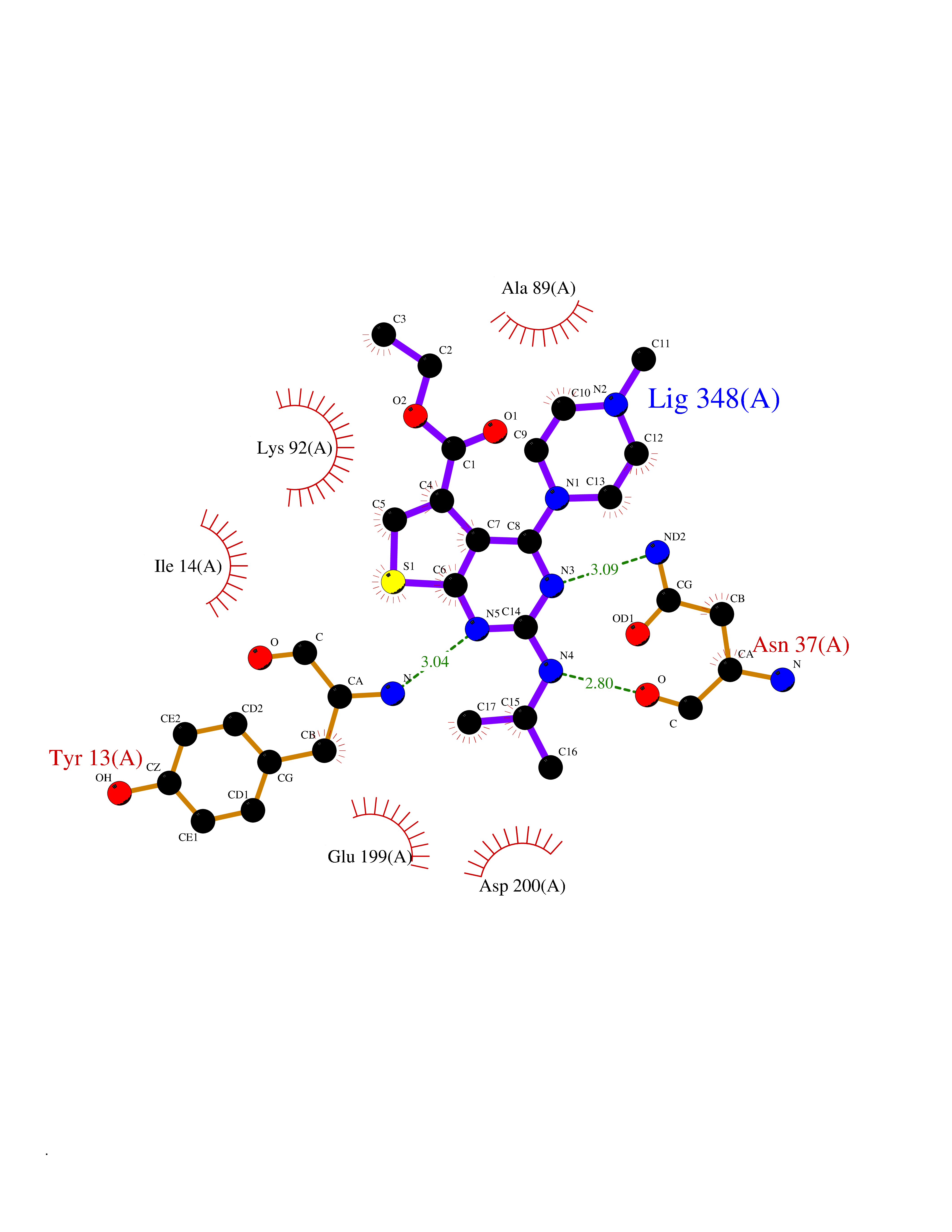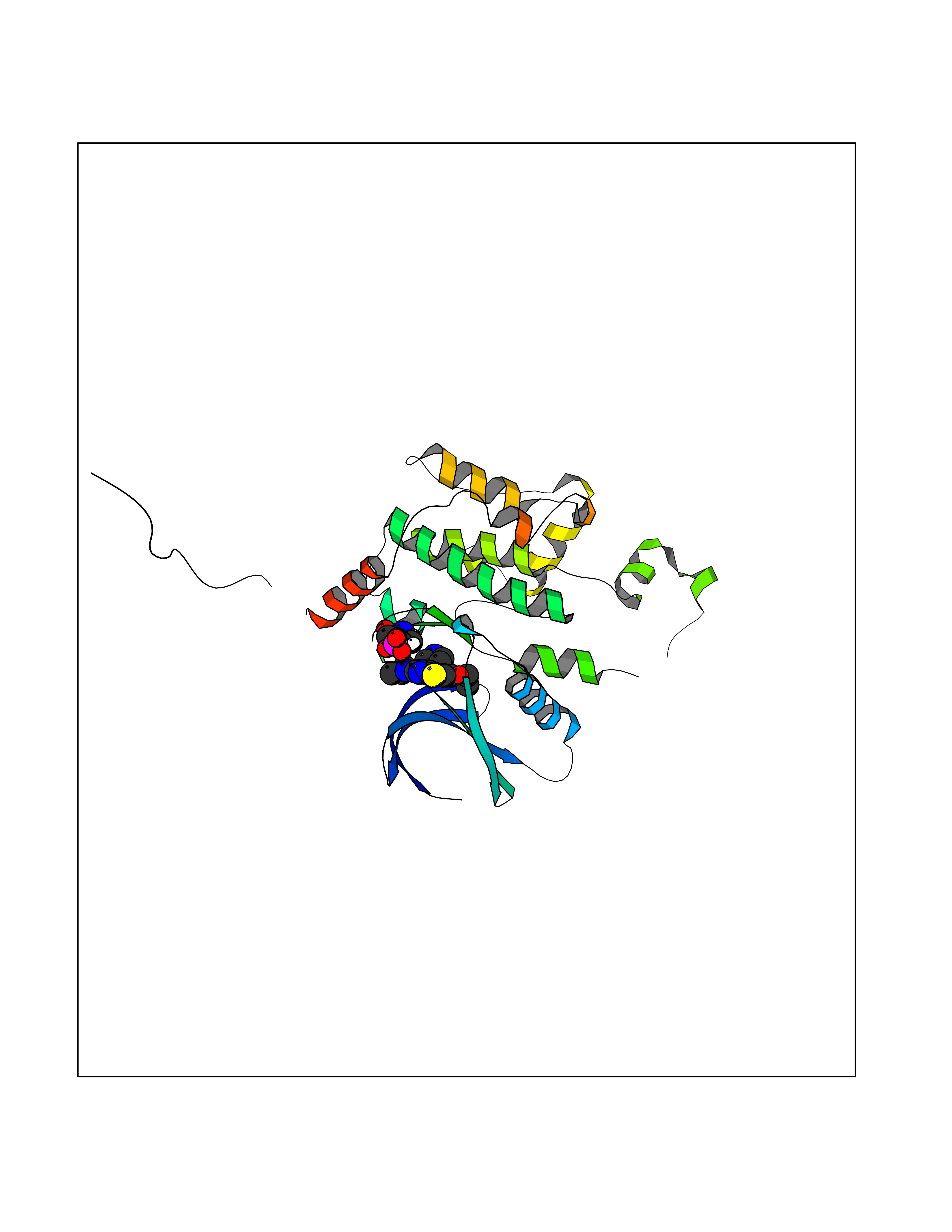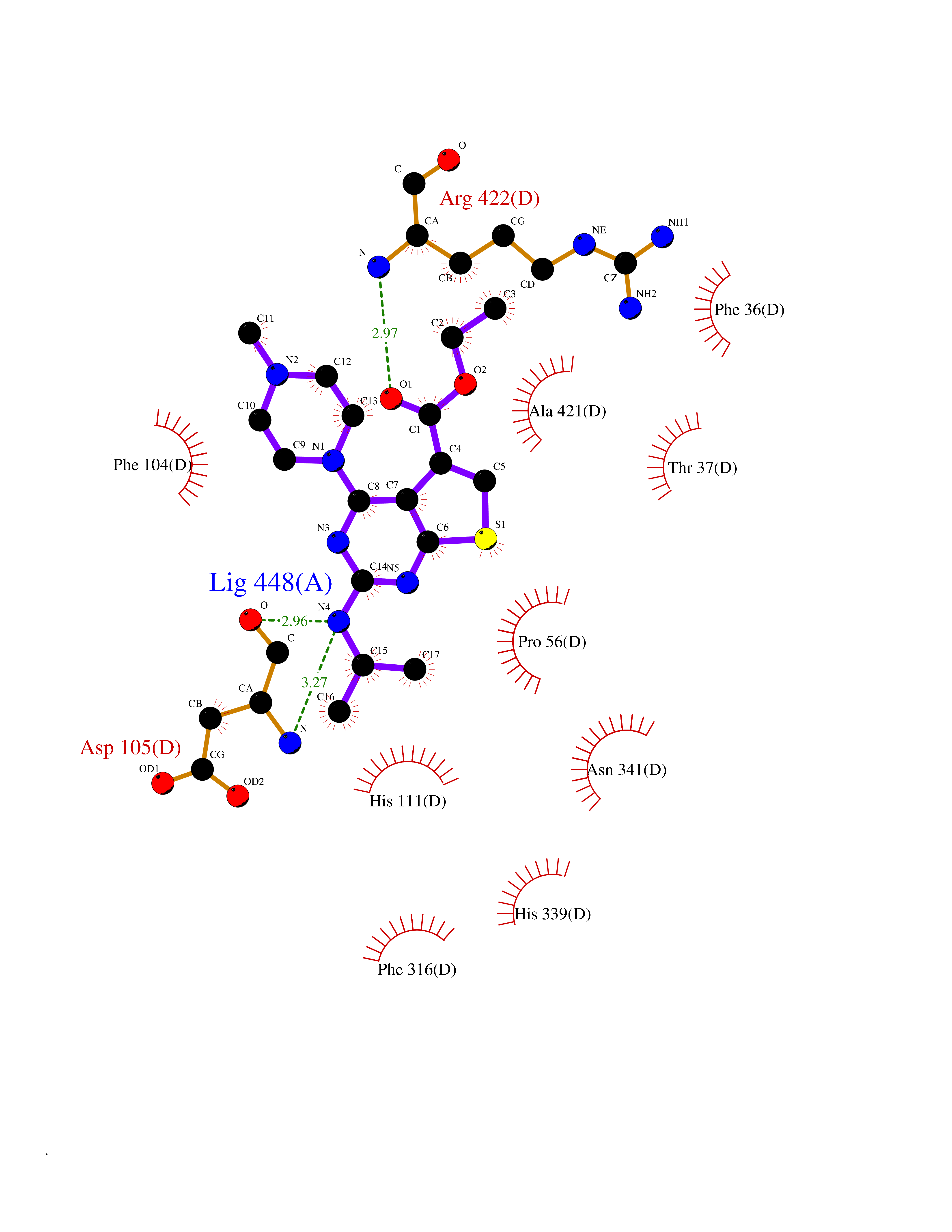 Target general information Gen name MAP4K3 Organism Homo sapiens (Human) Uniprot ID TTD ID Synonyms RAB8IPL1; Mitogen-activated protein kinase kinase kinase kinase 3; MEKKK 3; MAPK/ERK kinase kinase kinase 3; Germinal center kinase-related protein kinase; GLK Protein family Protein kinase superfamily, STE Ser/Thr protein kinase family, STE20 subfamily Biochemical class Kinase Function Appears to act upstream of the JUN N-terminal pathway. May play a role in the response to environmental stress. Related diseases A chromosomal aberration involving NPM1 is found in a form of non-Hodgkin lymphoma. Translocation t(2;5)(p23;q35) with ALK. The resulting chimeric NPM1-ALK protein homodimerize and the kinase becomes constitutively activated. {ECO:0000269|PubMed:8122112, ECO:0000269|PubMed:8633037}.; DISEASE: A chromosomal aberration involving NPM1 is found in a form of acute promyelocytic leukemia. Translocation t(5;17)(q32;q11) with RARA. {ECO:0000269|PubMed:8562957}.; DISEASE: A chromosomal aberration involving NPM1 is a cause of myelodysplastic syndrome (MDS). Translocation t(3;5)(q25.1;q34) with MLF1. {ECO:0000269|PubMed:8570204}.; DISEASE: Defects in NPM1 are associated with acute myelogenous leukemia (AML). Mutations in exon 12 affecting the C-terminus of the protein are associated with an aberrant cytoplasmic location. {ECO:0000269|PubMed:15659725}. Drugs (DrugBank ID) DB12010 Interacts with P62993; Q13094; Q9Y4K4; Q04759; Q02111 EC number EC 2.7.11.1 Uniprot keywords 3D-structure; Acetylation; Alternative splicing; ATP-binding; Kinase; Nucleotide-binding; Phosphoprotein; Proteomics identification; Reference proteome; Serine/threonine-protein kinase; Transferase Protein physicochemical properties Chain ID A Molecular weight (Da) 33570.4 Length 298 Aromaticity 0.09 Instability index 40.61 Isoelectric point 6.85 Charge (pH=7) -0.5 3D Binding mode Sequence SQEDFELIQRIGSGTYGDVYKARNVNTGELAAIKVIKLEPGEDFAVVQQEIIMMKDCKHPNIVAYFGSYLRRDKLWICMEFCGGGSLQDIYHVTGPLSELQIAYVSRETLQGLYYLHSKGKMHRDIKGANILLXDNGHVKLADFGVSAQITATIAAFIGTPYWMAPEVAAVERKGGYNQLCDLWAVGITAIELAELQPPMFDLHPMRALFLMTKSNFQPPKLKDKMKWSNSFHHFVKMALTKNPKKRPTAEKLLQHPFVTQHLTRSLAIELLDKVNNPSTYHDFDDDDPEPLVAVPHR Hydrogen bonds contact Hydrophobic contact | ||||