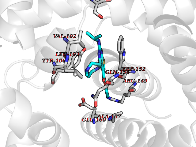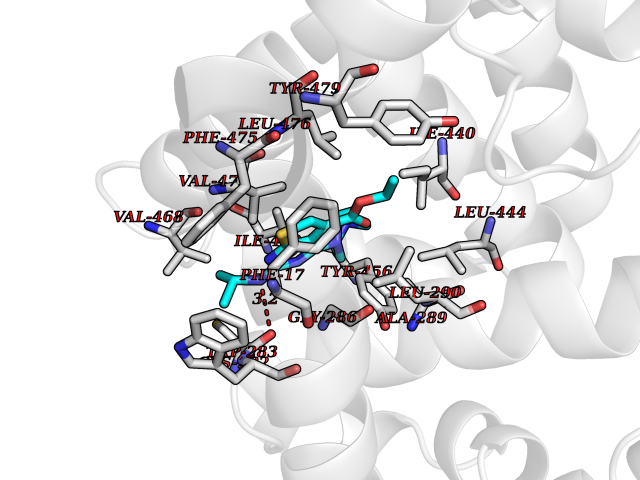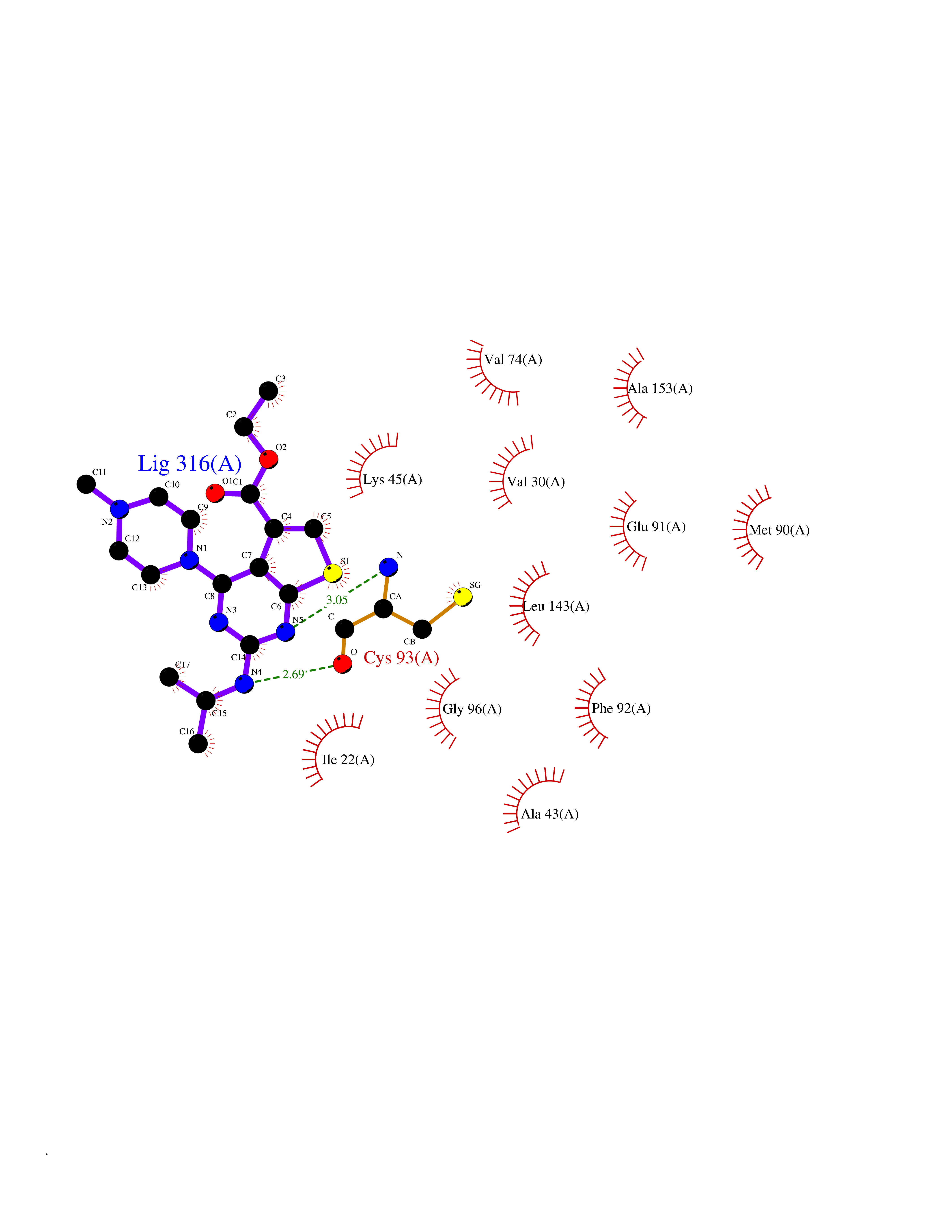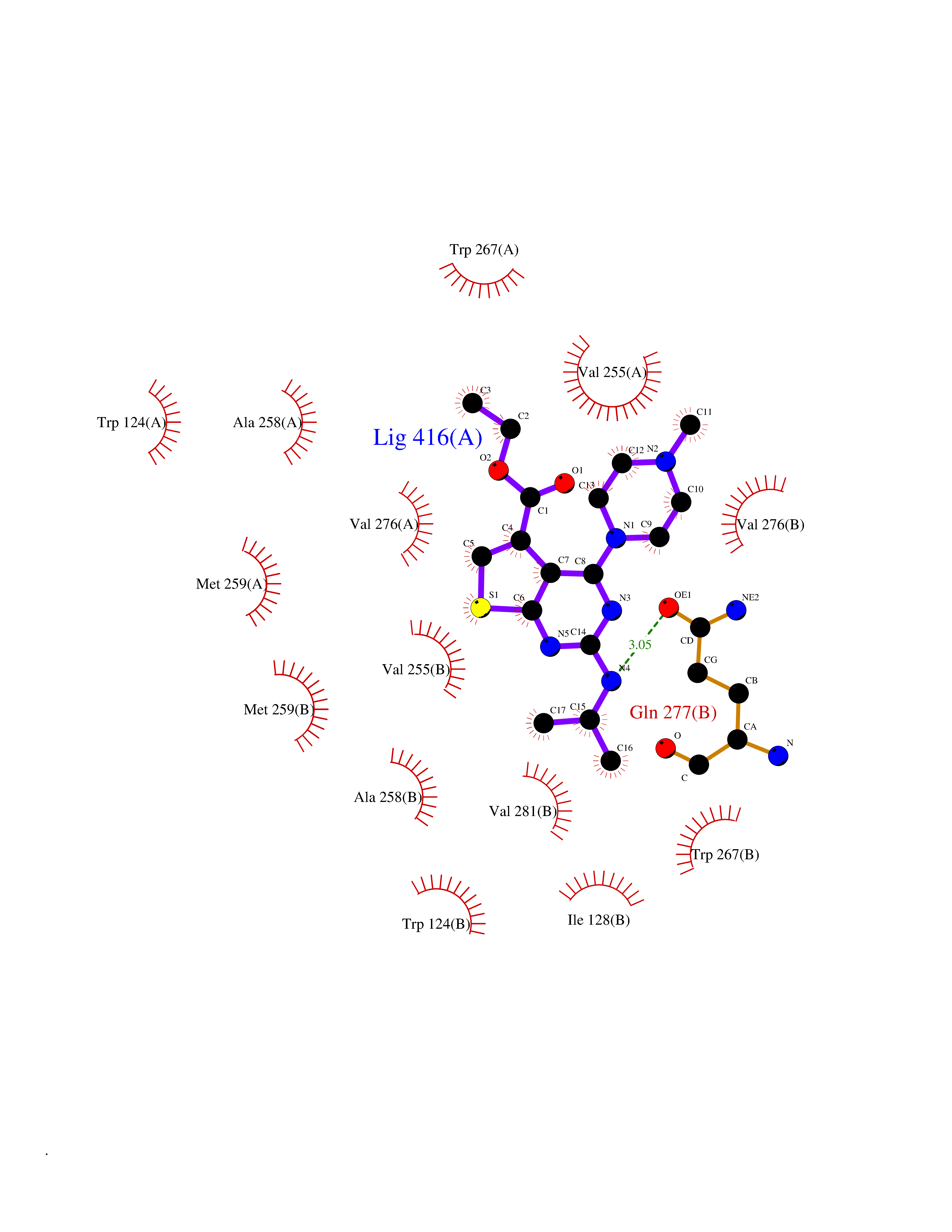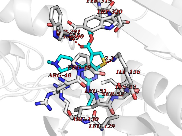 Target general information Gen name HHAT Organism Homo sapiens (Human) Uniprot ID TTD ID Synonyms Skinny hedgehog protein 1; Melanoma antigen recognized by T-cells 2; MART-2; Hedgehog acyltransferase; HHAT Protein family Membrane-bound acyltransferase family, HHAT subfamily Biochemical class Acyltransferase Function Catalyzes N-terminal palmitoylation of SHH; which is required for SHH signaling. May bind GTP. . Related diseases Nivelon-Nivelon-Mabille syndrome (NNMS) [MIM:600092]: An autosomal recessive syndrome characterized by progressive microcephaly, cerebellar vermis hypoplasia, and skeletal dysplasia. Additional variable features include early infantile-onset seizures, intrauterine and postnatal growth retardation, generalized chondrodysplasia, and micromelia. 46,XY gonadal dysgenesis may be present. {ECO:0000269|PubMed:24784881, ECO:0000269|PubMed:30912300}. The disease is caused by variants affecting the gene represented in this entry. Drugs (DrugBank ID) NA Interacts with O00560 EC number EC 2.3.1.- Uniprot keywords 3D-structure; Acyltransferase; Alternative splicing; Developmental protein; Disease variant; Dwarfism; Endoplasmic reticulum; Golgi apparatus; GTP-binding; Lipoprotein; Membrane; Nucleotide-binding; Palmitate; Proteomics identification; Reference proteome; Transferase; Transmembrane; Transmembrane helix Protein physicochemical properties Chain ID A Molecular weight (Da) 57096.2 Length 491 Aromaticity 0.17 Instability index 42.88 Isoelectric point 7.18 Charge (pH=7) 0.62 3D Binding mode Sequence MLPRWELALYLLASLGFHFYSFYEVYKVSREHEEELDQEFELETDTLFGGLKKDATDFEWSFWMEWGKQWLVWLLLGHMVVSQMATLLARKHRPWILMLYGMWACWCVLGTPGVAMVLLHTTISFCVAQFRSQLLTWLCSLLLLSTLRLQGVEEVKRRWYKTENEYYLLQFTLTVRCLYYTSFSLELCWQQLPAASTSYSFPWMLAYVFYYPVLHNGPILSFSEFIKQMQQQEHDSLKASLCVLALGLGRLLCWWWLAELMAHLMYMHAIYSSIPLLETVSCWTLGGLALAQVLFFYVKYLVLFGVPALLMRLDGLTPPALPRCVSTMFSFTGMWRYFDVGLHNFLIRYVYIPVGGSQHGLLGTLFSTAMTFAFVSYWHGGYDYLWCWAALNWLGVTVENGVRRLVETPCIQDSLARYFSPQARRRFHAALASCSTSMLILSNLVFLGGNEVGKTYWNRIFIQGWPWVTLSVLGFLYCYSHVGIAWAQTYA Hydrogen bonds contact Hydrophobic contact | ||||
