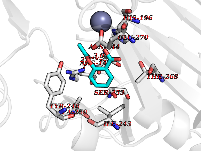 Target general information Gen name CPA1 Organism Homo sapiens (Human) Uniprot ID TTD ID Synonyms CPA Protein family Peptidase M14 family Biochemical class Peptidase Function Carboxypeptidase that catalyzes the release of a C-terminal amino acid, but has little or no action with -Asp, -Glu, -Arg, -Lys or -Pro. Related diseases Spinocerebellar ataxia, autosomal recessive, with axonal neuropathy 1 (SCAN1) [MIM:607250]: A form of spinocerebellar ataxia, a clinically and genetically heterogeneous group of cerebellar disorders. Patients show progressive incoordination of gait and often poor coordination of hands, speech and eye movements, due to degeneration of the cerebellum with variable involvement of the brainstem and spinal cord. SCAN1 is an autosomal recessive cerebellar ataxia (ARCA) associated with peripheral axonal motor and sensory neuropathy, distal muscular atrophy, pes cavus and steppage gait as seen in Charcot-Marie-Tooth neuropathy. All affected individuals have normal intelligence. {ECO:0000269|PubMed:12244316, ECO:0000269|PubMed:15647511, ECO:0000269|PubMed:15920477, ECO:0000269|PubMed:16141202, ECO:0000269|PubMed:17948061}. The disease is caused by variants affecting the gene represented in this entry. Drugs (DrugBank ID) DB06924; DB07484; DB02494; DB03441; DB04316; DB03201; DB11095; DB02652; DB07506; DB04058; DB07351; DB08762; DB08368; DB03012 Interacts with P19399 EC number EC 3.4.17.1 Uniprot keywords 3D-structure; Carboxypeptidase; Direct protein sequencing; Disulfide bond; Hydrolase; Metal-binding; Metalloprotease; Protease; Proteomics identification; Reference proteome; Secreted; Signal; Zinc; Zymogen Protein physicochemical properties Chain ID A Molecular weight (Da) 44660.7 Length 396 Aromaticity 0.12 Instability index 25.06 Isoelectric point 5.23 Charge (pH=7) -15.98 3D Binding mode Sequence KEDFVGHQVLRISVADEAQVQKVKELEDLEHLQLDFWRGPAHPGSPIDVRVPFPSIQAVKIFLESHGISYETMIEDVQSLLDEEQEQMFRSTDTFNYATYHTLEEIYDFLDLLVAENPHLVSKIQIGNTYEGRPIYVLKFSTGGSKRPAIWIDTGIHSREWVTQASGVWFAKKITQDYGQDAAFTAILDTLDIFLEIVTNPDGFAFTHSTNRMWRKTRSHTAGSLCIGVDPNRNWDAGFGLSGASSNPCSETYHGKFANSEVEVKSIVDFVKDHGNIKAFISIHSYSQLLMYPYGYKTEPVPDQDELDQLSKAAVTALASLYGTKFNYGSIIKAIYQASGSTIDWTYSQGIKYSFTFELRDTGRYGFLLPASQIIPTAKETWLALLTIMEHTLNHP Hydrogen bonds contact Hydrophobic contact | ||||