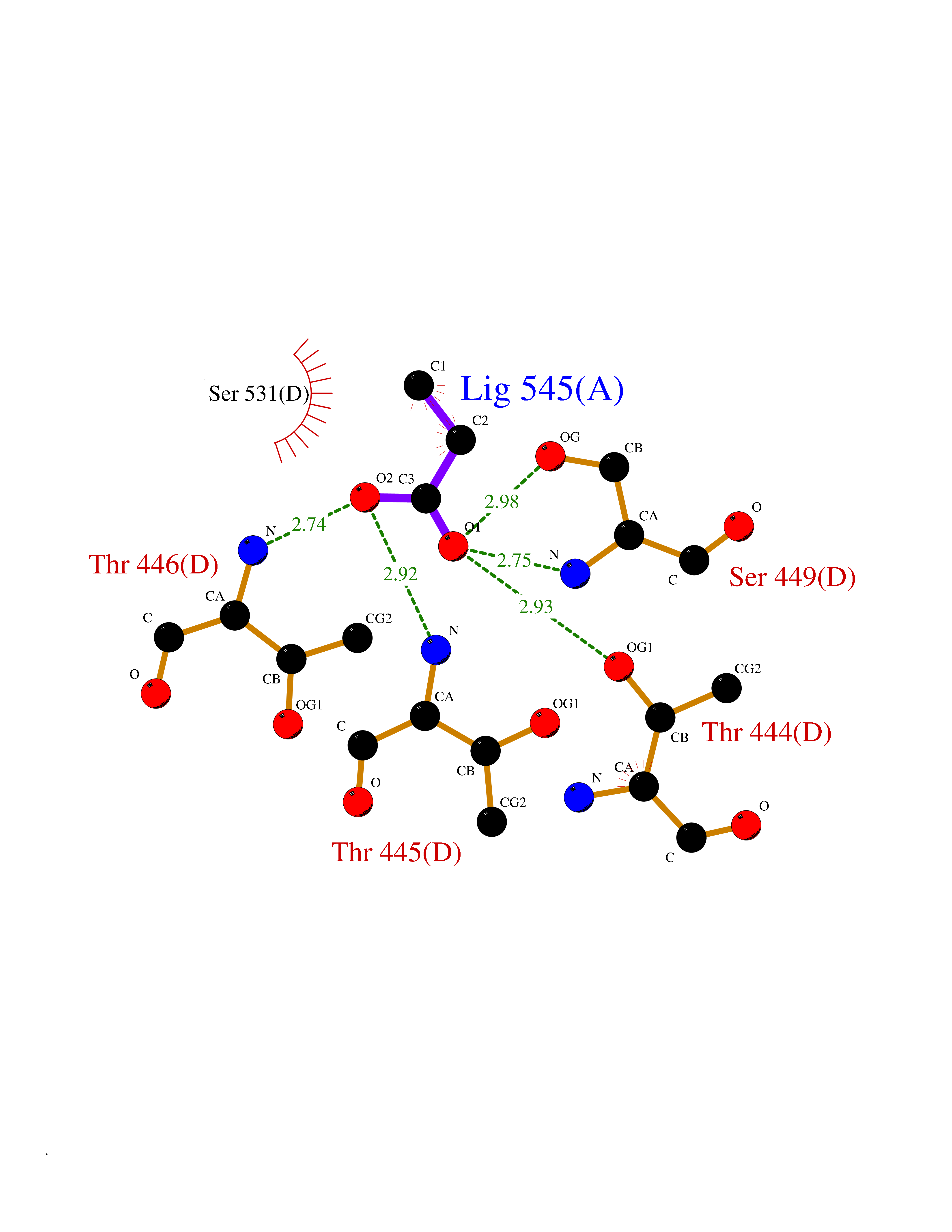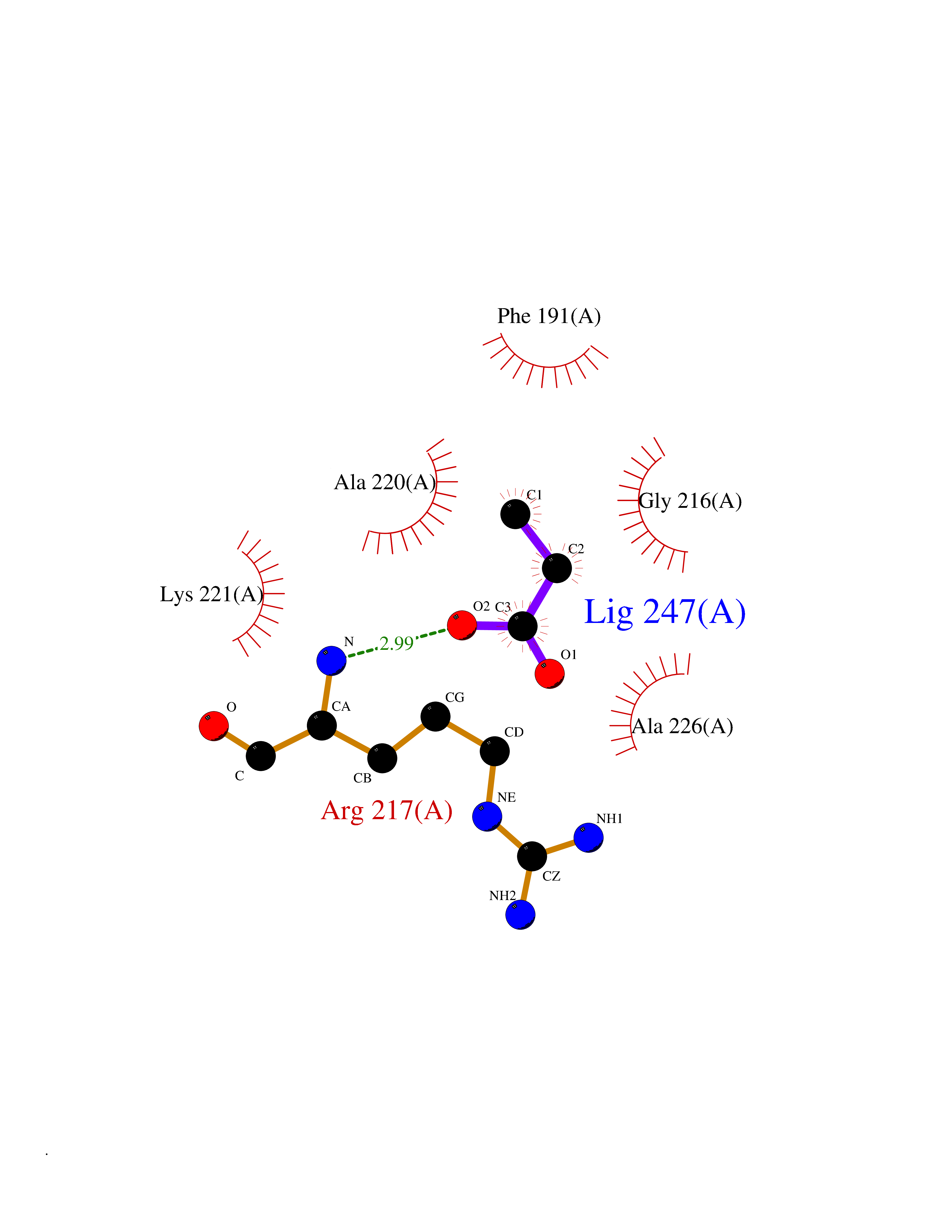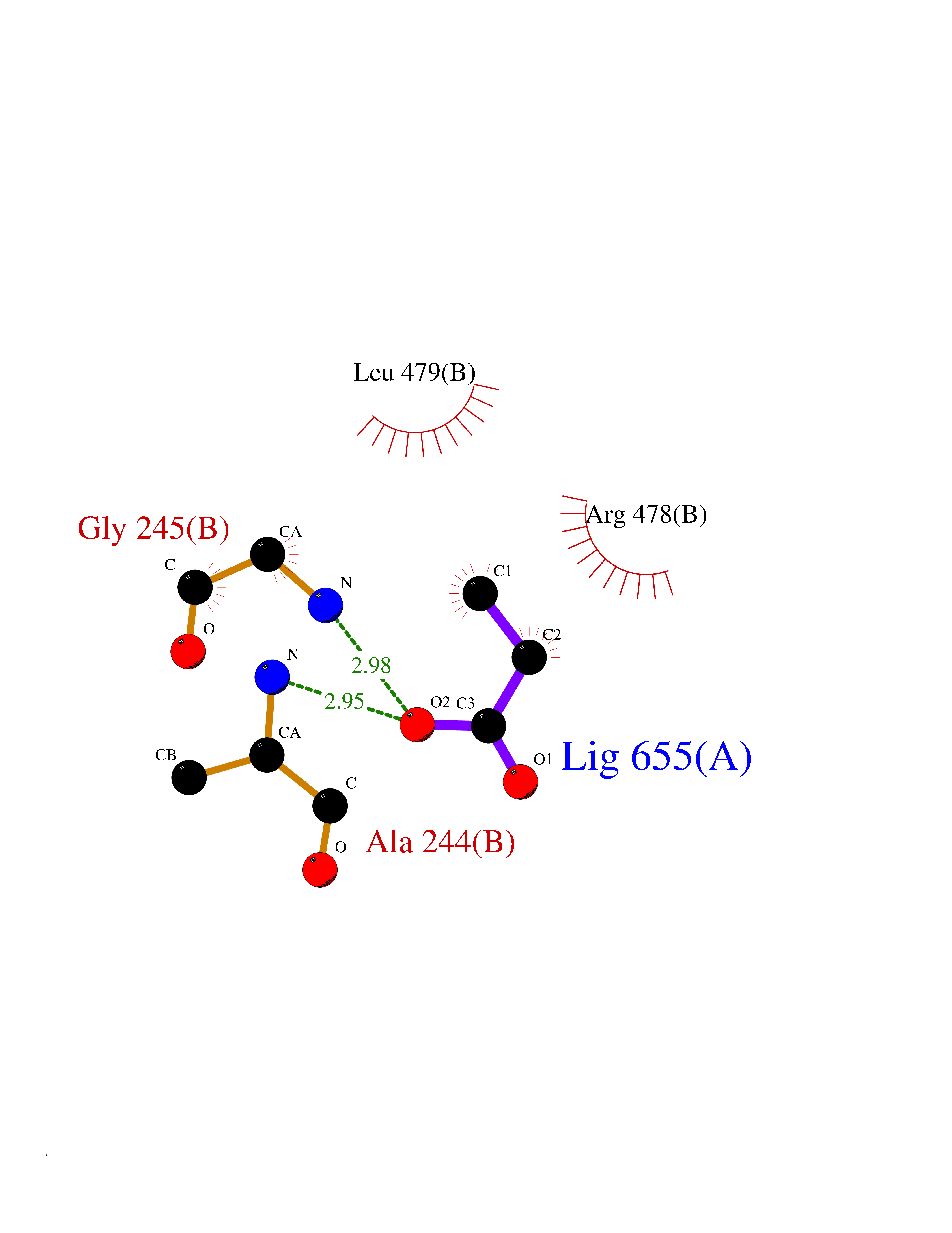 Target general information Gen name AGXT Organism Homo sapiens (Human) Uniprot ID TTD ID NA Synonyms AGT1;SPAT Protein family Class-V pyridoxal-phosphate-dependent aminotransferase family Biochemical class Transferase Function Alanine-glyoxylate transaminase activity.Amino acid binding.Identical protein binding.Protein homodimerization activity.Protein self-association.Pyridoxal phosphate binding.Receptor binding.Serine-pyruvate transaminase activity.Transaminase activity. Related diseases Hyperoxaluria primary 1 (HP1) [MIM:259900]: An inborn error of glyoxylate metabolism characterized by increased excretion of oxalate and glycolate, and progressive tissue accumulation of insoluble calcium oxalate. Affected individuals are at risk for nephrolithiasis, nephrocalcinosis and early onset end-stage renal disease. {ECO:0000269|PubMed:10394939, ECO:0000269|PubMed:10453743, ECO:0000269|PubMed:10541294, ECO:0000269|PubMed:10862087, ECO:0000269|PubMed:10960483, ECO:0000269|PubMed:12559847, ECO:0000269|PubMed:12777626, ECO:0000269|PubMed:1301173, ECO:0000269|PubMed:1349575, ECO:0000269|PubMed:15253729, ECO:0000269|PubMed:15849466, ECO:0000269|PubMed:15961946, ECO:0000269|PubMed:15963748, ECO:0000269|PubMed:16971151, ECO:0000269|PubMed:1703535, ECO:0000269|PubMed:17495019, ECO:0000269|PubMed:2039493, ECO:0000269|PubMed:23229545, ECO:0000269|PubMed:24055001, ECO:0000269|PubMed:24934730, ECO:0000269|PubMed:26149463, ECO:0000269|PubMed:8101040, ECO:0000269|PubMed:9192270, ECO:0000269|PubMed:9604803}. The disease is caused by variants affecting the gene represented in this entry. Drugs (DrugBank ID) DB08060; DB00160; DB02079; DB00145; DB04083; DB00114; DB00133 Interacts with Q5BKX5-3; P21549; P0C7T5; Q9NR55; Q9H5F2; Q9UKJ5; A8MQ03; O43281-2; A1KXE4-2; Q5TD97; P49356; P53539; P49639; Q15323; O76011; O76014; Q6A162; Q07627; P60328; Q9BYR8; Q3LI67; Q8IUC2; Q9BYQ4; O60711; Q99750; Q5VZ52; P0DPK4; O43482; P50542-1; O15496; Q6ZR37; Q9NQX0; Q8HWS3; Q5W111-2; Q8WVR3; Q6DKK2 EC number 2.6.1.44; 2.6.1.51 Uniprot keywords 3D-structure; Acetylation; Aminotransferase; Disease variant; Peroxisome; Phosphoprotein; Proteomics identification; Pyridoxal phosphate; Reference proteome; Transferase Protein physicochemical properties Chain ID A,B Molecular weight (Da) 84537 Length 771 Aromaticity 0.07 Instability index 36.81 Isoelectric point 8.42 Charge (pH=7) 6.81 3D Binding mode Sequence LLVTPPKALLKPLSIPNQLLLGPGPSNLPPRIMAAGGLQMIGSMSKDMYQIMDEIKEGIQYVFQTRNPLTLVISGSGHCALEAALVNVLEPGDSFLVGANGIWGQRAVDIGERIGARVHPMTKDPGGHYTLQEVEEGLAQHKPVLLFLTHGESSTGVLQPLDGFGELCHRYKCLLLVDSVASLGGTPLYMDRQGIDILYSGSQKALNAPPGTSLISFSDKAKKKMYSRKTKPFSFYLDIKWLANFWGCDDQPRMYHHTIPVISLYSLRESLALIAEQGLENSWRQHREAAAYLHGRLQALGLQLFVKDPALRLPTVTTVAVPAGYDWRDIVSYVIDHFDIEIMGGLGPSTGKVLRIGLLGCNATRENVDRVTEALRAALQHCPKKLLVTPPKALLKPLSIPNQLLLGPGPSNLPPRIMAAGGLQMIGSMSKDMYQIMDEIKEGIQYVFQTRNPLTLVISGSGHCALEAALVNVLEPGDSFLVGANGIWGQRAVDIGERIGARVHPMTKDPGGHYTLQEVEEGLAQHKPVLLFLTHGESSTGVLQPLDGFGELCHRYKCLLLVDSVASLGGTPLYMDRQGIDILYSGSQKALNAPPGTSLISFSDKAKKKMYSRKTKPFSFYLDIKWLANFWGCDDQPRMYHHTIPVISLYSLRESLALIAEQGLENSWRQHREAAAYLHGRLQALGLQLFVKDPALRLPTVTTVAVPAGYDWRDIVSYVIDHFDIEIMGGLGPSTGKVLRIGLLGCNATRENVDRVTEALRAALQHCPKKK Hydrogen bonds contact Hydrophobic contact | ||||