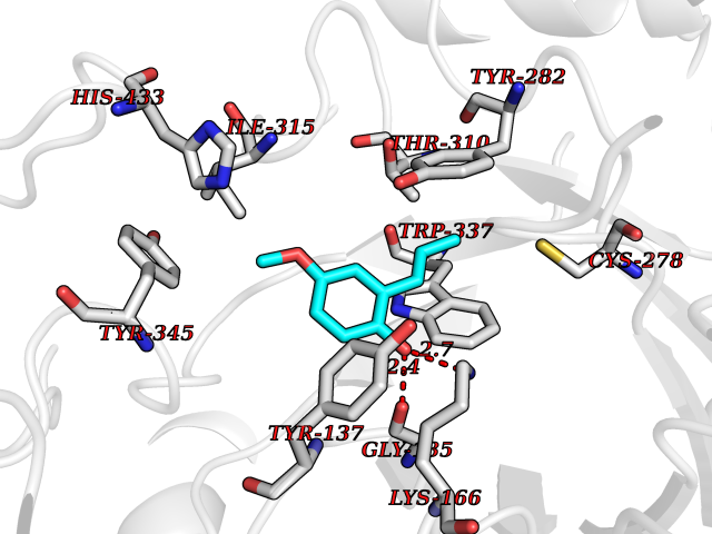 Target general information Gen name HRH3 Organism Homo sapiens (Human) Uniprot ID TTD ID Synonyms Histamine receptor 3; HH3R; GPCR97; G-protein coupled receptor 97; G protein-coupled receptor 97 Protein family G-protein coupled receptor 1 family Biochemical class GPCR rhodopsin Function Signals through the inhibition of adenylate cyclase and displays high constitutive activity (spontaneous activity in the absence of agonist). Agonist stimulation of isoform 3 neither modified adenylate cyclase activity nor induced intracellular calcium mobilization. The H3 subclass of histamine receptors could mediate the histamine signals in CNS and peripheral nervous system. Related diseases Immunodeficiency 48 (IMD48) [MIM:269840]: A form of severe immunodeficiency characterized by a selective absence of CD8+ T-cells. {ECO:0000269|PubMed:11123350, ECO:0000269|PubMed:11412303, ECO:0000269|PubMed:18509675, ECO:0000269|PubMed:8124727, ECO:0000269|PubMed:8202713}. The disease is caused by variants affecting the gene represented in this entry.; DISEASE: Autoimmune disease, multisystem, infantile-onset, 2 (ADMIO2) [MIM:617006]: An autosomal recessive, autoimmune disorder characterized by systemic manifestations including blistering skin disease, uncontrollable bullous pemphigoid, inflammatory colitis, autoimmune hypothyroidism, proteinuria and nephrotic syndrome. {ECO:0000269|PubMed:26783323}. The disease is caused by variants affecting the gene represented in this entry. Drugs (DrugBank ID) DB01238; DB06698; DB05381; DB17087; DB05080; DB00768; DB11642 Interacts with NA EC number NA Uniprot keywords 3D-structure; Alternative splicing; Cell membrane; Disulfide bond; G-protein coupled receptor; Glycoprotein; Membrane; Phosphoprotein; Proteomics identification; Receptor; Reference proteome; Transducer; Transmembrane; Transmembrane helix Protein physicochemical properties Chain ID A Molecular weight (Da) 34321.1 Length 301 Aromaticity 0.16 Instability index 32.22 Isoelectric point 9.63 Charge (pH=7) 15.11 3D Binding mode Sequence RGFSAAWTAVLAALMALLIVATVLGNALVMLAFVADSSLRTQNNFFLLNLAISDFLVGAFCIPLYVPYVLTGRWTFGRGLCKLWLVVDYLLCTSKAFNIVLISYDRFLSVTRAVSYRAQQGDTRRAVRKMLLVWVLAFLLYGPAILSWEYLSGGSSIPEGHCYAEFFYNWYFLITASTLEFFTPFLSVTFFNLSIYLNIQRRTRLRLDGAREAAGRFRLSRDRKVAKSLAVIVSIFGLCWAPYTLLMIIRAACHGHCVPDYWYETSFWLLWANSAVNPVLYPLCHHSFRRAFTKLLCPQKL Hydrogen bonds contact Hydrophobic contact | ||||