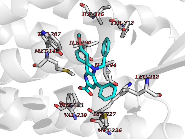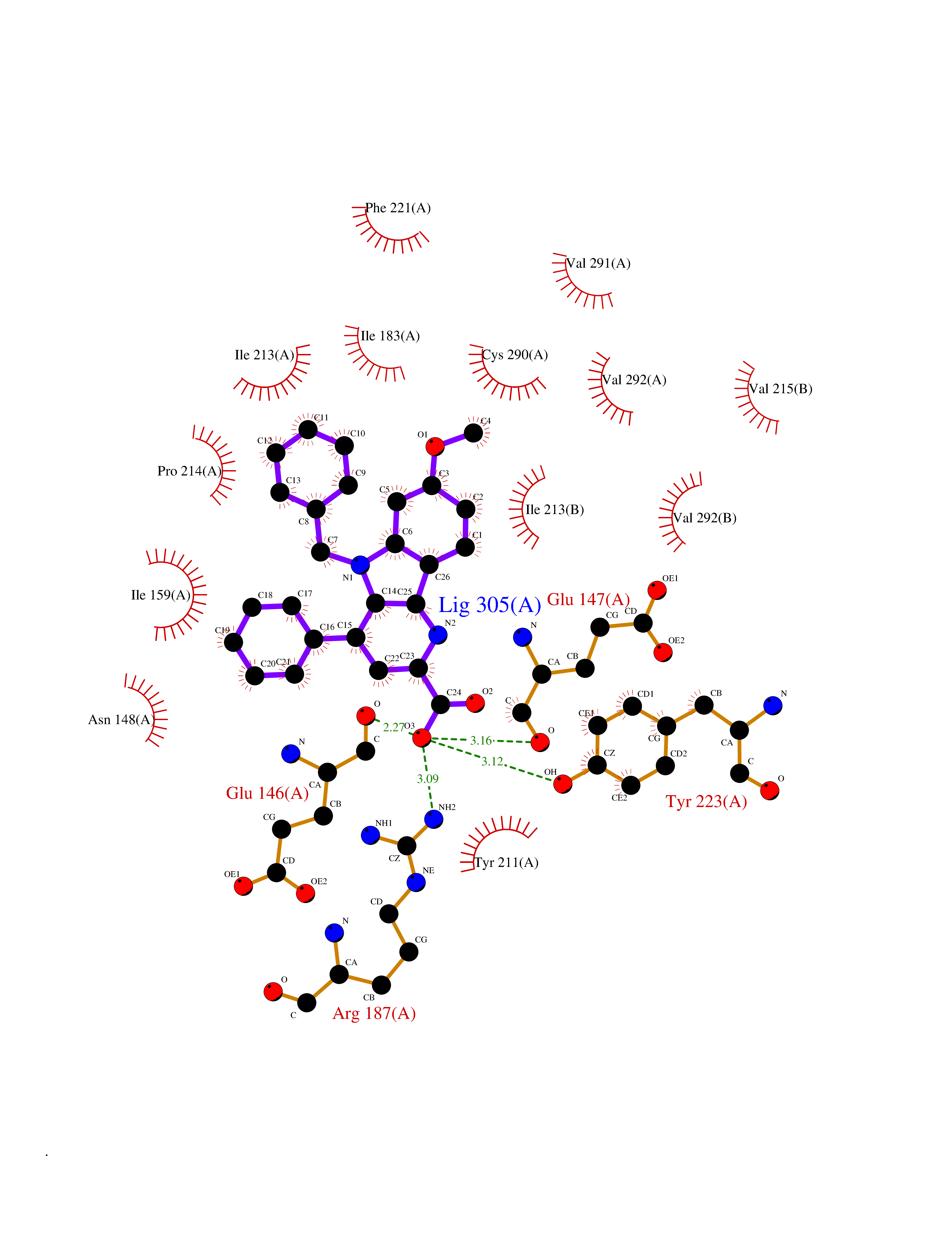 | Target general information Gen name OPRK1 Organism Homo sapiens (Human) Uniprot ID TTD ID Synonyms OPRK; Kappa-type opioid receptor; Kappa opioid receptor; KOR-1; KOR; K-OR-1 Protein family G-protein coupled receptor 1 family Biochemical class GPCR rhodopsin Function Functions as receptor for various synthetic opioids and for the psychoactive diterpene salvinorin A. Ligand binding causes a conformation change that triggers signaling via guanine nucleotide-binding proteins (G proteins) and modulates the activity of down-stream effectors, such as adenylate cyclase. Signaling leads to the inhibition of adenylate cyclase activity. Inhibits neurotransmitter release by reducing calcium ion currents and increasing potassium ion conductance. Plays a role in the perception of pain. Plays a role in mediating reduced physical activity upon treatment with synthetic opioids. Plays a role in the regulation of salivation in response to synthetic opioids. May play a role in arousal and regulation of autonomic and neuroendocrine functions. G-protein coupled opioid receptor that functions as receptor for endogenous alpha-neoendorphins and dynorphins, but has low affinity for beta-endorphins. Related diseases Defects in PPARG can lead to type 2 insulin-resistant diabetes and hyptertension. PPARG mutations may be associated with colon cancer. {ECO:0000269|PubMed:10394368}.; DISEASE: Obesity (OBESITY) [MIM:601665]: A condition characterized by an increase of body weight beyond the limitation of skeletal and physical requirements, as the result of excessive accumulation of body fat. {ECO:0000269|PubMed:9753710}. Disease susceptibility may be associated with variants affecting the gene represented in this entry.; DISEASE: Lipodystrophy, familial partial, 3 (FPLD3) [MIM:604367]: A form of lipodystrophy characterized by marked loss of subcutaneous fat from the extremities. Facial adipose tissue may be increased, decreased or normal. Affected individuals show an increased preponderance of insulin resistance, diabetes mellitus and dyslipidemia. {ECO:0000269|PubMed:11788685, ECO:0000269|PubMed:12453919}. The disease is caused by variants affecting the gene represented in this entry.; DISEASE: Glioma 1 (GLM1) [MIM:137800]: Gliomas are benign or malignant central nervous system neoplasms derived from glial cells. They comprise astrocytomas and glioblastoma multiforme that are derived from astrocytes, oligodendrogliomas derived from oligodendrocytes and ependymomas derived from ependymocytes. {ECO:0000269|PubMed:10851250}. Disease susceptibility may be associated with variants affecting the gene represented in this entry. Polymorphic PPARG alleles have been found to be significantly over-represented among a cohort of American patients with sporadic glioblastoma multiforme suggesting a possible contribution to disease susceptibility. Drugs (DrugBank ID) DB01571; DB01439; DB05443; DB06274; DB06288; DB00321; DB01238; DB05104; DB00289; DB00921; DB00611; DB09173; DB01535; DB00318; DB05155; DB00514; DB00647; DB01209; DB01452; DB11938; DB01565; DB01548; DB09272; DB01497; DB00813; DB00327; DB01221; DB06738; DB00555; DB00825; DB00854; DB00836; DB14146; DB00454; DB06800; DB06148; DB00370; DB00295; DB06409; DB00844; DB11691; DB06230; DB01183; DB00704; DB11130; DB00497; DB00652; DB11186; DB09209; DB00396; DB00899; DB12543; DB00708; DB06204; DB00193; DB05046 Interacts with P35414; Q9H0R8; Q16617 EC number NA Uniprot keywords 3D-structure; Alternative splicing; Behavior; Cell membrane; Disulfide bond; G-protein coupled receptor; Glycoprotein; Lipoprotein; Membrane; Palmitate; Proteomics identification; Receptor; Reference proteome; Transducer; Transmembrane; Transmembrane helix Protein physicochemical properties Chain ID A,B Molecular weight (Da) 29386.8 Length 261 Aromaticity 0.14 Instability index 33.75 Isoelectric point 7.45 Charge (pH=7) 0.55 3D Binding mode Sequence SPAIPVIITAVYSVVFVVGLVGNSLVMFVIIRYTKMKTATNIYIFNLALADALVTTTMPFQSTVYLMNSWPFGDVLCKIVLSIDYYNMFTSIFTLTMMSVDRYIAVCHPVKALDFRTPLKAKIINICIWLLSSSVGISAIVLGGTKVREDVDVIECSLQFPDDDYSWWDLFMKICVFIFAFVIPVLIIIVCYTLRRITRLVLVVVAVFVVCWTPIHIFILVEALGSTAALSSYYFCIALGYTNSSLNPILYAFLDENFKRC Hydrogen bonds contact Hydrophobic contact | ||||