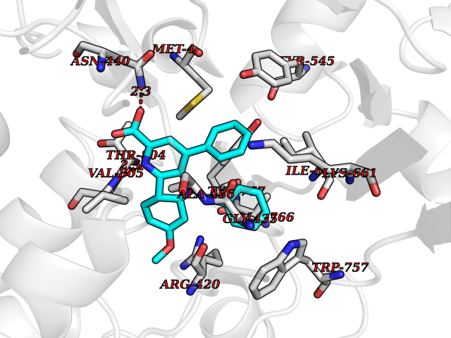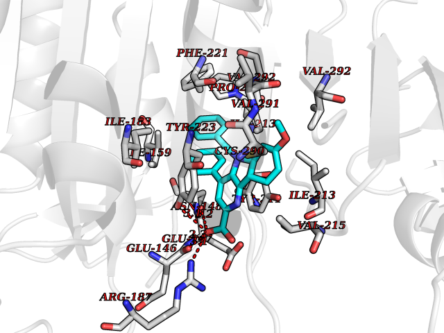 | Target general information Gen name VKORC1 Organism Homo sapiens (Human) Uniprot ID TTD ID Synonyms Vitamin K1 2,3-epoxide reductase subunit 1; VKORC1; VKOR; UNQ308/PRO351; MSTP576; MSTP134 Protein family VKOR family Biochemical class Short-chain dehydrogenases reductase Function Involved invitamin K metabolism. Catalytic subunit of the vitamin K epoxide reductase (VKOR) complex which reduces inactive vitamin K 2,3-epoxide to active vitamin K. Vitamin K is required for the gamma-carboxylation of various proteins, including clotting factors, and is required for normal blood coagulation, but also for normal bone development. Related diseases Combined deficiency of vitamin K-dependent clotting factors 2 (VKCFD2) [MIM:607473]: VKCFD leads to a bleeding tendency that is usually reversed by oral administration of vitamin K. {ECO:0000269|PubMed:14765194, ECO:0000269|PubMed:16270630}. The disease is caused by variants affecting the gene represented in this entry.; DISEASE: Coumarin resistance (CMRES) [MIM:122700]: A condition characterized by partial or complete resistance to warfarin or other 4-hydroxycoumarin derivatives. These drugs are used as anti-coagulants for the prevention of thromboembolic diseases in subjects with deep vein thrombosis, atrial fibrillation, or mechanical heart valve replacement. {ECO:0000269|PubMed:14765194, ECO:0000269|PubMed:20946155}. The disease is caused by variants affecting the gene represented in this entry. Drugs (DrugBank ID) DB01418; DB00266; DB09332; DB00170; DB00498; DB00946; DB01022; DB00682 Interacts with Q13323; Q7Z7G2; Q96BA8; Q9Y282; Q5JX71; Q96KR6; Q5T7V8; Q8TDT2; Q9NQG1; P15941-11; Q96TC7; Q9NR31; A0A0S2Z4U3; Q8TBB6; O15393-2; Q19QW4 EC number EC 1.17.4.4 Uniprot keywords 3D-structure; Alternative splicing; Disease variant; Disulfide bond; Endoplasmic reticulum; Membrane; Oxidoreductase; Proteomics identification; Quinone; Redox-active center; Reference proteome; Transmembrane; Transmembrane helix Protein physicochemical properties Chain ID A Molecular weight (Da) 42656.4 Length 381 Aromaticity 0.1 Instability index 32.12 Isoelectric point 7.73 Charge (pH=7) 1.93 3D Binding mode Sequence KGEELFTGVVPILVELDGDVNGHKFSVRGEGEGDATNGKLTLKFICTTGKLPVPWPTLVTTLXVQCFSRYPDHMKRHDFFKSAMPEGYVQERTISFKDDGTYKTRAEVKFEGDTLVNRIELKGIDFKEDGNILGHKLEYNSTWGSPGWVRLALCLTGLVLSLYALHVKAARARDRDYRALCDVGTAISCSRVFSSRWGRGFGLVEHVLGQDSILNQSNSIFGCIFYTLQLLLGCLRTRWASVLMLLSSLVSLAGSVYLAWILFFVLYDFCIVCITTYAINVSLMWLSFRKVQENSHNVYITADKQKNGIKANFKIRHNVEDGSVQLADHYQQNTPIGDGPVLLPDNHYLSTQSVLSKDPNEKRDHMVLLEFVTAAGITHHH Hydrogen bonds contact Hydrophobic contact | ||||
