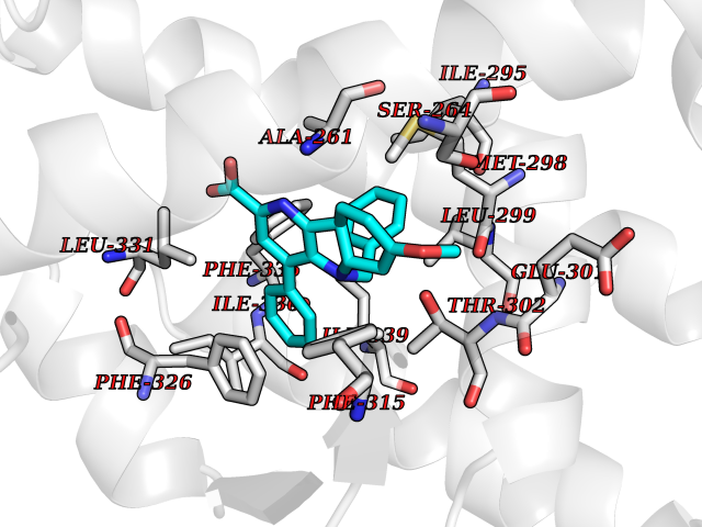 | Target general information Gen name MTNR1A Organism Homo sapiens (Human) Uniprot ID TTD ID Synonyms Mel1a receptor; Mel1AR; Mel-1A-R Protein family G-protein coupled receptor 1 family Biochemical class GPCR rhodopsin Function Likely to mediate the reproductive and circadian actions of melatonin. The activity of this receptor is mediated by pertussis toxin sensitive G proteins that inhibit adenylate cyclase activity. High affinity receptor for melatonin. Related diseases Spermatogenic failure 5 (SPGF5) [MIM:243060]: An infertility disorder caused by spermatogenesis defects. Semen from affected men show close to 100% morphologically abnormal multiflagellar spermatozoa with low motility, oversized irregular heads, and abnormal midpiece and acrosome. {ECO:0000269|PubMed:17435757, ECO:0000269|PubMed:21733974}. The disease is caused by variants affecting the gene represented in this entry. Drugs (DrugBank ID) DB06594; DB01065; DB00980; DB02709; DB09071 Interacts with P27797; A8MQ03; Q8IUG1; P49286; O76081; P57088 EC number NA Uniprot keywords 3D-structure; Cell membrane; Disulfide bond; G-protein coupled receptor; Glycoprotein; Membrane; Receptor; Reference proteome; Transducer; Transmembrane; Transmembrane helix Protein physicochemical properties Chain ID D Molecular weight (Da) 31301 Length 276 Aromaticity 0.15 Instability index 37.33 Isoelectric point 9.22 Charge (pH=7) 9.92 3D Binding mode Sequence RPSWLASALACVLIFTIVVDILGNLLVILSVYRNKKLRNAGNIFVVSLAVADLVVAIYPYPLVLMSIFNNGWNLGYLHCQVSGFLMGLSVIGSIFNITGIAINRYCYICHSLKYDKLYSSKNSLCYVLLIWLLTLAAVLPNLRAGTLQYDPRIYSCTFAQSVSSAYTIAVVVFHFLVPMIIVIFCYLRIWILVLQVRQRVPQDFRNFVTMFVVFVLFAICWAPLNFIGLAVASDPASMVPRIPEWLFVASYYMAYFNSCLNAIIYGLLNQNFRKEY Hydrogen bonds contact Hydrophobic contact | ||||