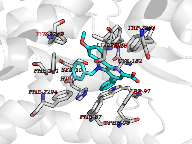 | Target general information Gen name ADRA2A Organism Homo sapiens (Human) Uniprot ID TTD ID Synonyms Alpha-2AAR; Alpha-2A adrenoreceptor; Alpha-2A adrenoceptor; Alpha-2A adrenergic receptor; Alpha-2 adrenergic receptor subtype C10; ADRAR; ADRA2R Protein family G-protein coupled receptor 1 family, Adrenergic receptor subfamily, ADRA2A sub-subfamily Biochemical class GPCR rhodopsin Function The rank order of potency for agonists of this receptor is oxymetazoline > clonidine > epinephrine > norepinephrine > phenylephrine > dopamine > p-synephrine > p-tyramine > serotonin = p-octopamine. For antagonists, the rank order is yohimbine > phentolamine = mianserine > chlorpromazine = spiperone = prazosin > propanolol > alprenolol = pindolol. Alpha-2 adrenergic receptors mediate the catecholamine-induced inhibition of adenylate cyclase through the action of G proteins. Related diseases Lipodystrophy, familial partial, 8 (FPLD8) [MIM:620679]: An autosomal dominant form of partial lipodystrophy, a disorder characterized by abnormal subcutaneous fat distribution. FPLD8 patients show selective loss of subcutaneous adipose tissue from the limbs, beginning around 13 to 15 years of age, and abnormal accumulation of subcutaneous adipose tissue in the dorsal neck and face, as well as in the posterior thoracic and abdominal regions. The disorder is associated with metabolic abnormalities, including diabetes mellitus and hyperlipidemia. {ECO:0000269|PubMed:27376152}. The disease may be caused by variants affecting the gene represented in this entry. Drugs (DrugBank ID) DB01472; DB00321; DB00543; DB00182; DB00714; DB00964; DB09229; DB01238; DB14185; DB06216; DB00865; DB00217; DB00484; DB01200; DB00248; DB01136; DB04846; DB00477; DB09202; DB00575; DB00363; DB01151; DB00633; DB01576; DB11273; DB13345; DB00320; DB00449; DB11278; DB09167; DB04855; DB06262; DB01363; DB05492; DB00751; DB00668; DB01049; DB00696; DB01175; DB06678; DB09194; DB00800; DB06623; DB00629; DB01018; DB00502; DB11577; DB00555; DB06707; DB00589; DB04948; DB09195; DB00408; DB08815; DB00934; DB01365; DB01577; DB01403; DB00968; DB06148; DB00370; DB09205; DB09242; DB06711; DB01149; DB00368; DB00540; DB06229; DB00935; DB01267; DB00715; DB01186; DB01608; DB00925; DB00692; DB00397; DB09286; DB09244; DB06153; DB00413; DB00457; DB00433; DB01069; DB00852; DB01224; DB11124; DB11738; DB00268; DB09304; DB06764; DB13025; DB00697; DB00797; DB00193; DB00656; DB00726; DB11477; DB06694; DB01392; DB00246; DB01624 Interacts with NA EC number NA Uniprot keywords 3D-structure; Cell membrane; Direct protein sequencing; Disulfide bond; G-protein coupled receptor; Glycoprotein; Lipoprotein; Membrane; Methylation; Palmitate; Phosphoprotein; Proteomics identification; Receptor; Reference proteome; Transducer; Transmembrane; Transmembrane helix Protein physicochemical properties Chain ID R Molecular weight (Da) 30303.9 Length 263 Aromaticity 0.16 Instability index 35.08 Isoelectric point 9.66 Charge (pH=7) 16.82 3D Binding mode Sequence YSLQVTLTLVCLAGLLMLLTVFGNVLVIIAVFTSRALKAPQNLFLVSLASADILVATLVIPFSLANEVMGYWYFGKAWCEIYLALDVLFCTSSIVHLCAISLDRYWSITQAIEYNLKRTPRRIKAIIITVWVISAVISFPPRCEINDQKWYVISSCIGSFFAPCLIMILVYVRIYQIAKRRTRRGRQNREKRFTFVLAVVIGVFVVCWFPFFFTYTLTAVGCSVPRTLFKFFFWFGYCNSSLNPVIYTIFNHDFRRAFKKILC Hydrogen bonds contact Hydrophobic contact | ||||