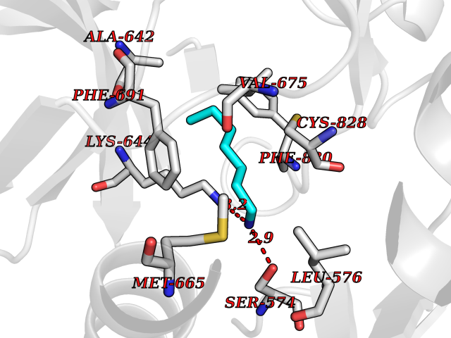 Target general information Gen name FLT3 Organism Homo sapiens (Human) Uniprot ID TTD ID Synonyms Stem cell tyrosine kinase 1; STK1; STK-1; Receptor-type tyrosine-protein kinase FLT3; Fetal liver kinase-2; FLT-3; FLK2; FLK-2; FL cytokine receptor; CD135 Protein family Protein kinase superfamily, Tyr protein kinase family, CSF-1/PDGF receptor subfamily Biochemical class Kinase Function Tyrosine-protein kinase that acts as cell-surface receptor for the cytokine FLT3LG and regulates differentiation, proliferation and survival of hematopoietic progenitor cells and of dendritic cells. Promotes phosphorylation of SHC1 and AKT1, and activation of the downstream effector MTOR. Promotes activation of RAS signaling and phosphorylation of downstream kinases, including MAPK1/ERK2 and/or MAPK3/ERK1. Promotes phosphorylation of FES, FER, PTPN6/SHP, PTPN11/SHP-2, PLCG1, and STAT5A and/or STAT5B. Activation of wild-type FLT3 causes only marginal activation of STAT5A or STAT5B. Mutations that cause constitutive kinase activity promote cell proliferation and resistance to apoptosis via the activation of multiple signaling pathways. Related diseases Leukemia, acute myelogenous (AML) [MIM:601626]: A subtype of acute leukemia, a cancer of the white blood cells. AML is a malignant disease of bone marrow characterized by maturational arrest of hematopoietic precursors at an early stage of development. Clonal expansion of myeloid blasts occurs in bone marrow, blood, and other tissue. Myelogenous leukemias develop from changes in cells that normally produce neutrophils, basophils, eosinophils and monocytes. {ECO:0000269|PubMed:11090077, ECO:0000269|PubMed:11290608, ECO:0000269|PubMed:11442493, ECO:0000269|PubMed:14504097, ECO:0000269|PubMed:16266983, ECO:0000269|PubMed:18305215, ECO:0000269|PubMed:8946930, ECO:0000269|PubMed:9737679}. The gene represented in this entry may be involved in disease pathogenesis. Somatic mutations that lead to constitutive activation of FLT3 are frequent in AML patients. These mutations fall into two classes, the most common being in-frame internal tandem duplications of variable length in the juxtamembrane region that disrupt the normal regulation of the kinase activity. Likewise, point mutations in the activation loop of the kinase domain can result in a constitutively activated kinase. Drugs (DrugBank ID) DB12742; DB12267; DB12500; DB12010; DB12141; DB06469; DB06080; DB06595; DB11763; DB09079; DB11697; DB12978; DB08901; DB15822; DB12874; DB00398; DB01268; DB05465; DB11800; DB05014 Interacts with P00519; P42684; P46108; P46109; P06241; Q13322; Q9Y6K9; P06239; P27986; P20936; P43405; Q8R4L0 EC number EC 2.7.10.1 Uniprot keywords 3D-structure; Alternative splicing; ATP-binding; Disease variant; Disulfide bond; Endoplasmic reticulum; Glycoprotein; Host-virus interaction; Immunoglobulin domain; Kinase; Membrane; Nucleotide-binding; Phosphoprotein; Proteomics identification; Proto-oncogene; Receptor; Reference proteome; Signal; Transferase; Transmembrane; Transmembrane helix; Tyrosine-protein kinase; Ubl conjugation Protein physicochemical properties Chain ID A Molecular weight (Da) 34209.2 Length 298 Aromaticity 0.14 Instability index 39.68 Isoelectric point 5.57 Charge (pH=7) -4.02 3D Binding mode Sequence YESQLQMVQVTGSSDNEYFYVDFREYEYDLKWEFPRENLEFGKVLGSGAFGKVMNATAYGISKTGVSIQVAVKMLKEREALMSELKMMTQLGSHENIVNLLGACTLSGPIYLIFEYCCYGDLLNYLRSKREKFLTFEDLLCFAYQVAKGMEFLEFKSCVHRDLAARNVLVTHGKVVKICDFGLARDIMSDSNYVVRGNARLPVKWMAPESLFEGIYTIKSDVWSYGILLWEIFSLGVNPYPGIPVDANFYKLIQNGFKMDQPFYATEEIYIIMQSCWAFDSRKRPSFPNLTSFLGCQL Hydrogen bonds contact Hydrophobic contact | ||||